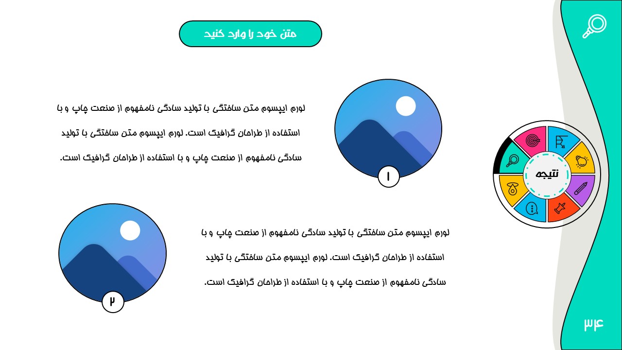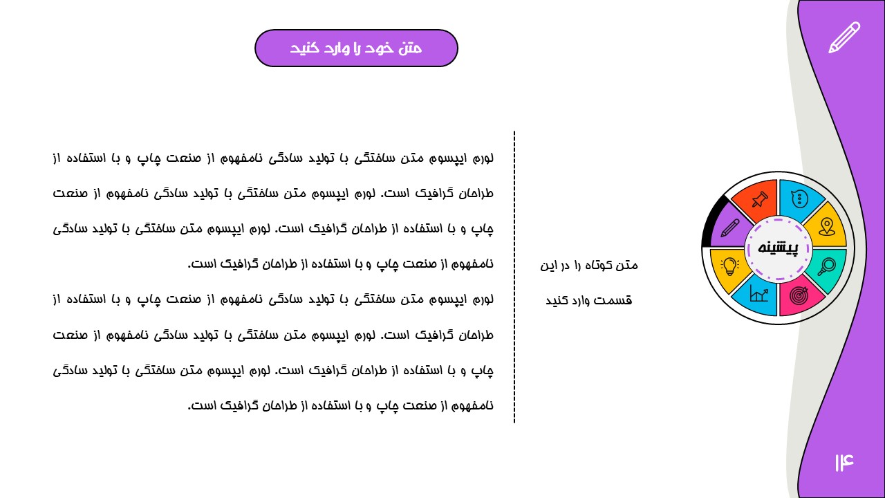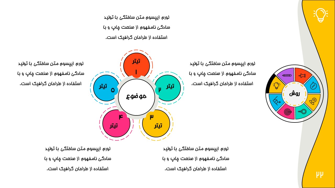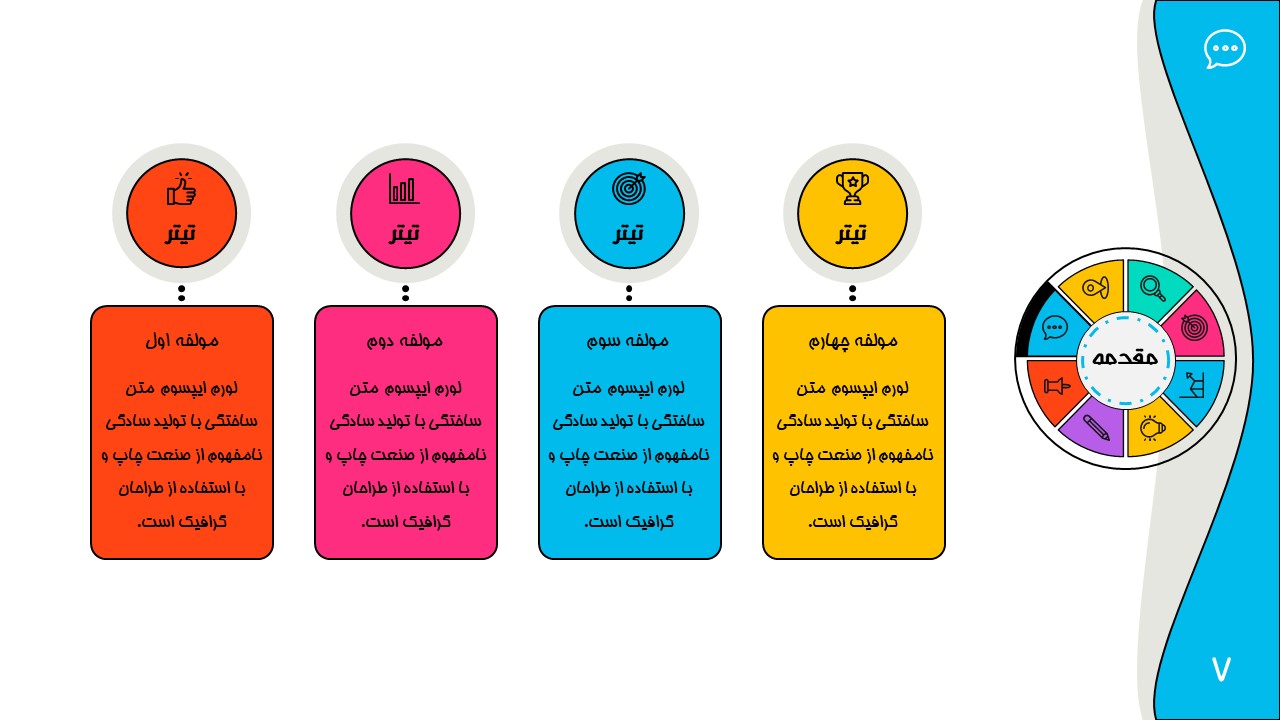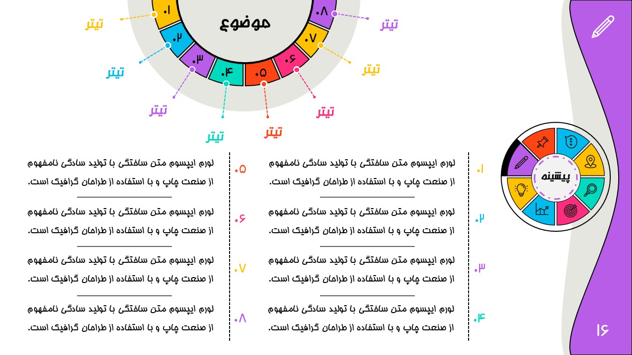 هر بخش این تم دو اسلاید اینفوگرافیک مختلف دارد که هرکدام ویژگی های خاص خود را دارند. همچنین منوی رنگی دایره ای به زیباتر بودن این قالب اضافه میکند. در این قالب حرفه ای میتوانید هر ویرایشی خواستید اعمال کنید.