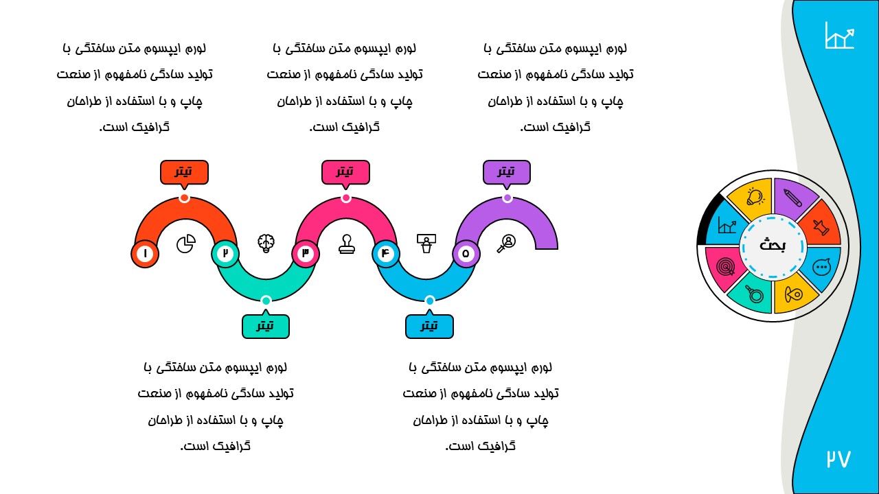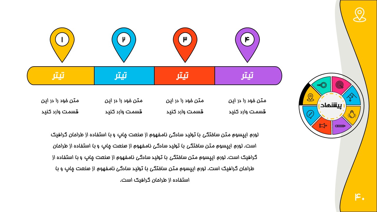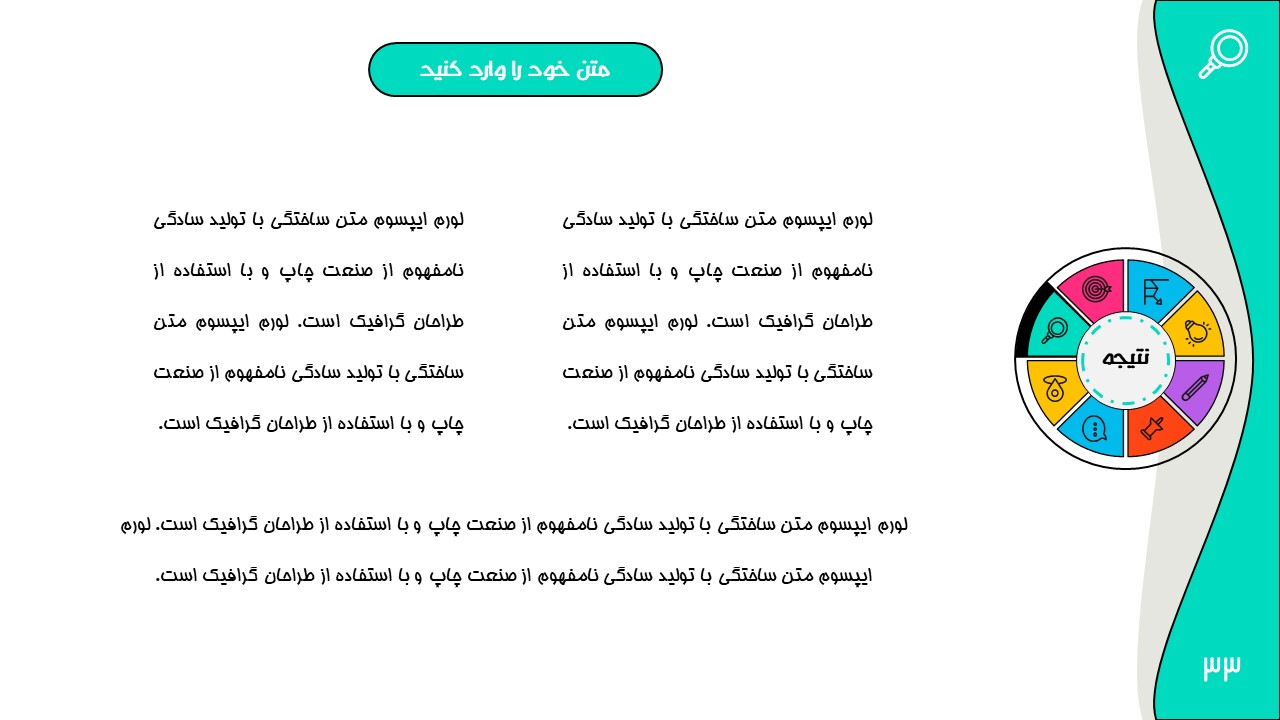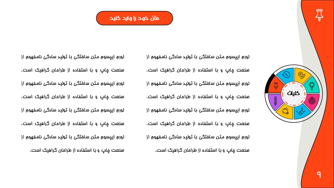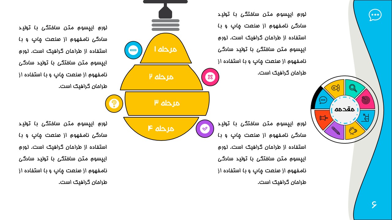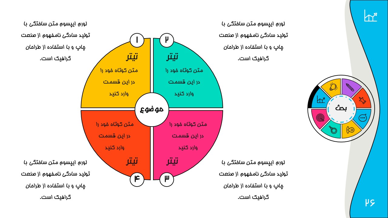 هر بخش این تم دو اسلاید اینفوگرافیک مختلف دارد که هرکدام ویژگی های خاص خود را دارند. همچنین منوی رنگی دایره ای به زیباتر بودن این قالب اضافه میکند. در این قالب حرفه ای میتوانید هر ویرایشی خواستید اعمال کنید.