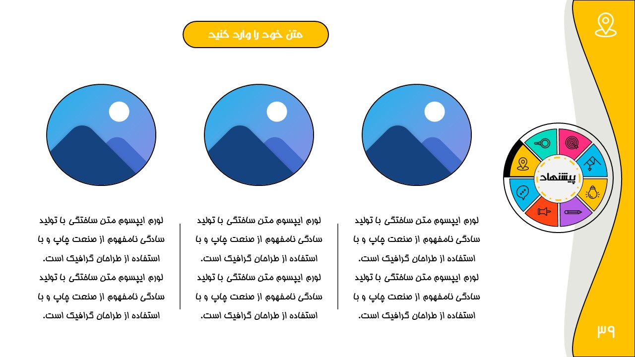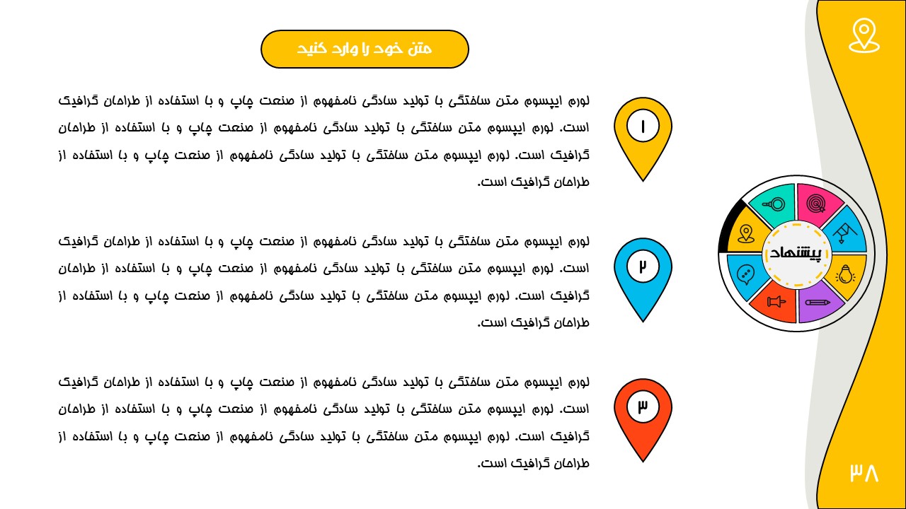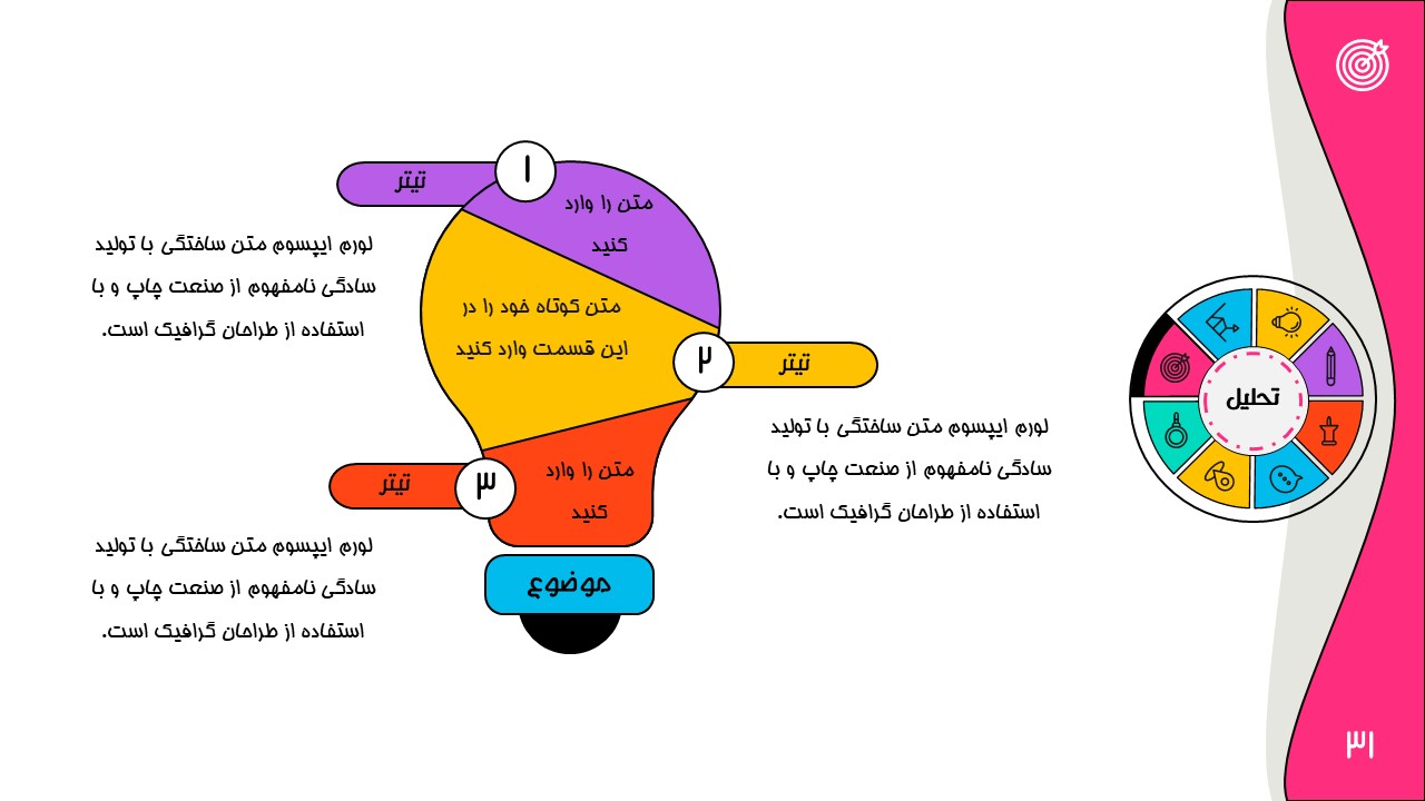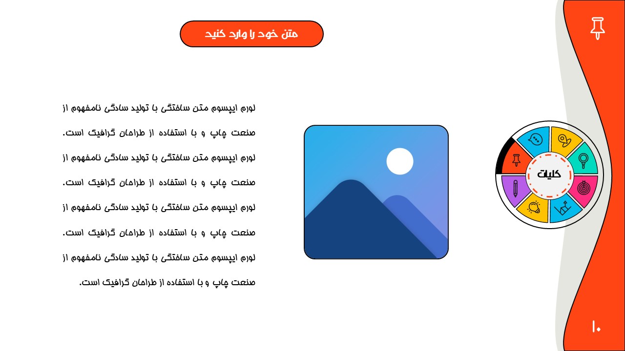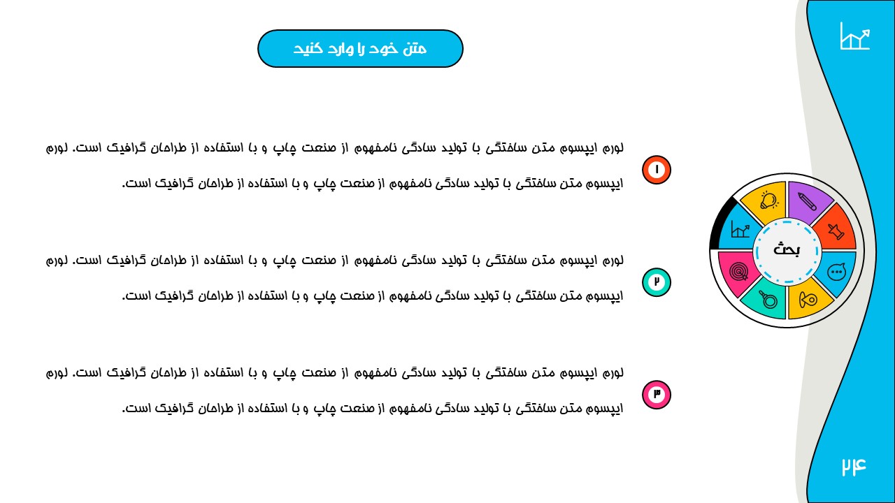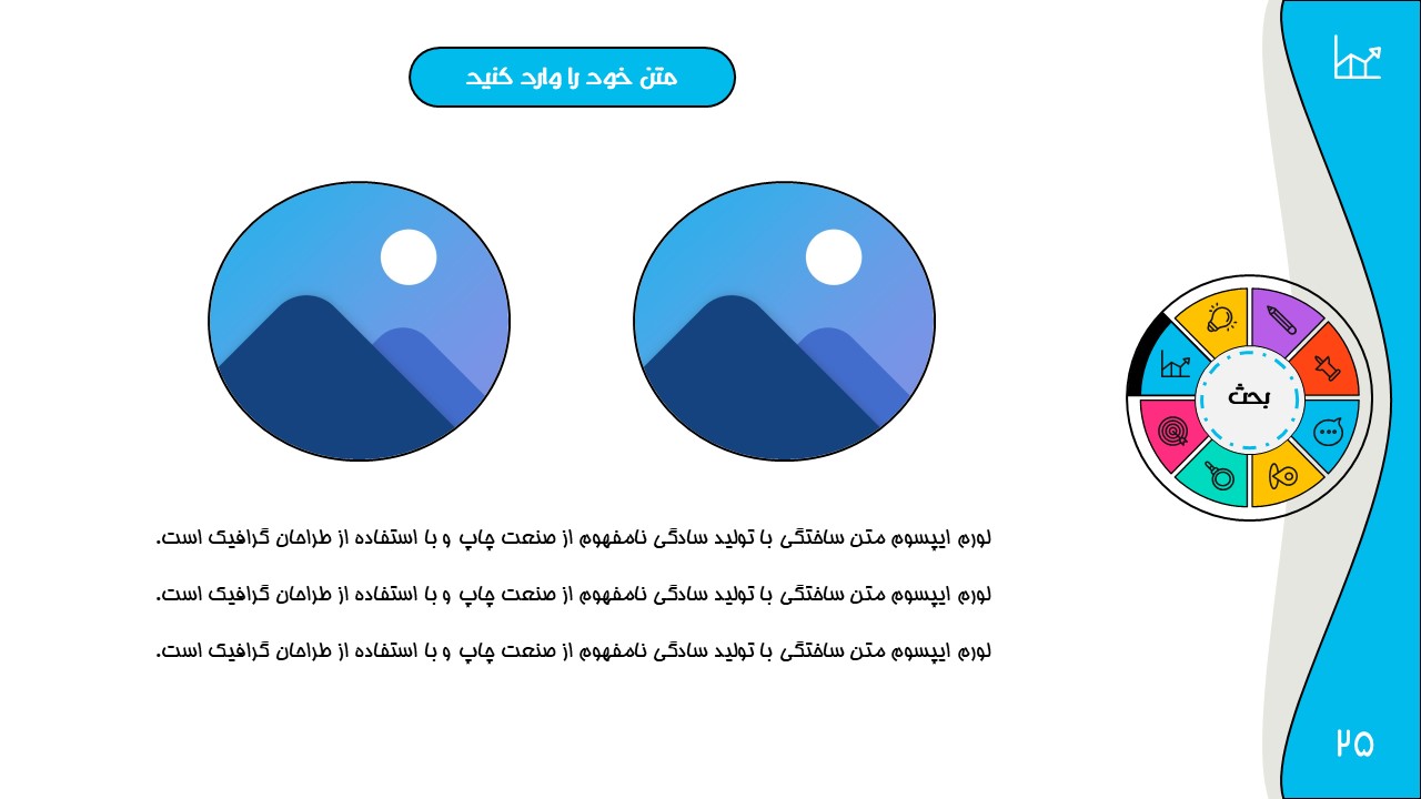 هر بخش این تم دو اسلاید اینفوگرافیک مختلف دارد که هرکدام ویژگی های خاص خود را دارند. همچنین منوی رنگی دایره ای به زیباتر بودن این قالب اضافه میکند. در این قالب حرفه ای میتوانید هر ویرایشی خواستید اعمال کنید.