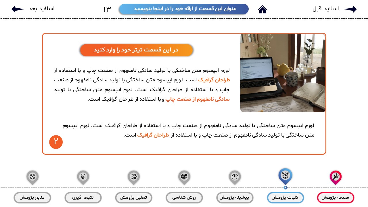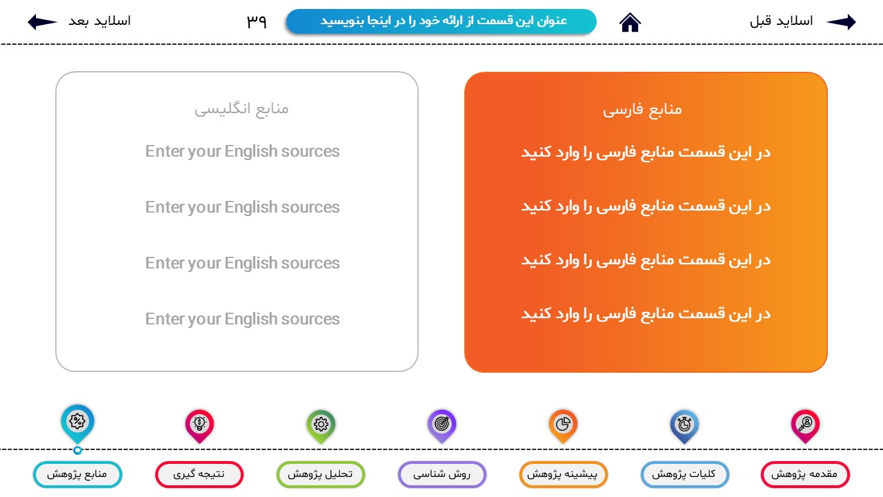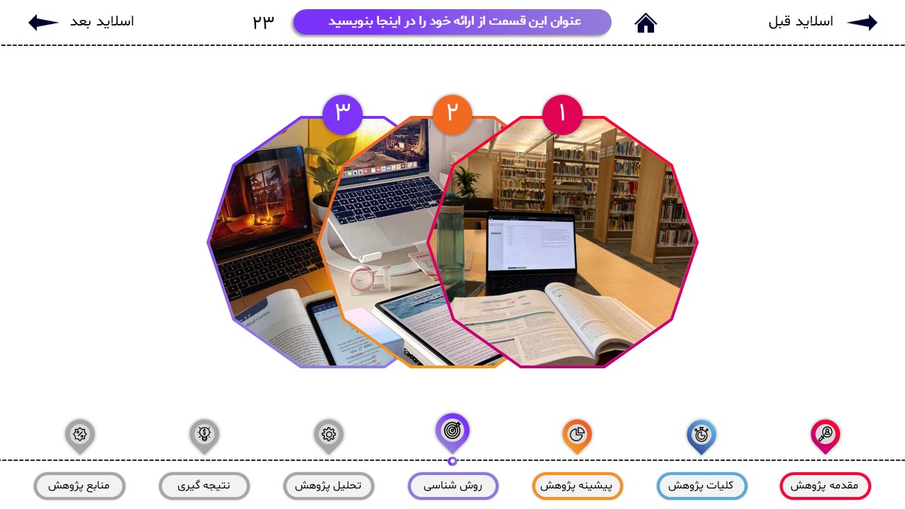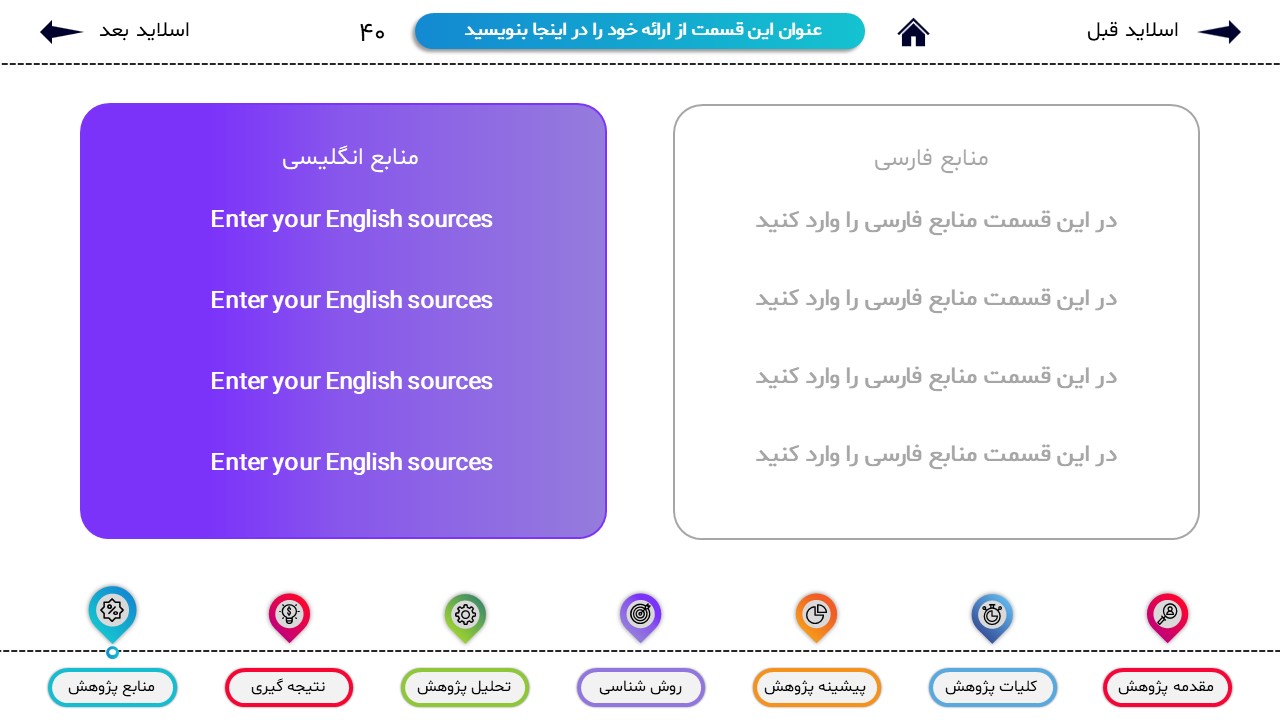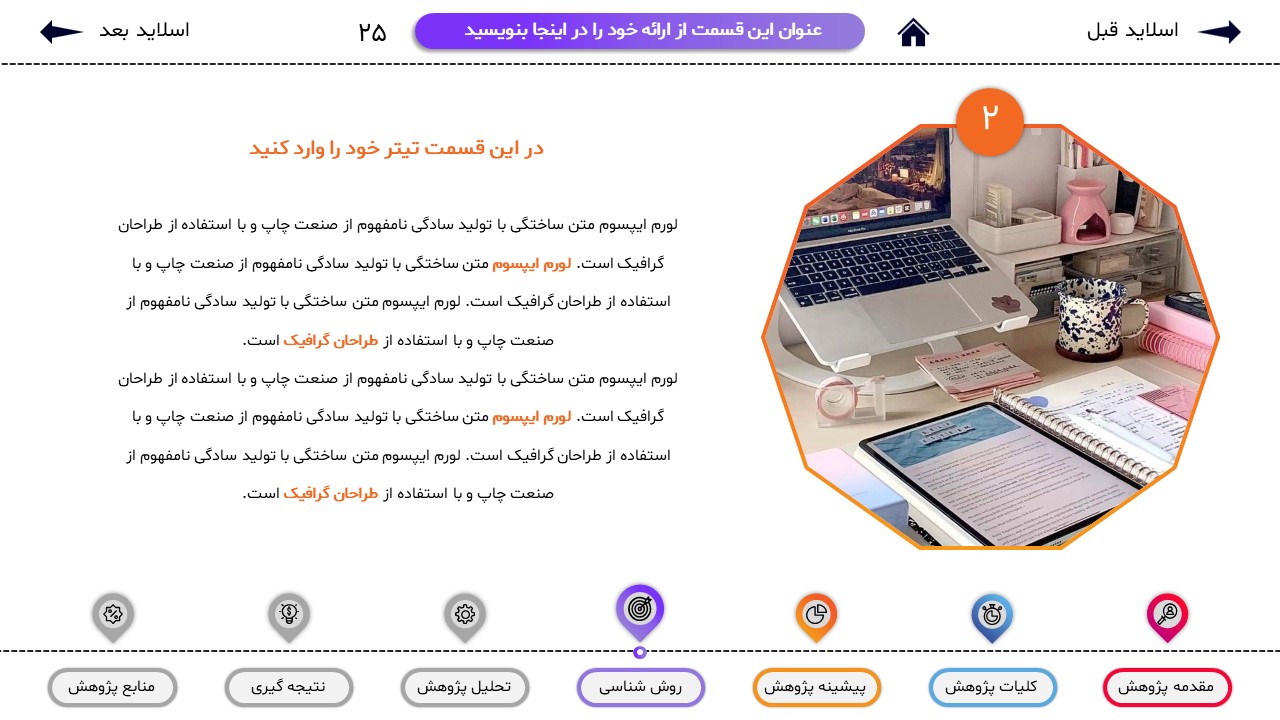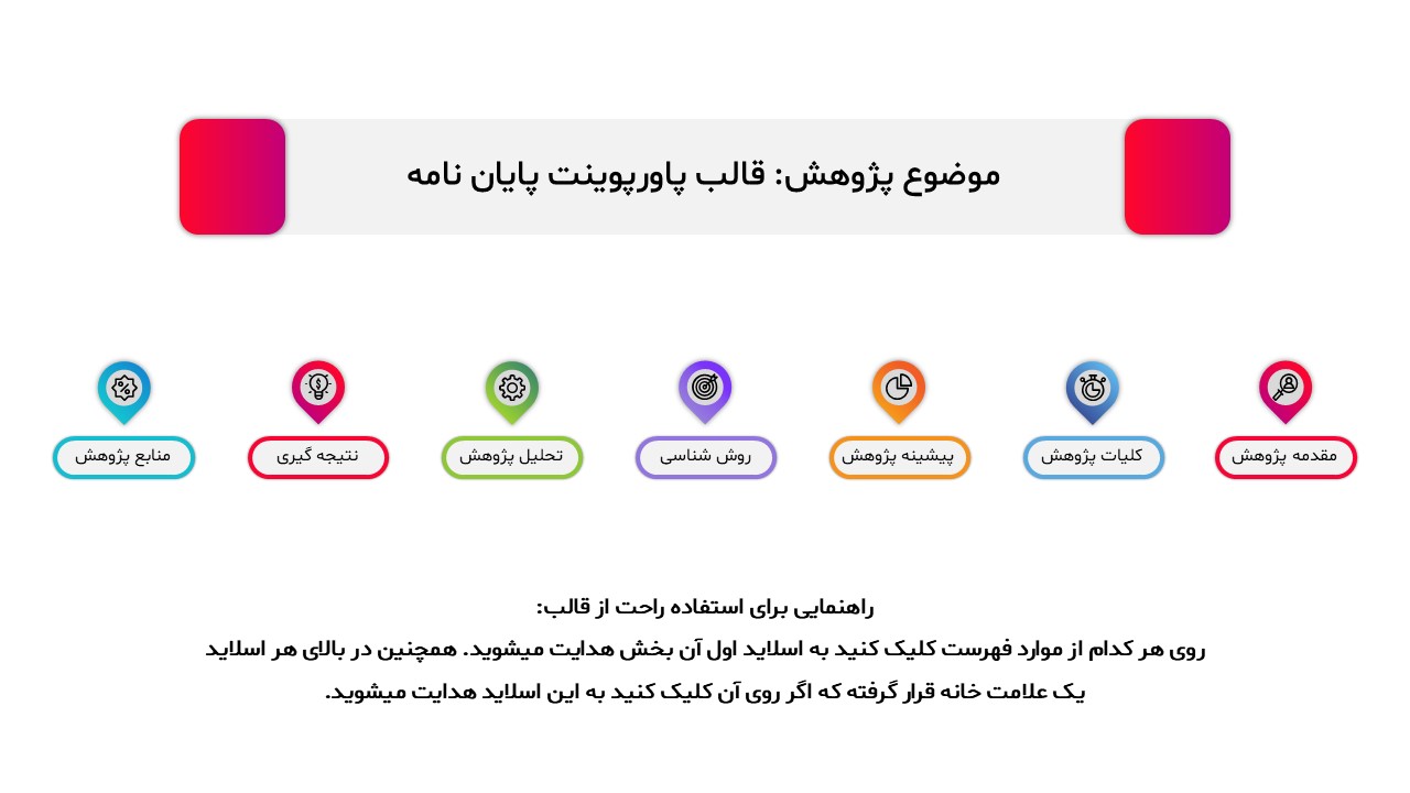 مناسب برای انواع ارائههای پایان نامه: با توجه به نوع طراحی این قالب، میتوانید از آن برای انواع ارائه های پایان نامه و پروپوزال و دانشگاهی خود استفاده کنید.