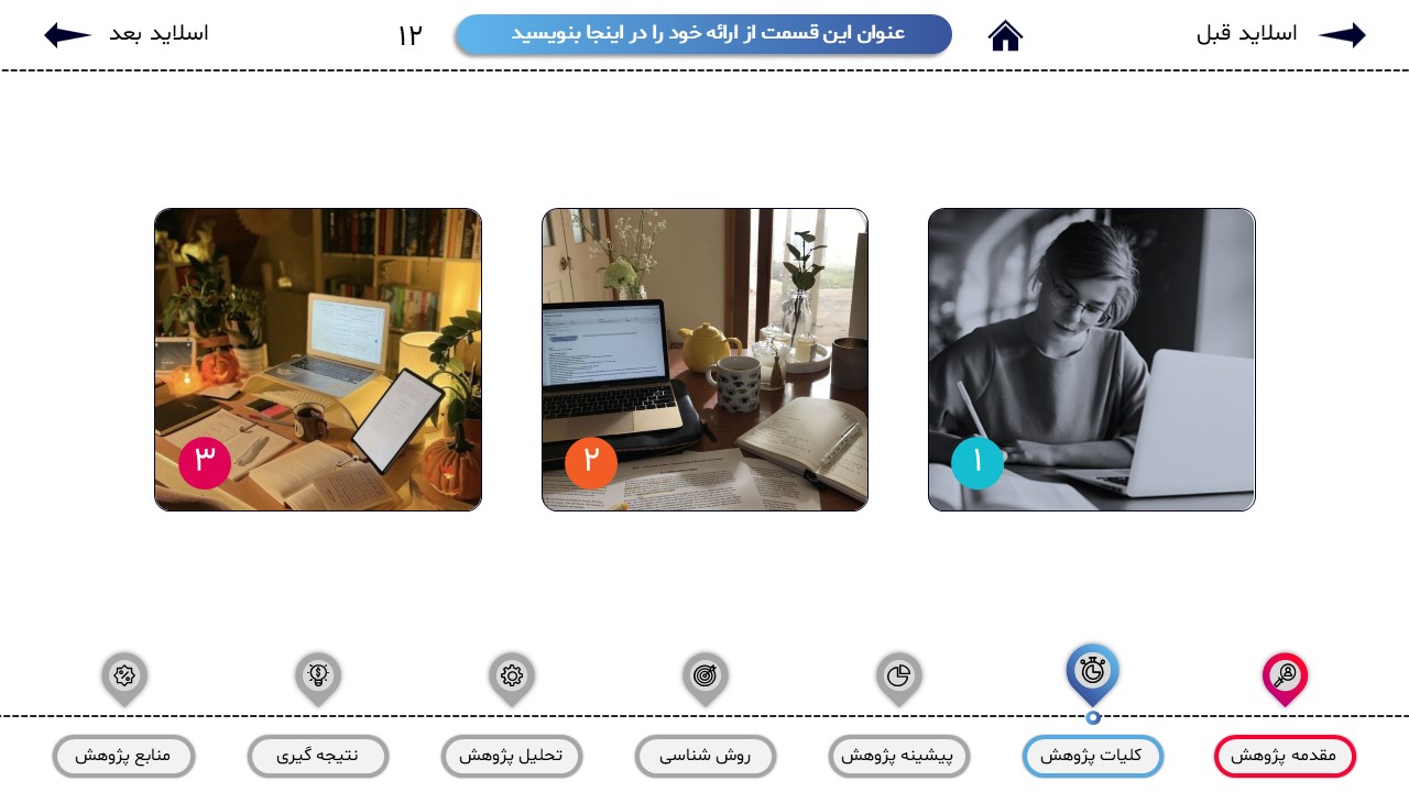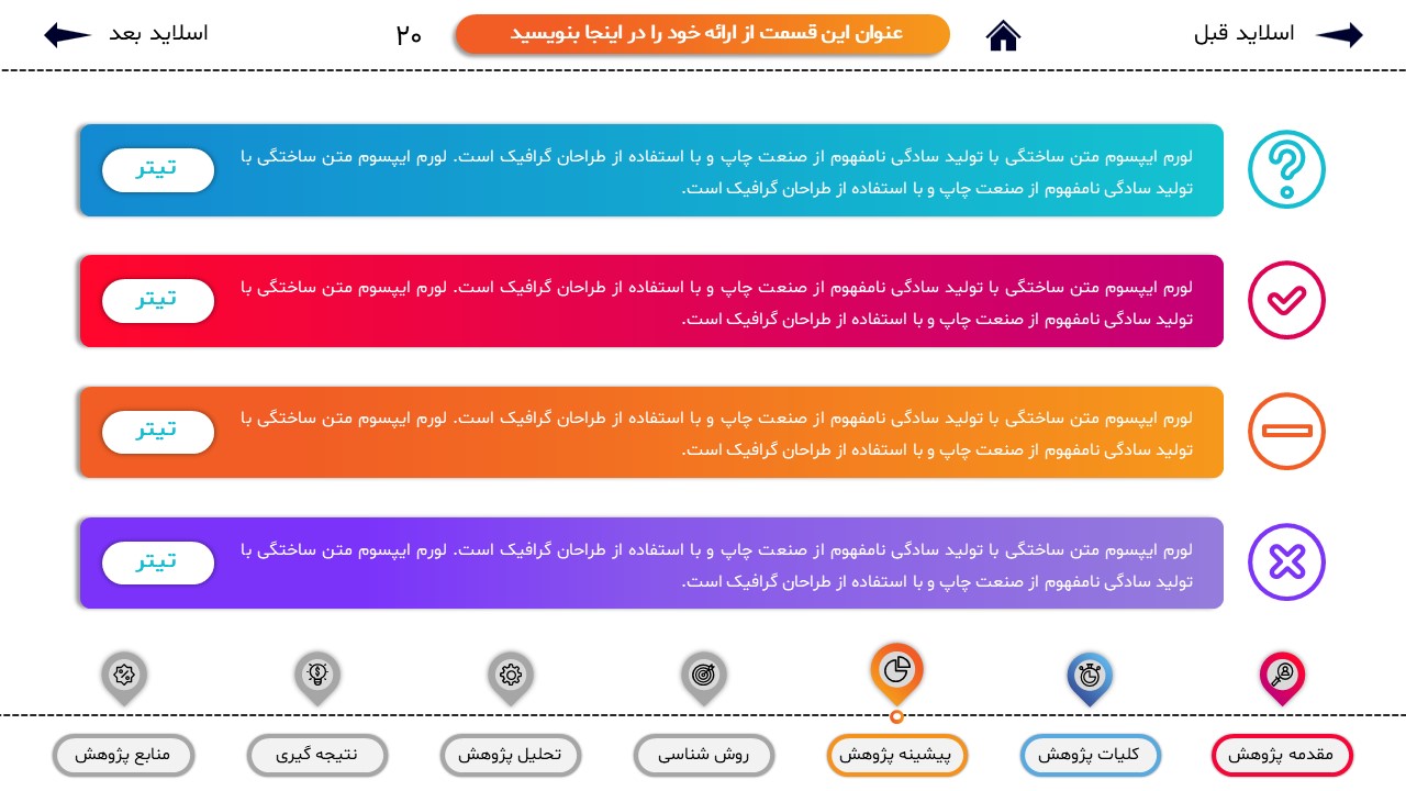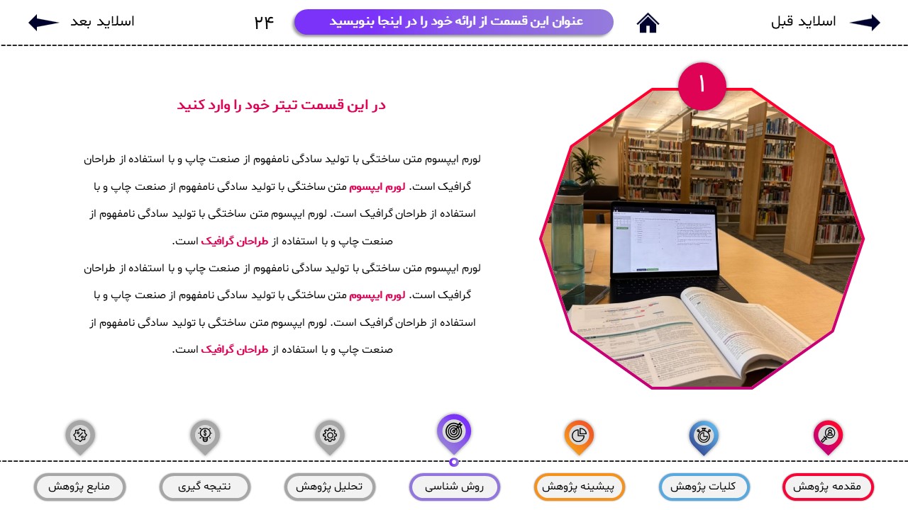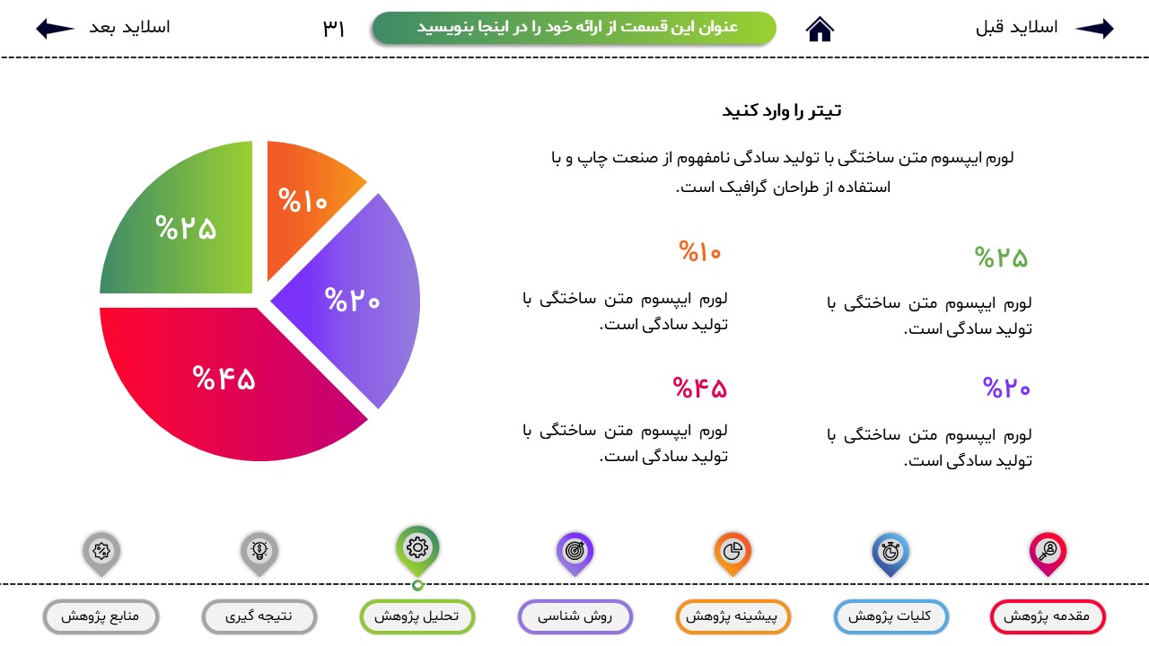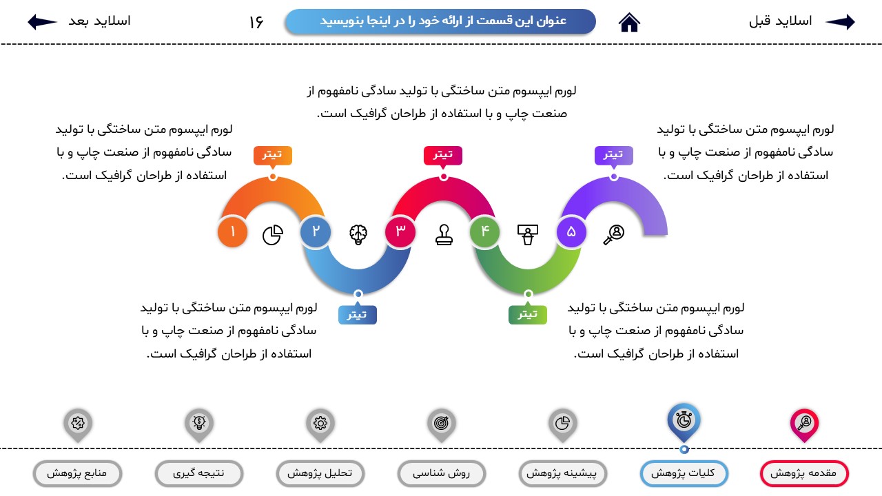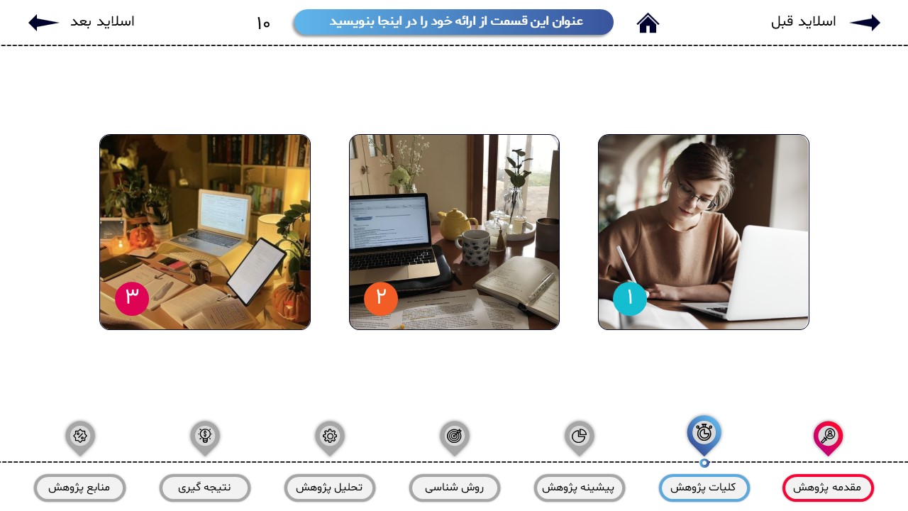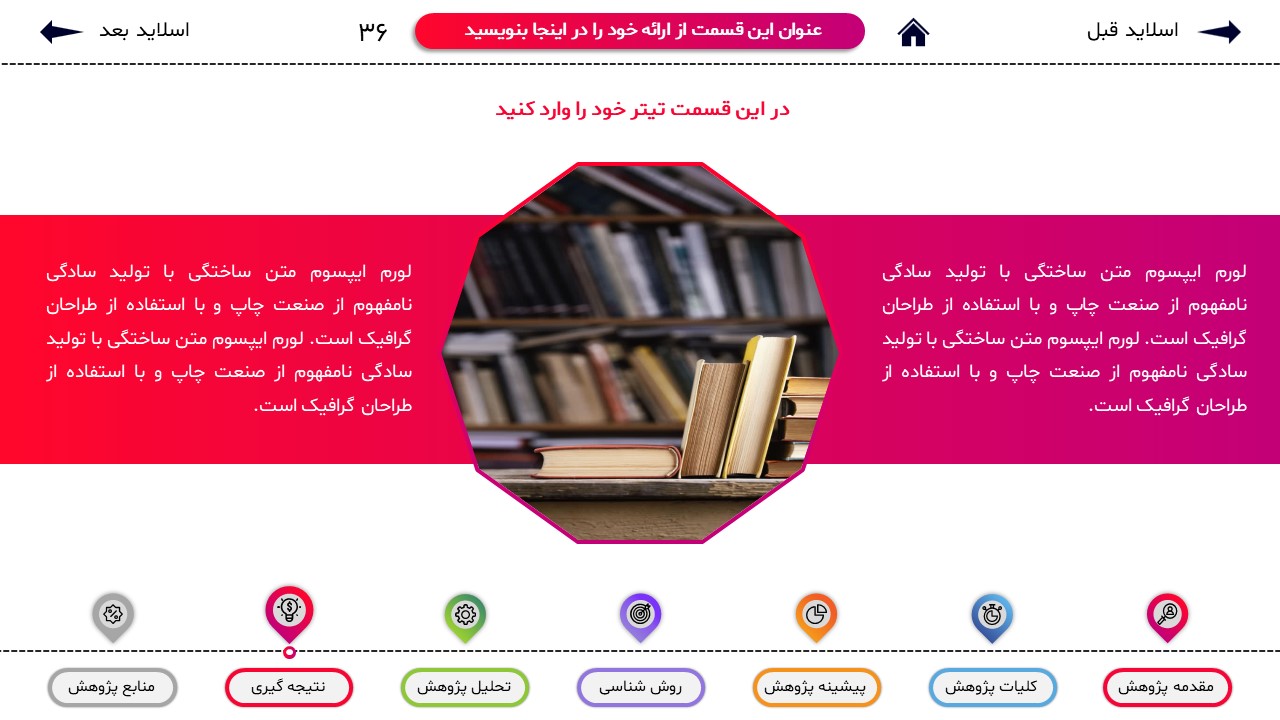 مناسب برای انواع ارائههای پایان نامه: با توجه به نوع طراحی این قالب، میتوانید از آن برای انواع ارائه های پایان نامه و پروپوزال و دانشگاهی خود استفاده کنید.