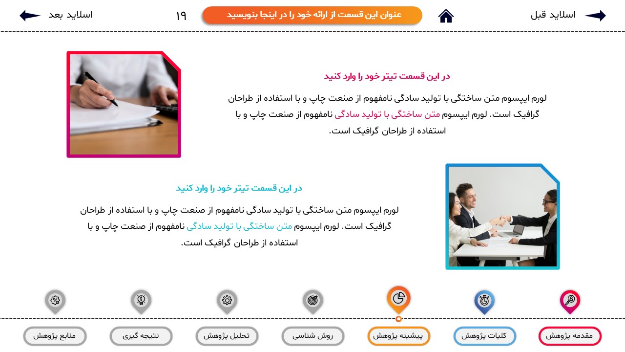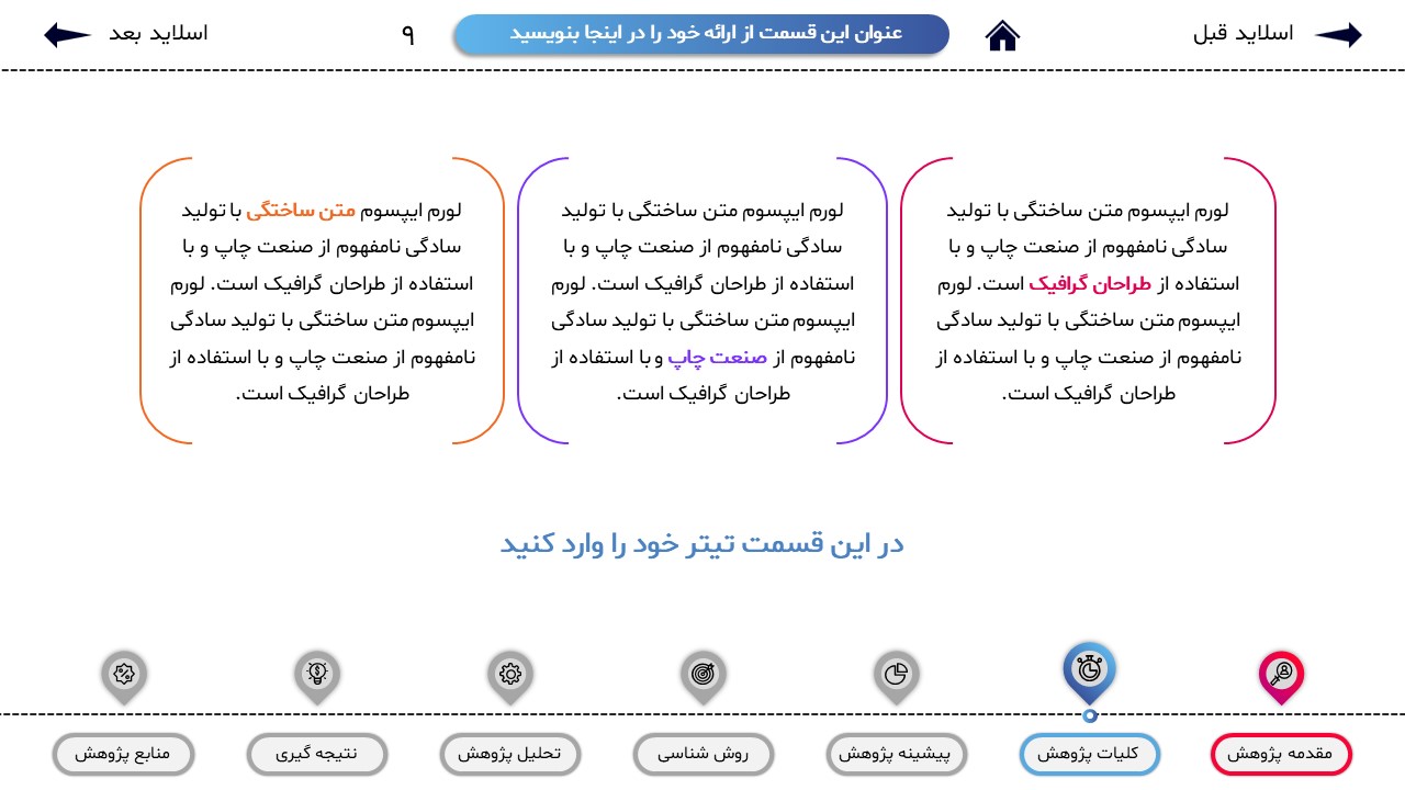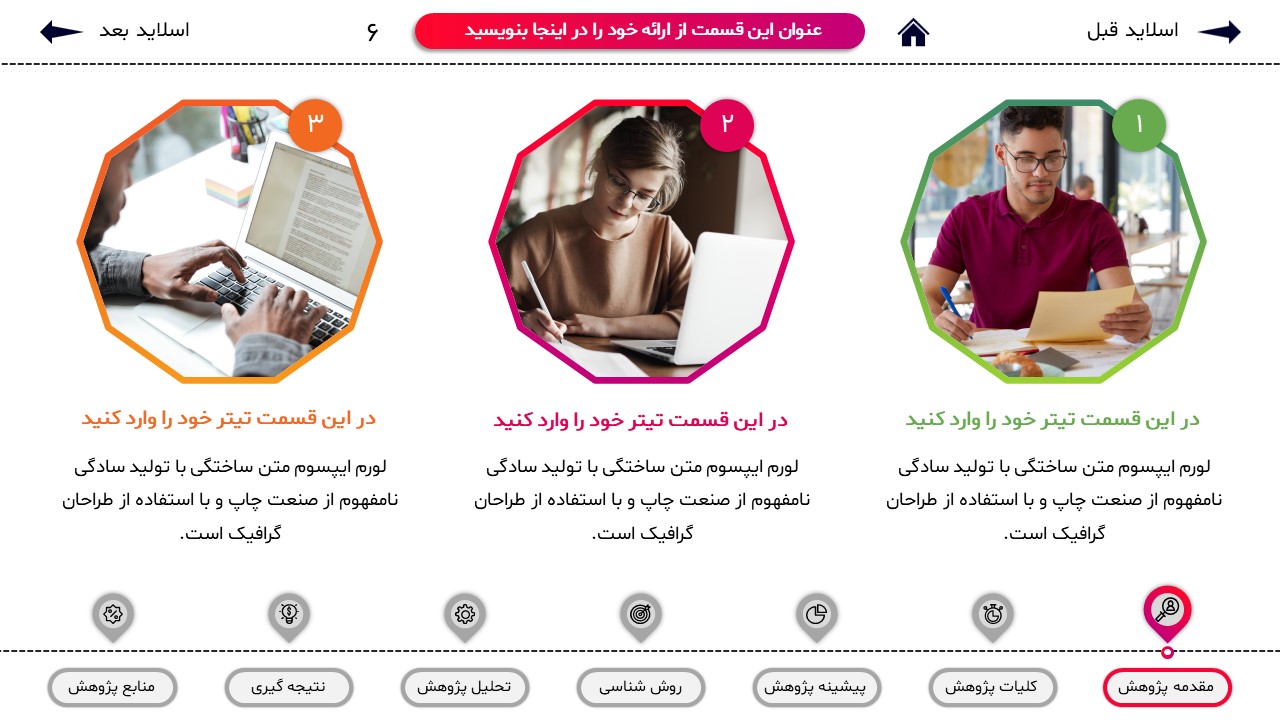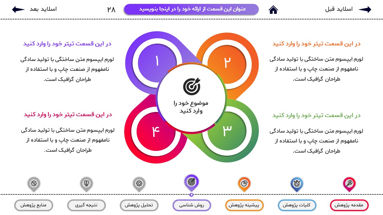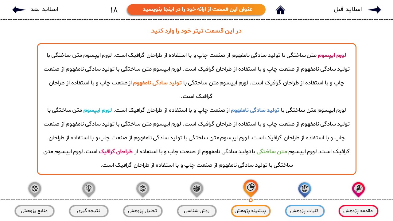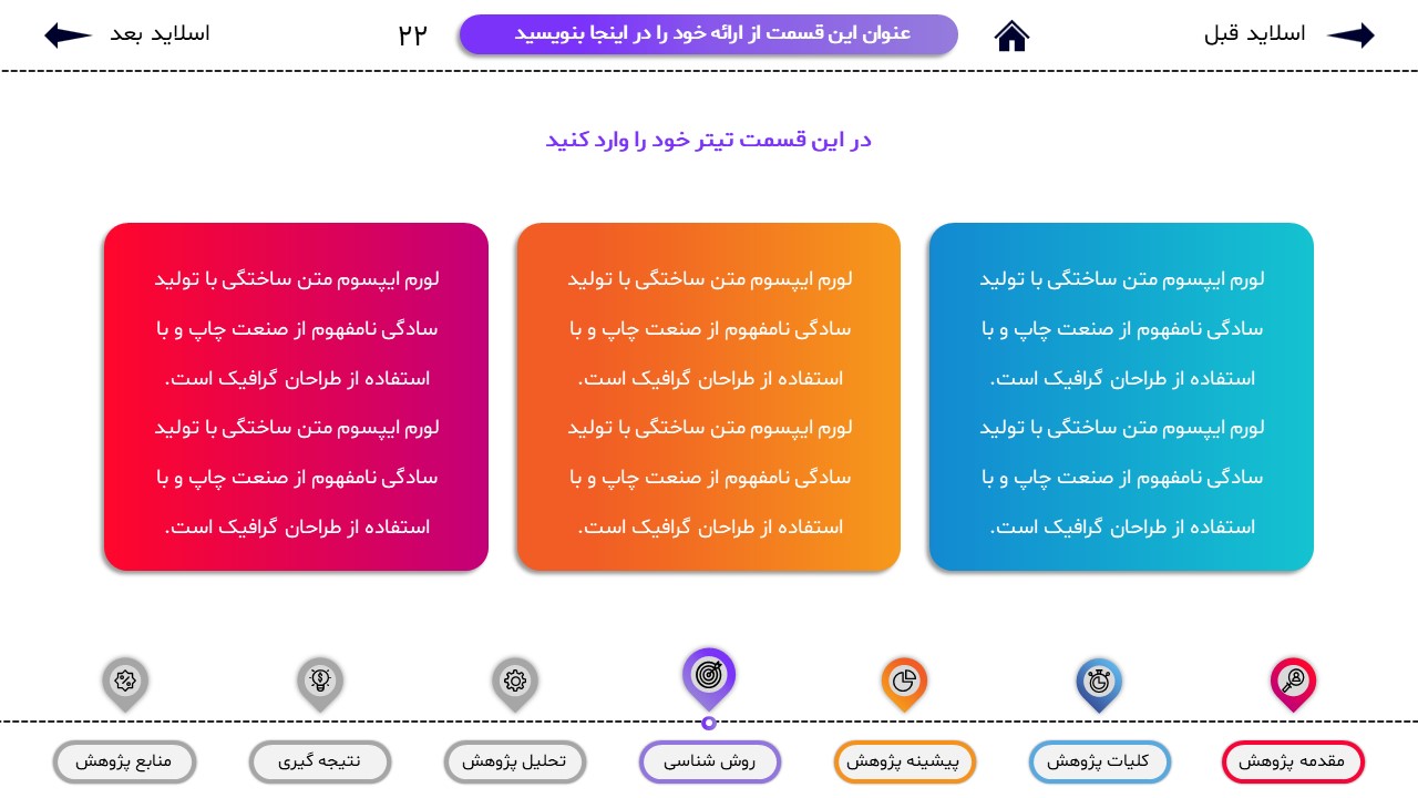 مناسب برای انواع ارائههای پایان نامه: با توجه به نوع طراحی این قالب، میتوانید از آن برای انواع ارائه های پایان نامه و پروپوزال و دانشگاهی خود استفاده کنید.