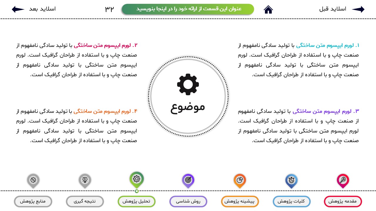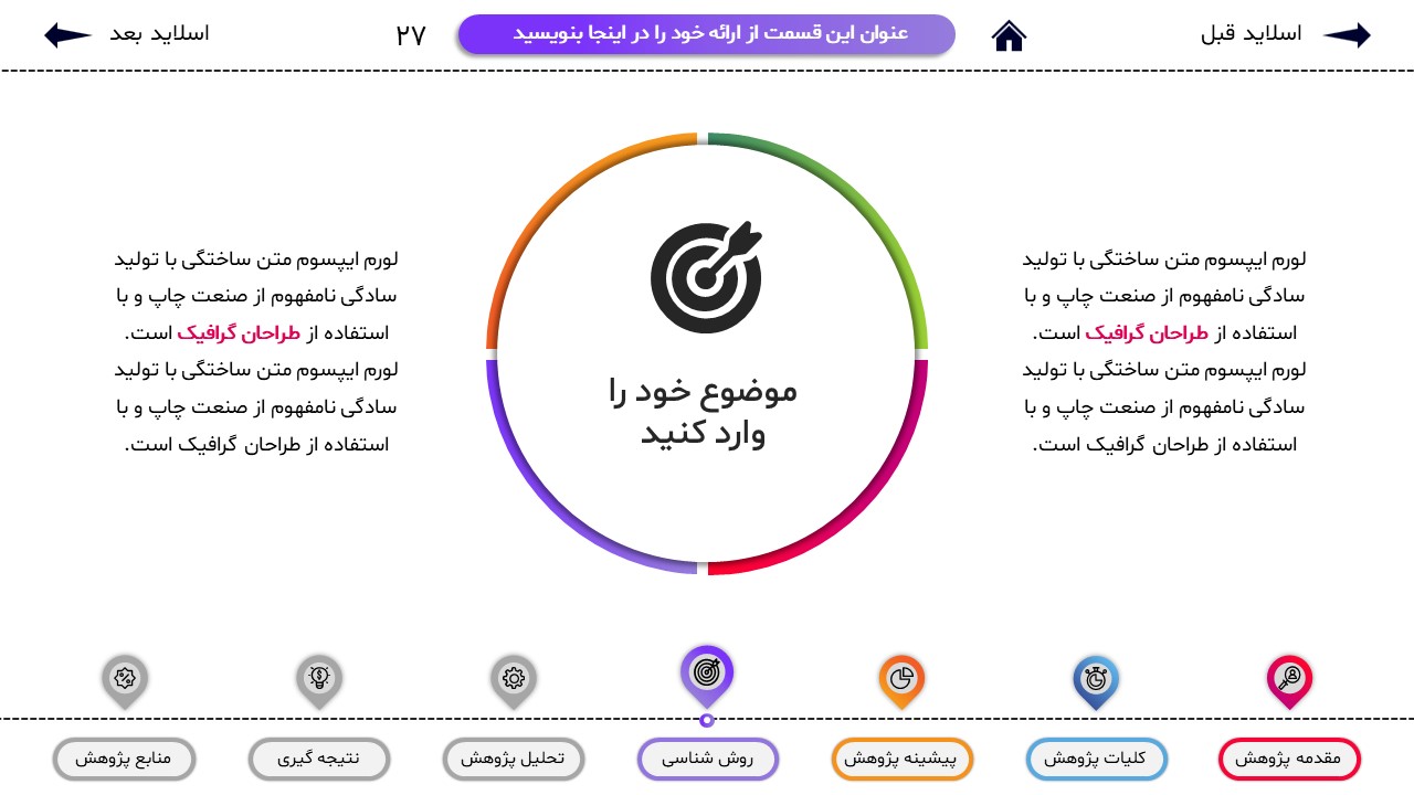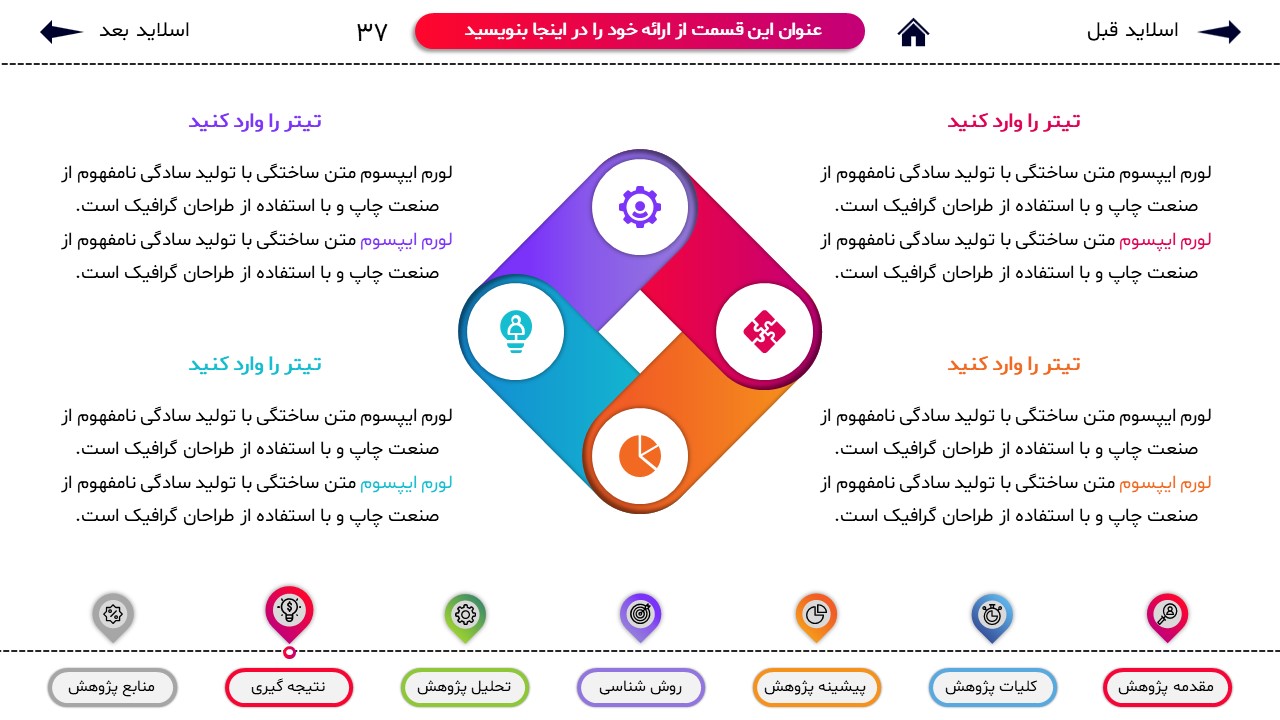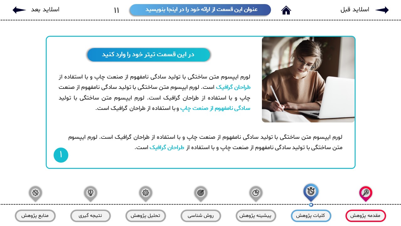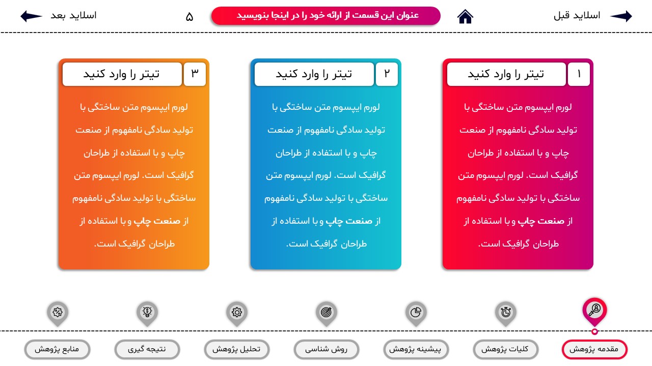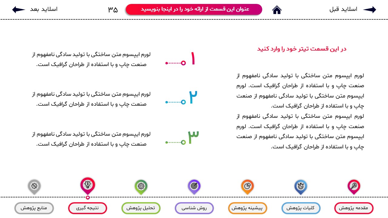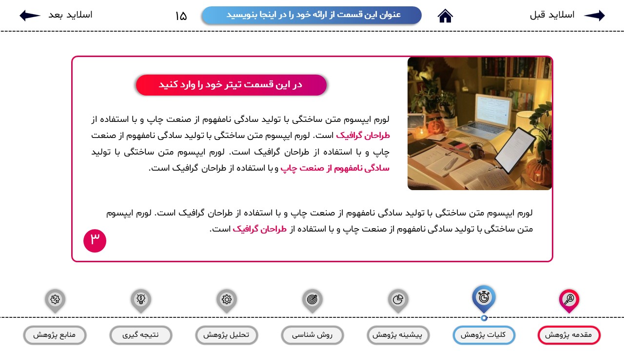 مناسب برای انواع ارائههای پایان نامه: با توجه به نوع طراحی این قالب، میتوانید از آن برای انواع ارائه های پایان نامه و پروپوزال و دانشگاهی خود استفاده کنید.