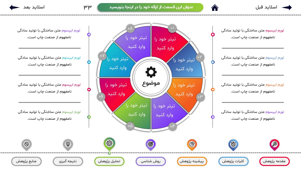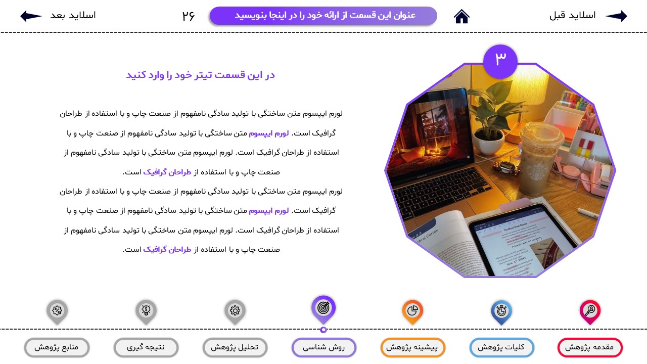 اگر ارائه ی دانشگاهی یا پایان نامه و دکتری دارید براحتی میتوانید از این قالب استفاده کنید. این قالب کاملا قابل ویرایش است که میتوانید آن را شخصی سازی کنید و بهترین ارائه را داشته باشید.