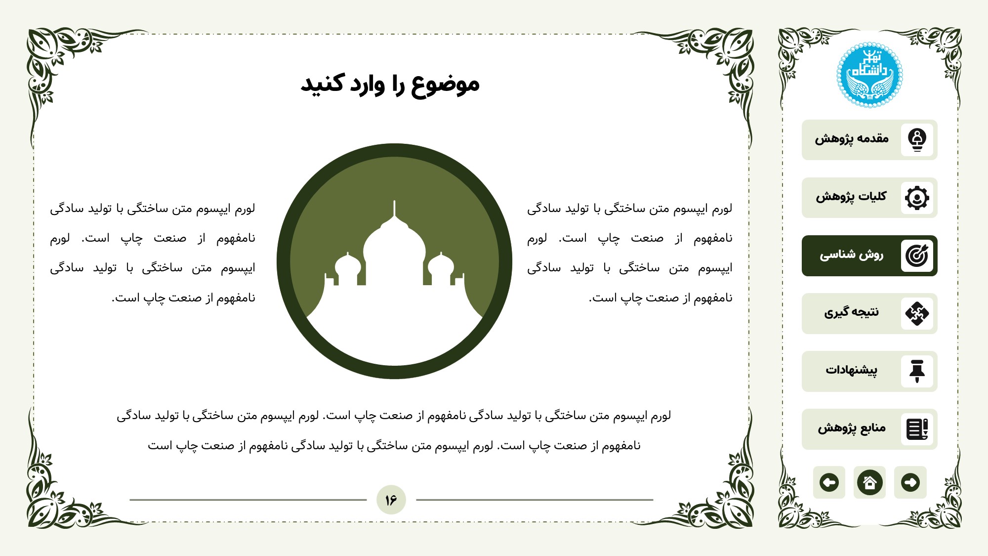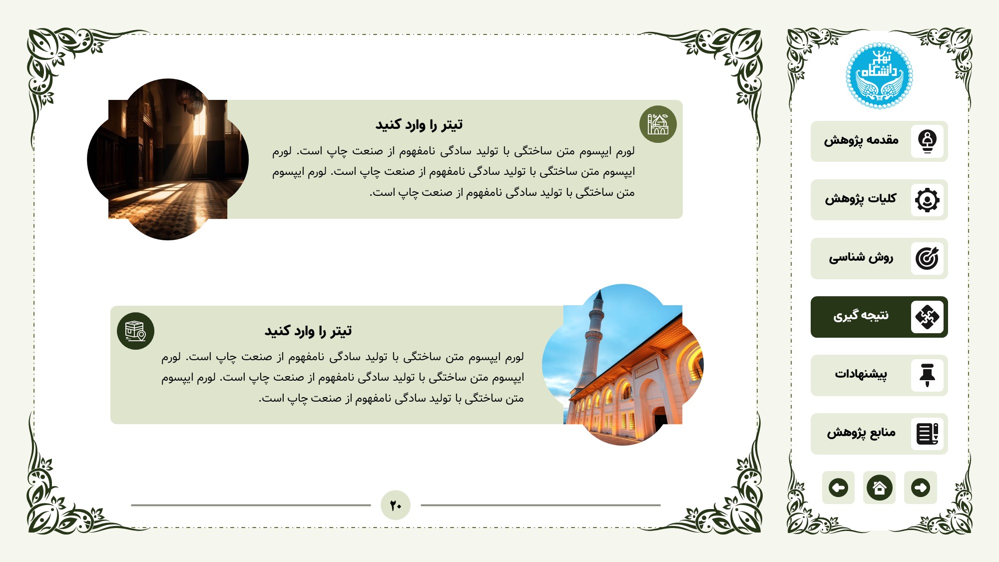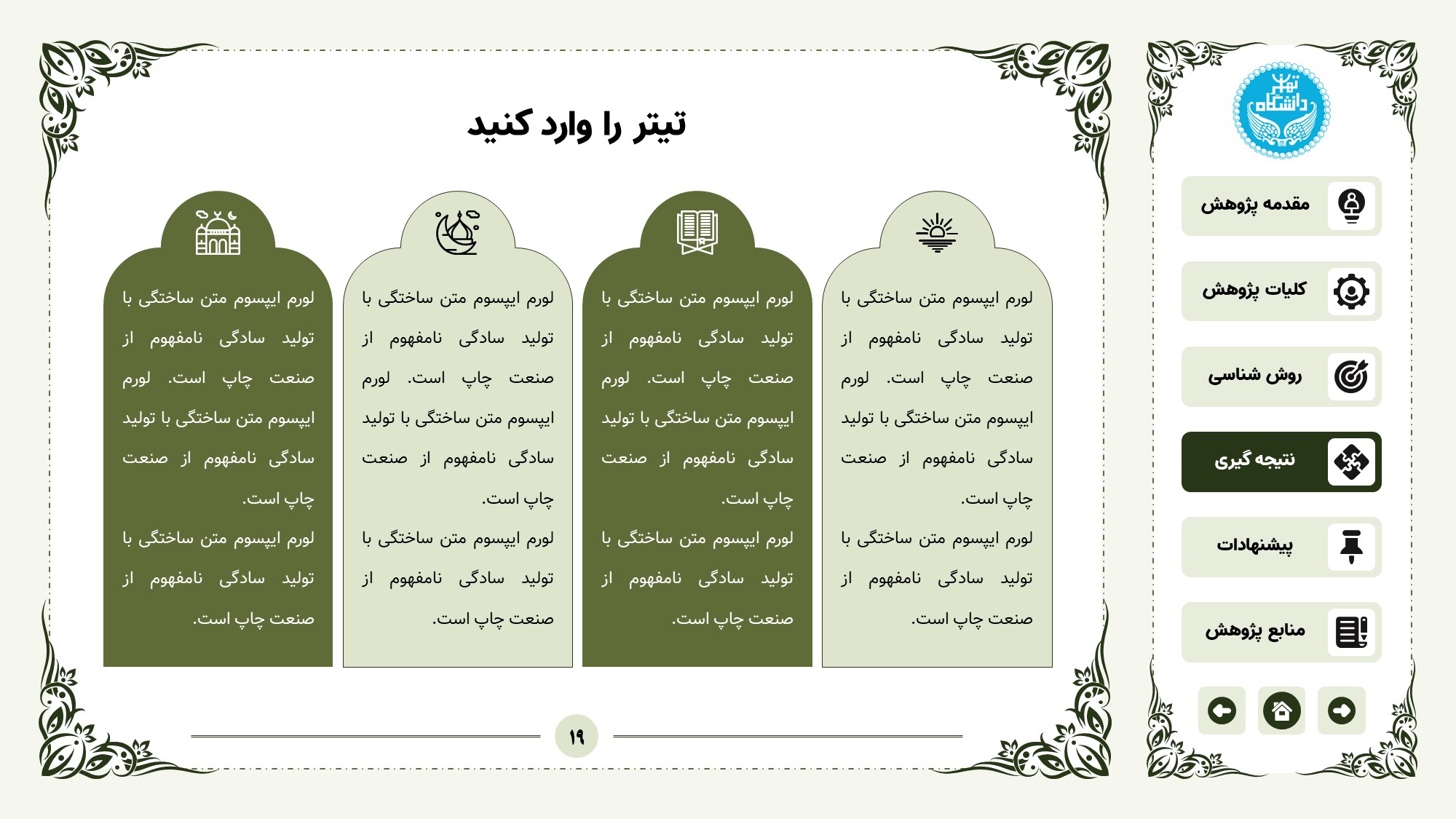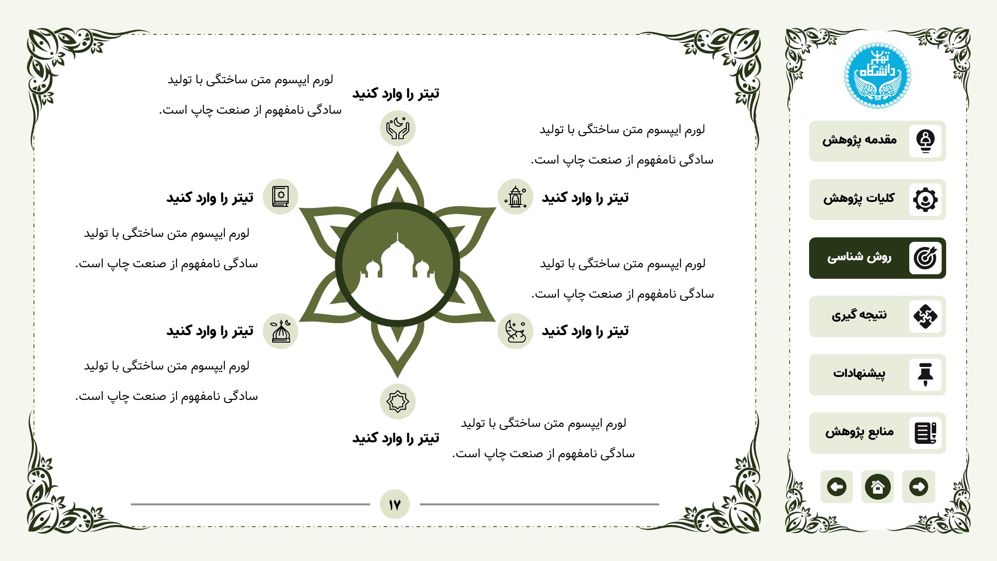 مناسب برای انواع ارائه‌های مذهبی:  با توجه به نوع طراحی این قالب، میتوانید از آن برای انواع ارائه های مذهبی پایان نامه، دانشگاهی، دکتری و… استفاده کنید.