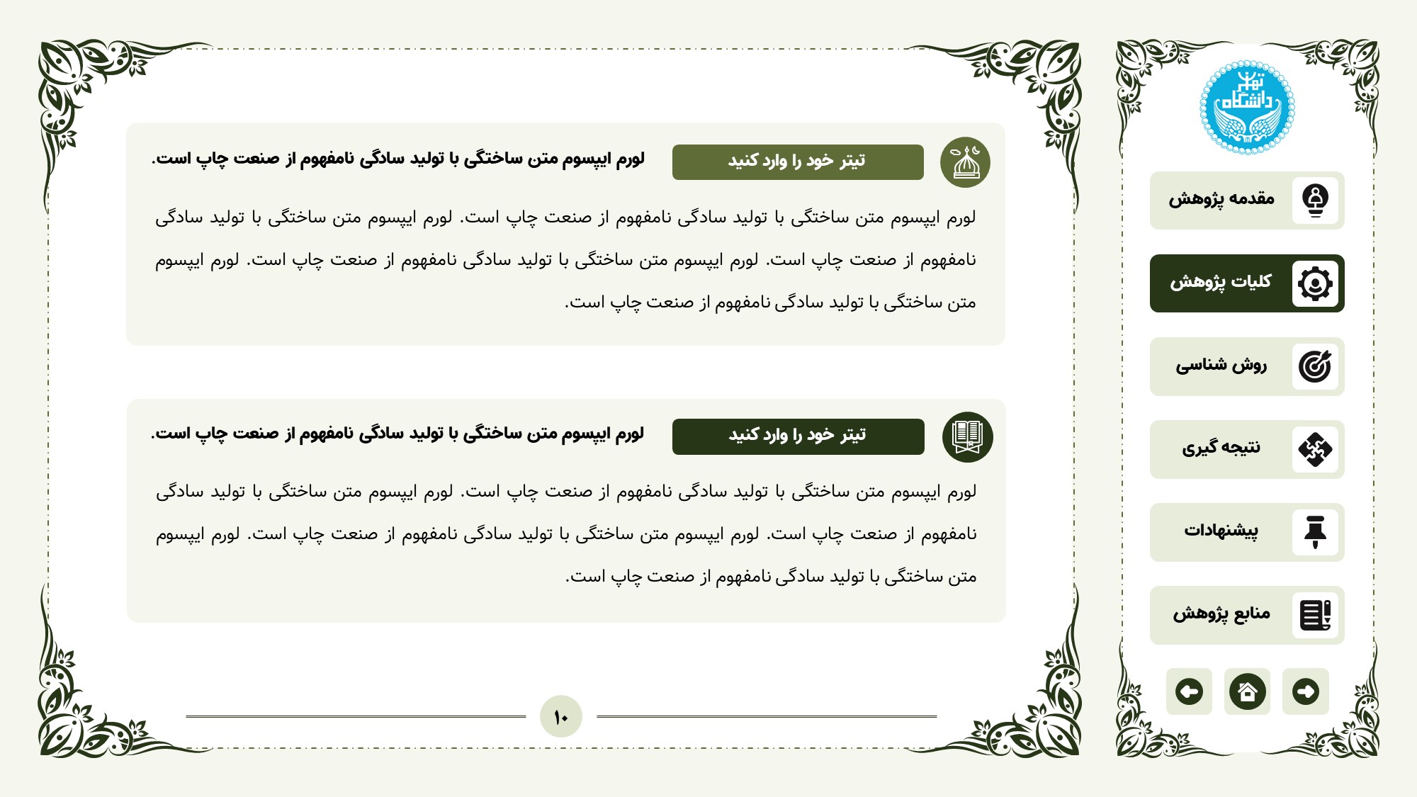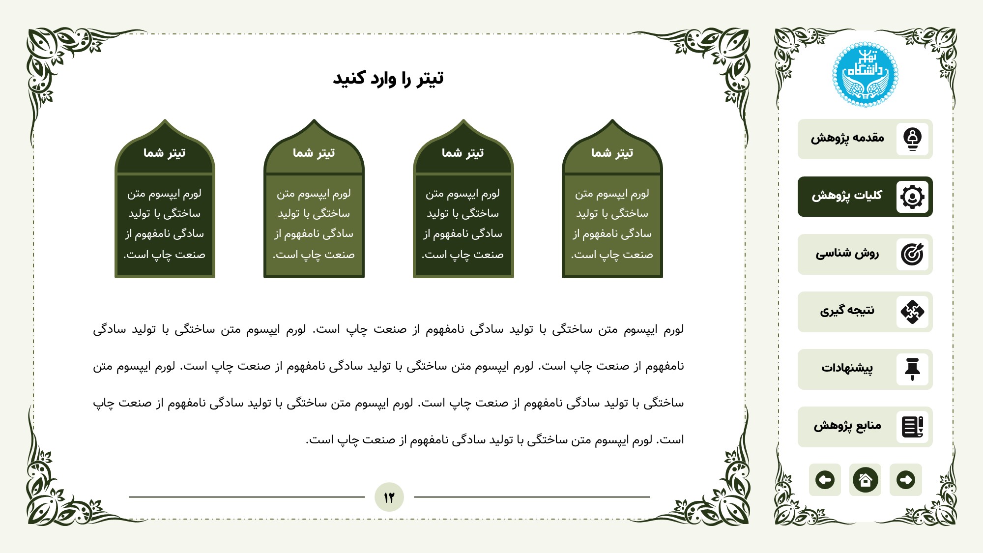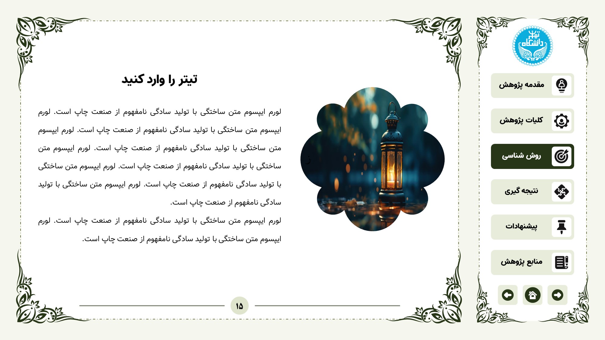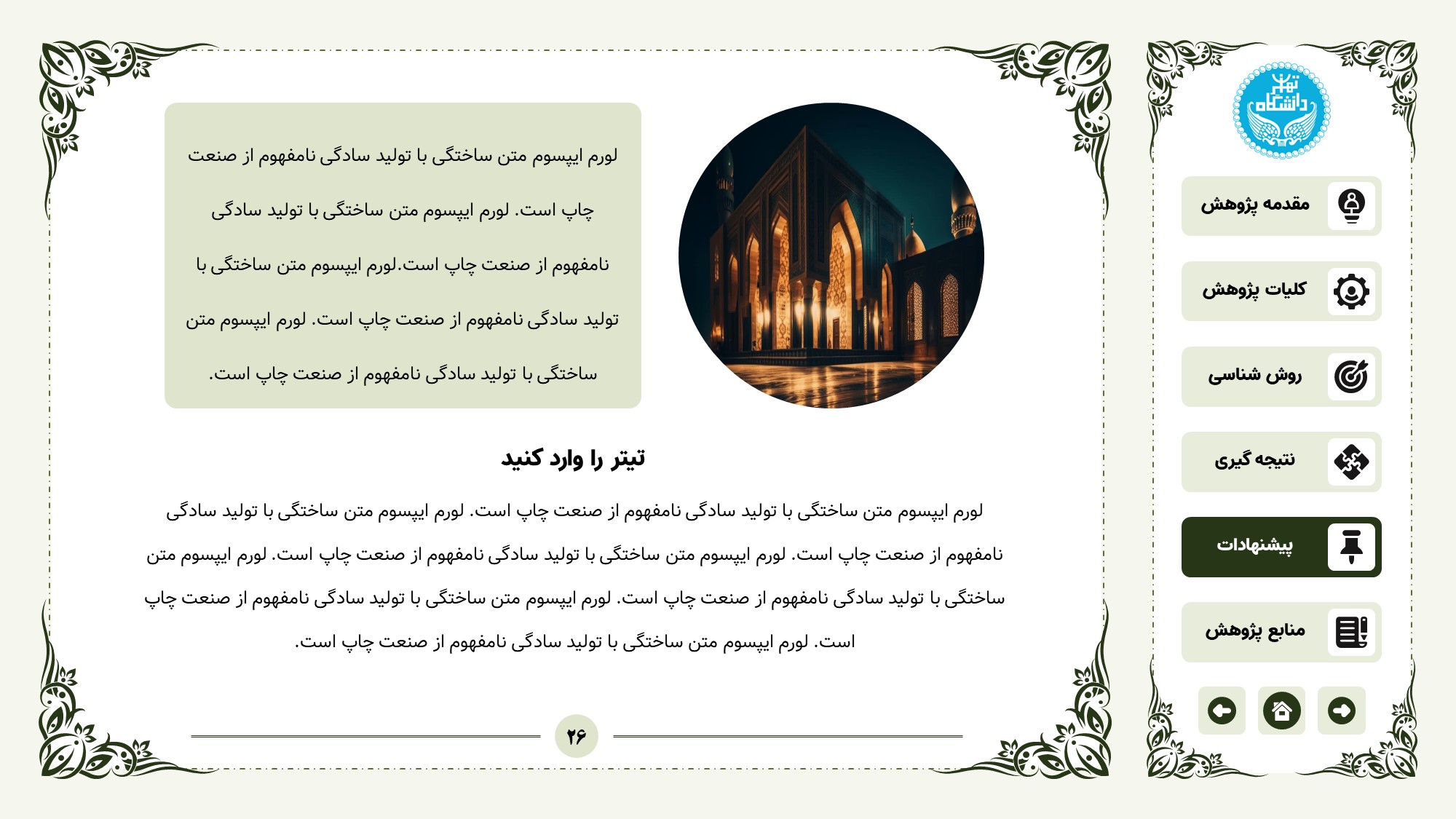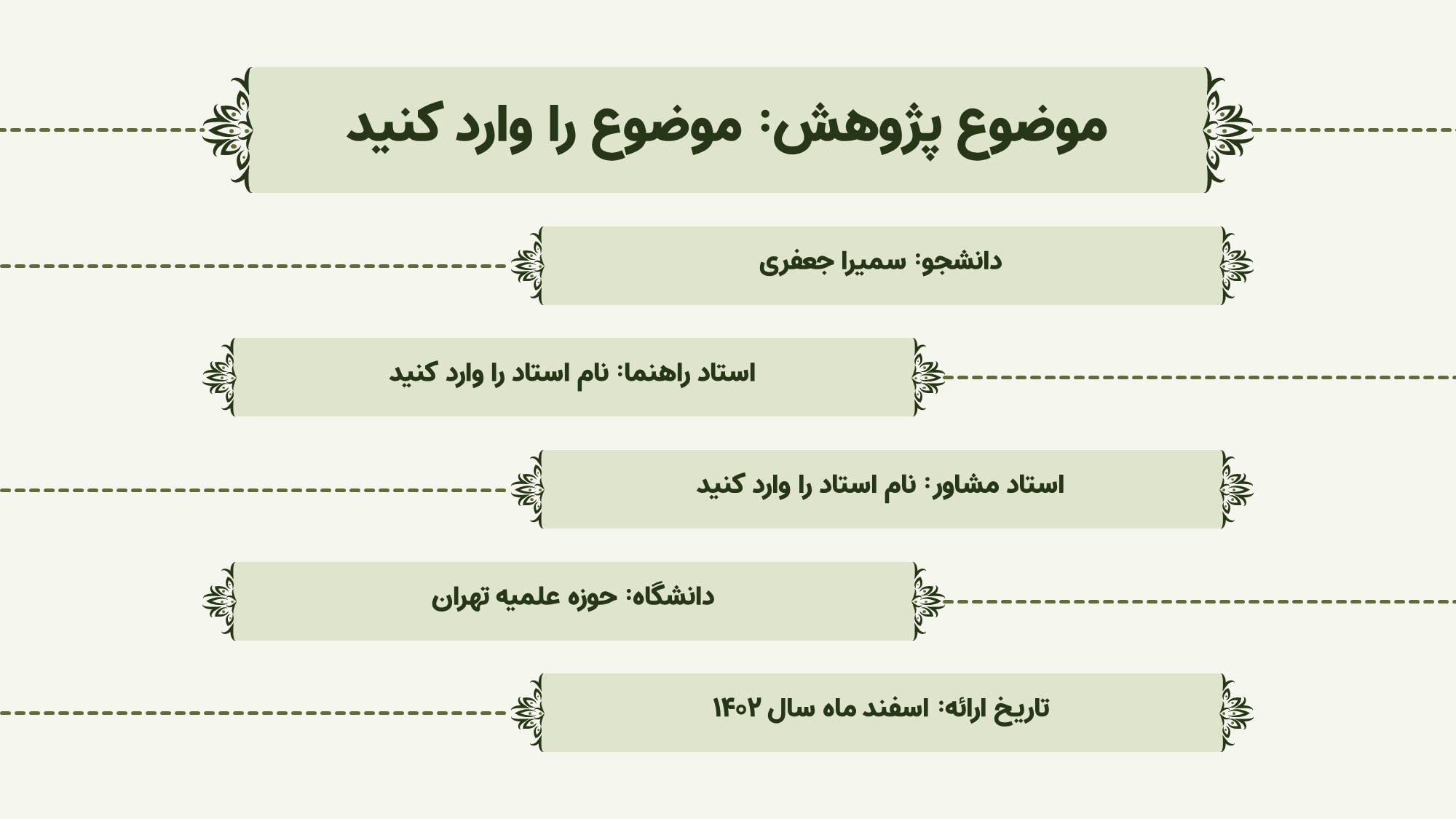 مناسب برای انواع ارائه‌های مذهبی:  با توجه به نوع طراحی این قالب، میتوانید از آن برای انواع ارائه های مذهبی پایان نامه، دانشگاهی، دکتری و… استفاده کنید.