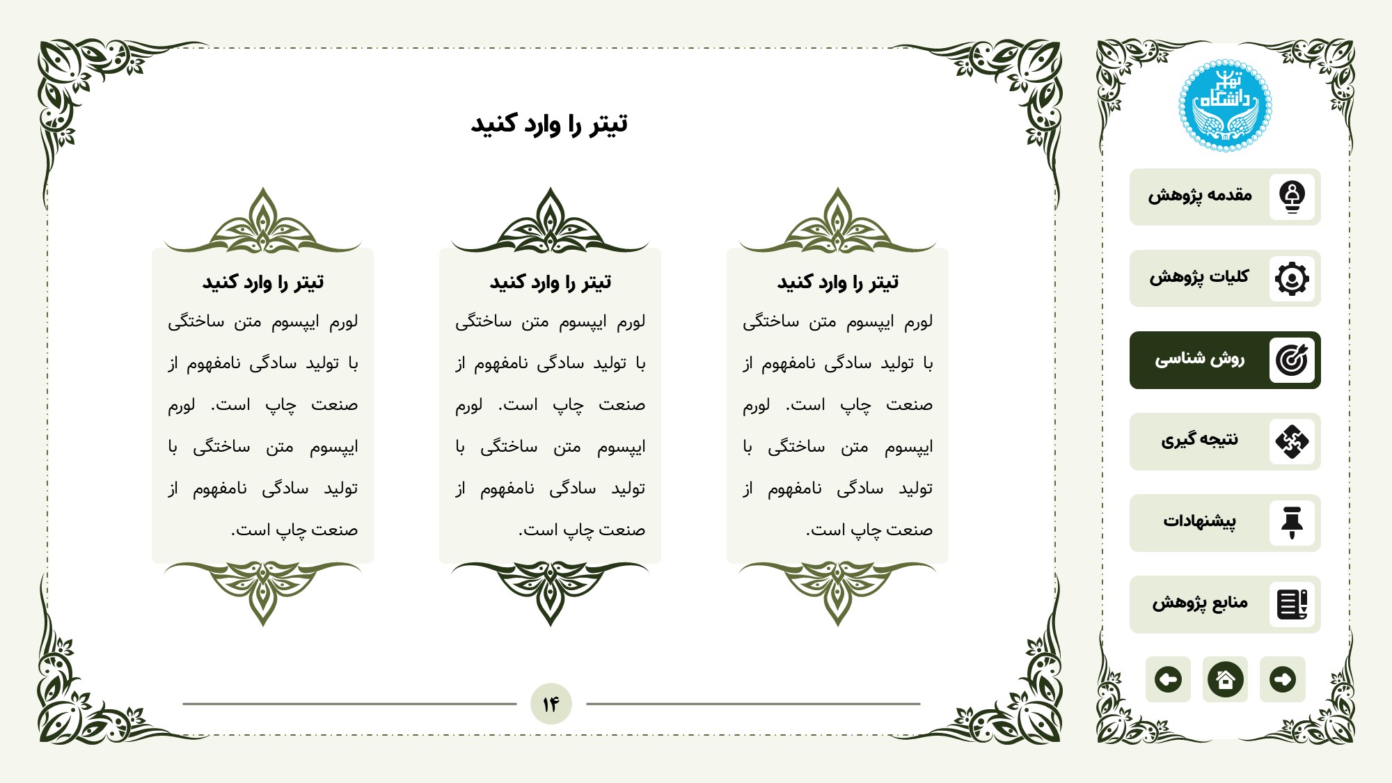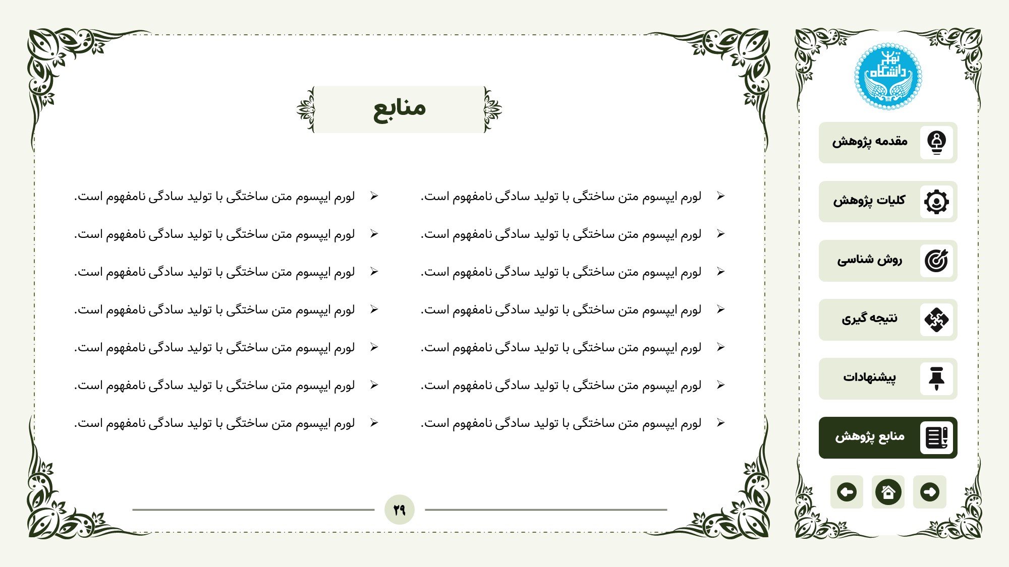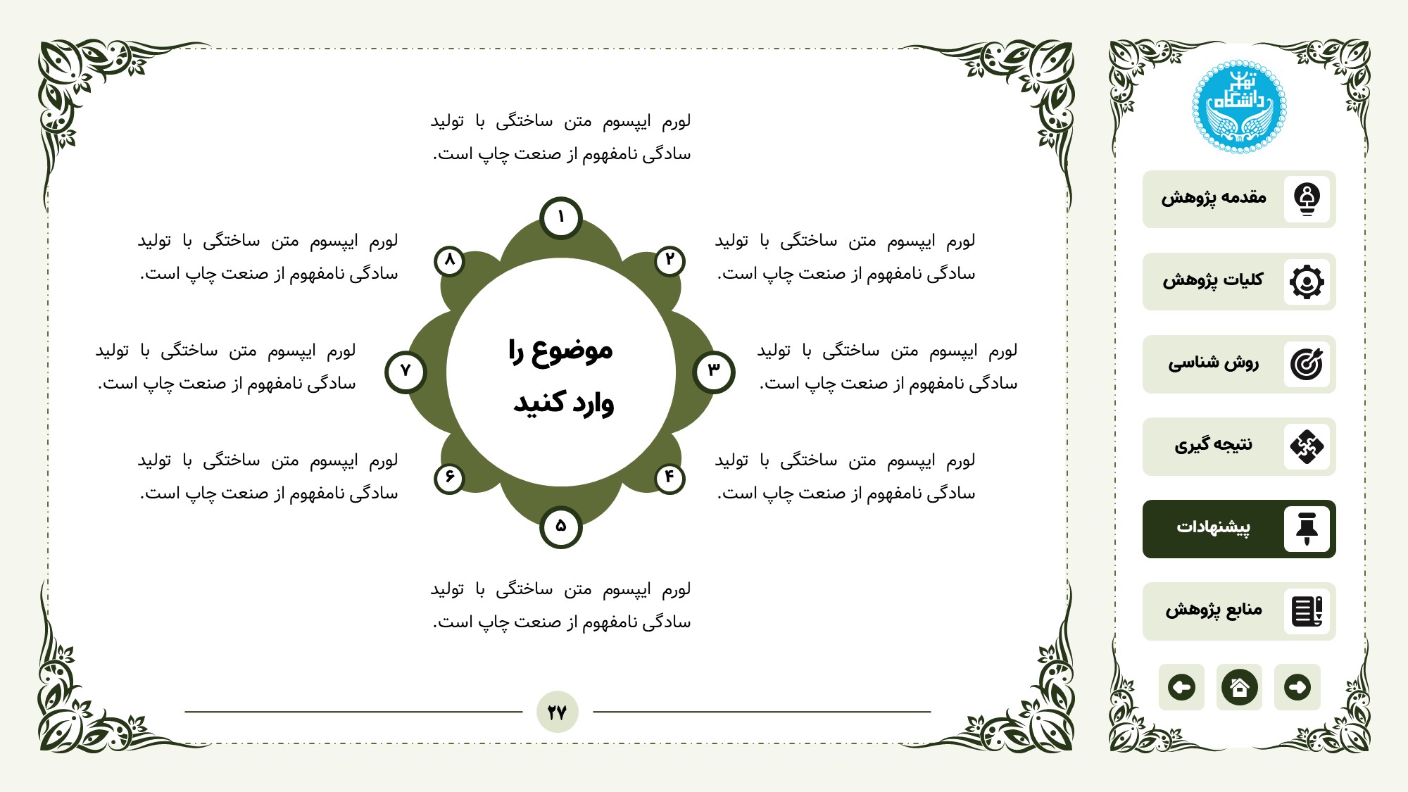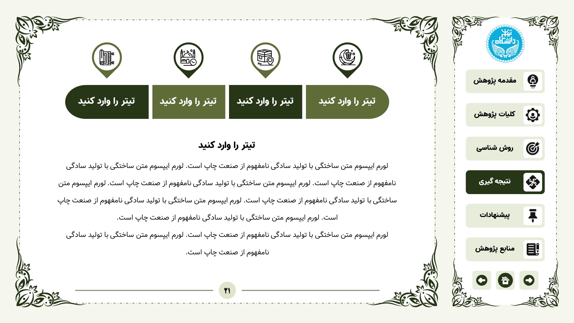 امیدواریم با استفاده از این پاورپوینت بهترین ارائه را داشته باشید. برای مشاهده قالب های حرفه ای بیشتر روی دانلود تم پاورپوینت قابل ویرایش کلیک کنید.