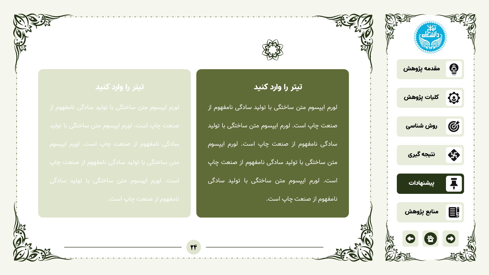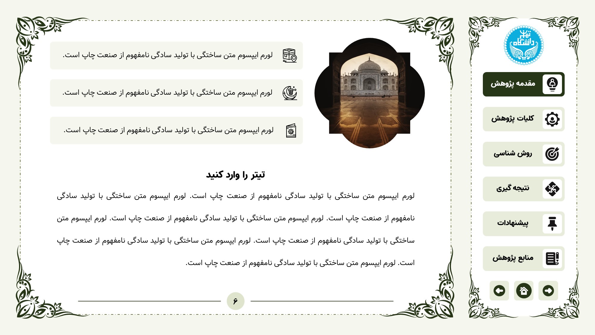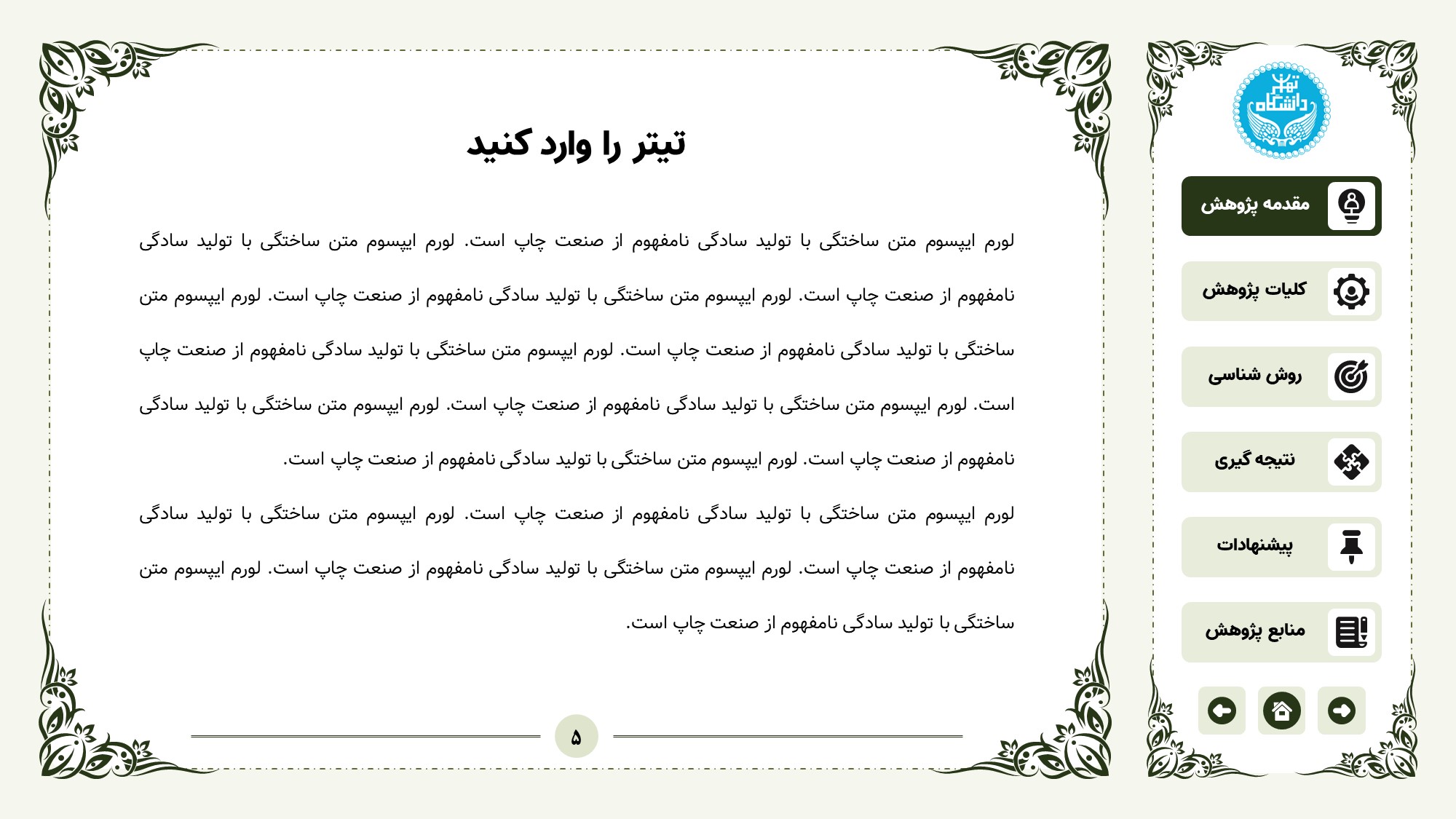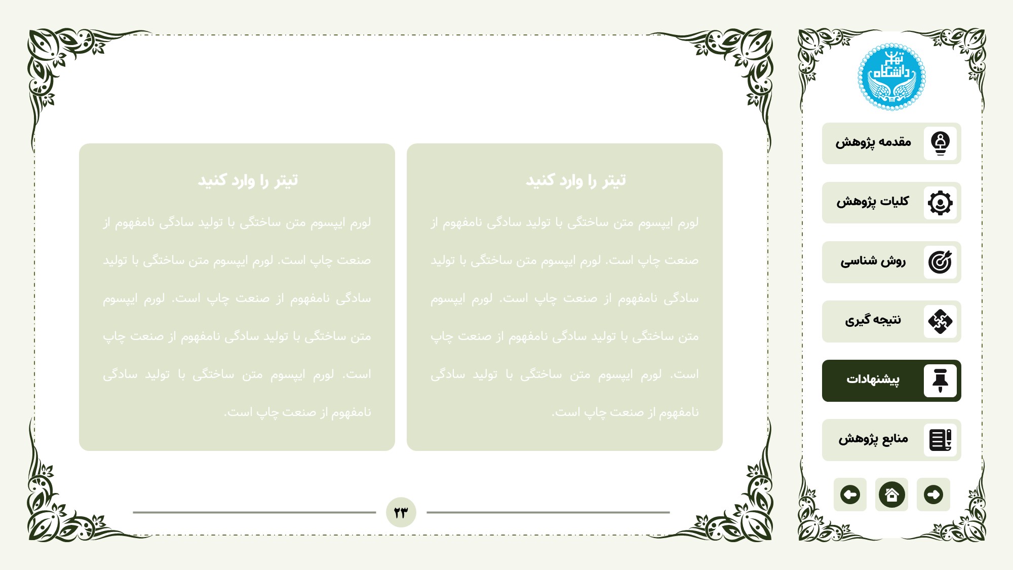 امیدواریم با استفاده از این پاورپوینت بهترین ارائه را داشته باشید. برای مشاهده قالب های حرفه ای بیشتر روی دانلود تم پاورپوینت قابل ویرایش کلیک کنید.