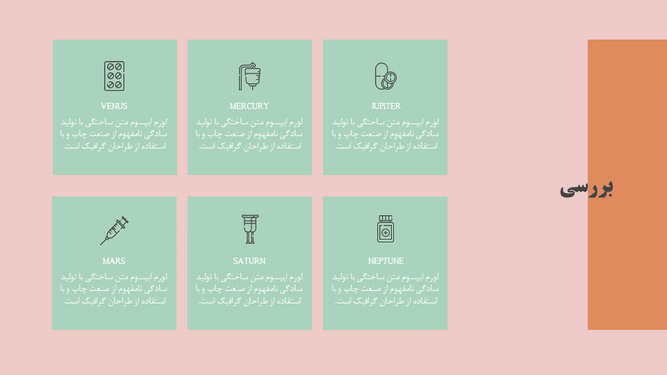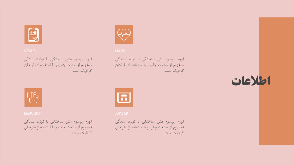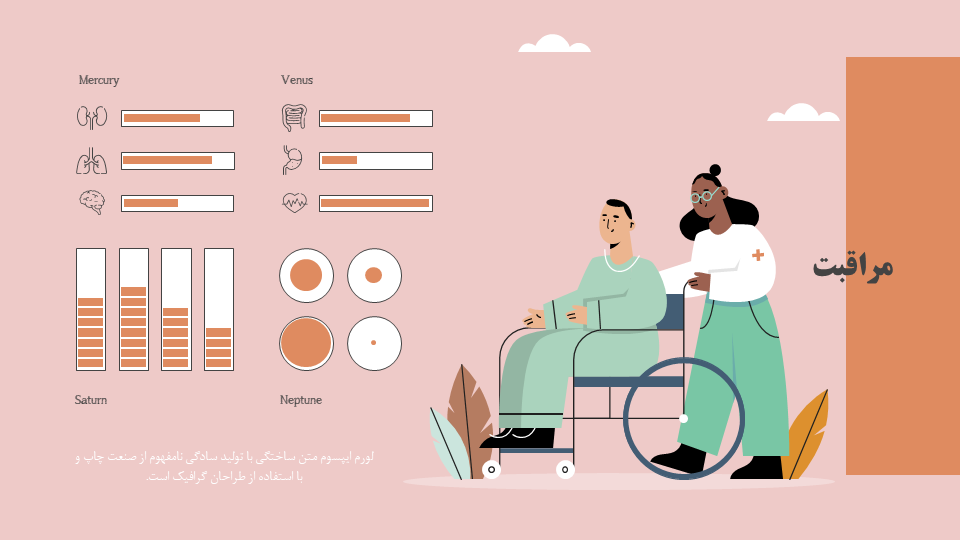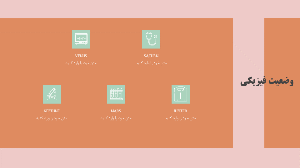 المانهای گرافیکی: دارای اینفوگرافیک پزشکی، اسلایدهای مختلف کلینیک با رنگهای متفاوت، اسلاید جدول و اسلاید نقشه و…