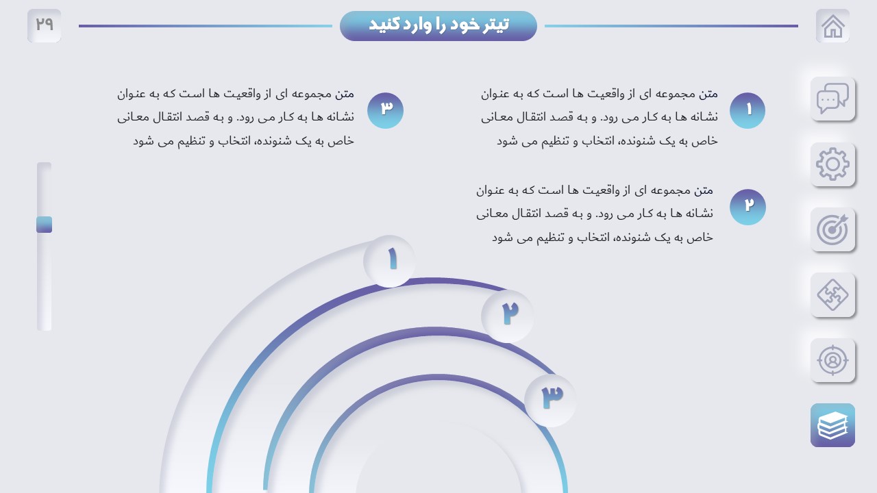 مناسب برای انواع ارائههای دانشگاهی یا شرکتی: با توجه به سبک طراحی این پاورپوینت، از این کار میتوانید در ارائههای شرکتی مثل ارائههای مدیریتی یا گزارش کار و همچنین ارائههای دانشگاهی مثل پایاننامه یا پروپوزال استفاده کنید.
