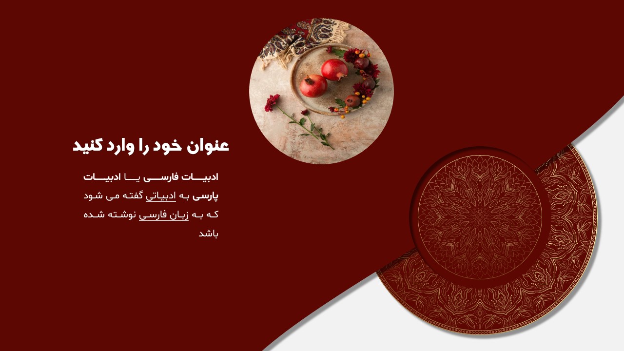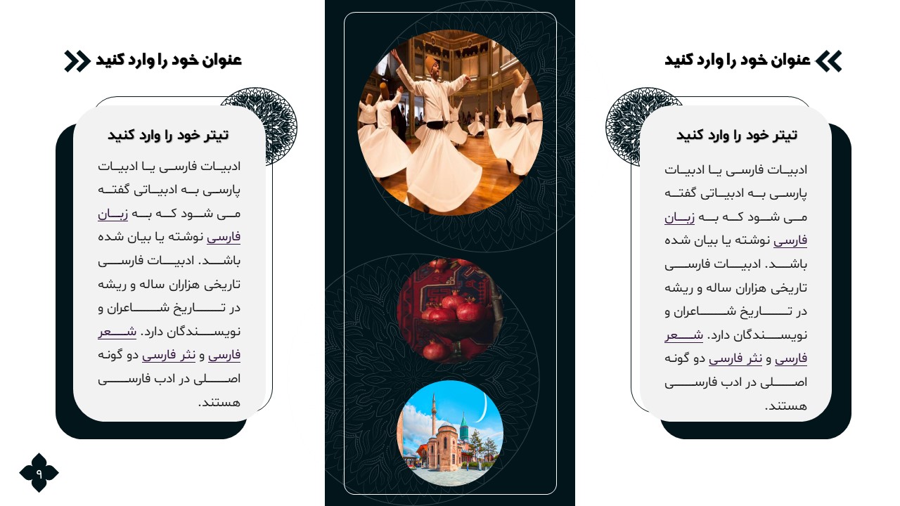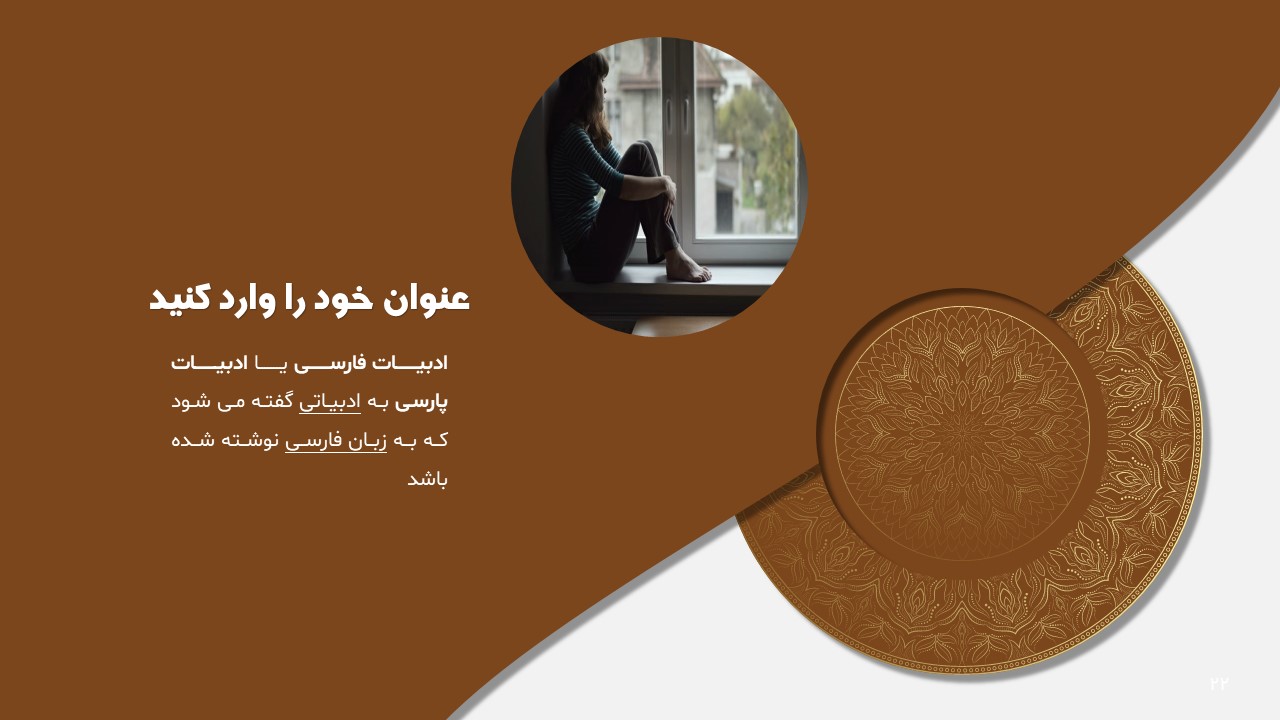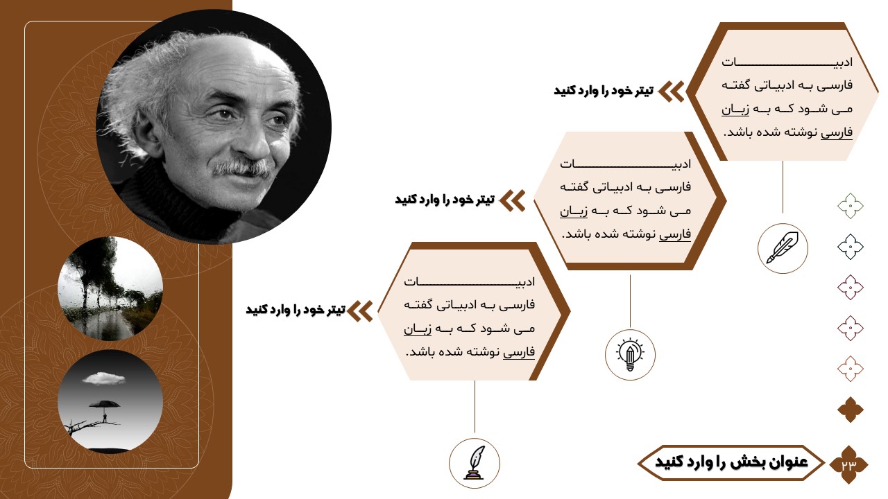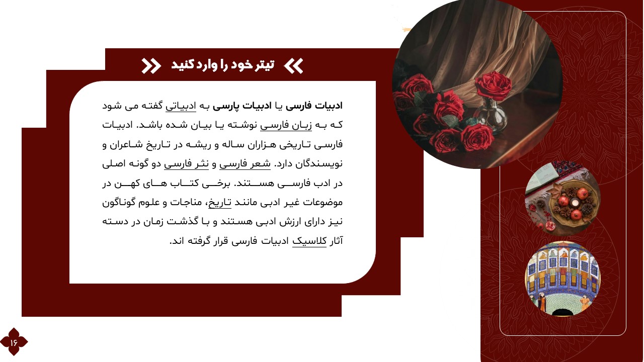 این تمپلیت یک پاورپوینت آماده است که فقط کافی است تصاویر و متنهایتان را در جایگاه مورد نظر قرار دهید و در مدت زمان کوتاهی یک پاورپوینت زیبا برای ارائه درس ادبیات طراحی کنید. ویژگیهای این تمپلیت در ادامه آورده شده است.