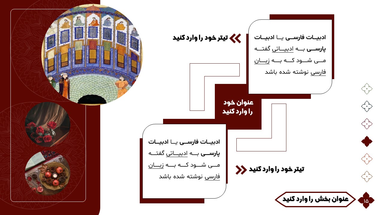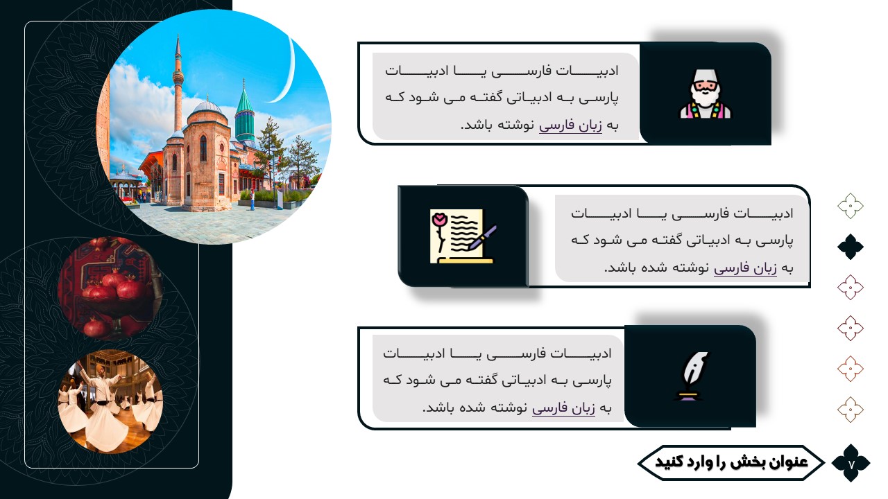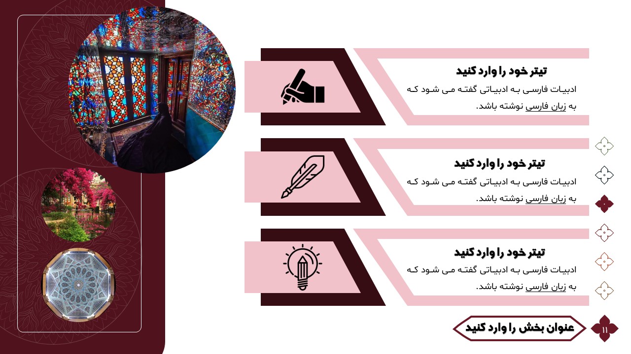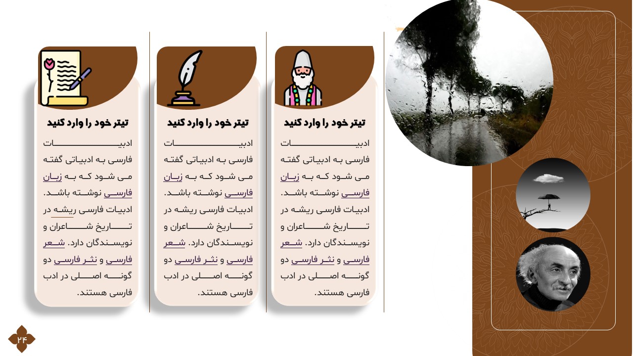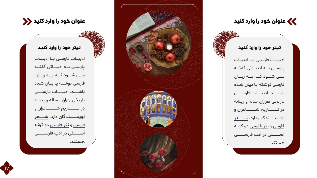 این تمپلیت یک پاورپوینت آماده است که فقط کافی است تصاویر و متنهایتان را در جایگاه مورد نظر قرار دهید و در مدت زمان کوتاهی یک پاورپوینت زیبا برای ارائه درس ادبیات طراحی کنید. ویژگیهای این تمپلیت در ادامه آورده شده است.