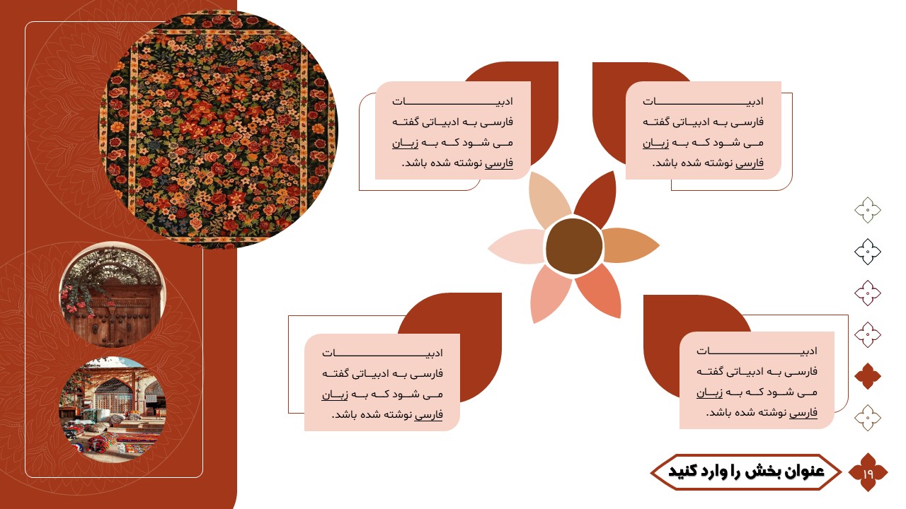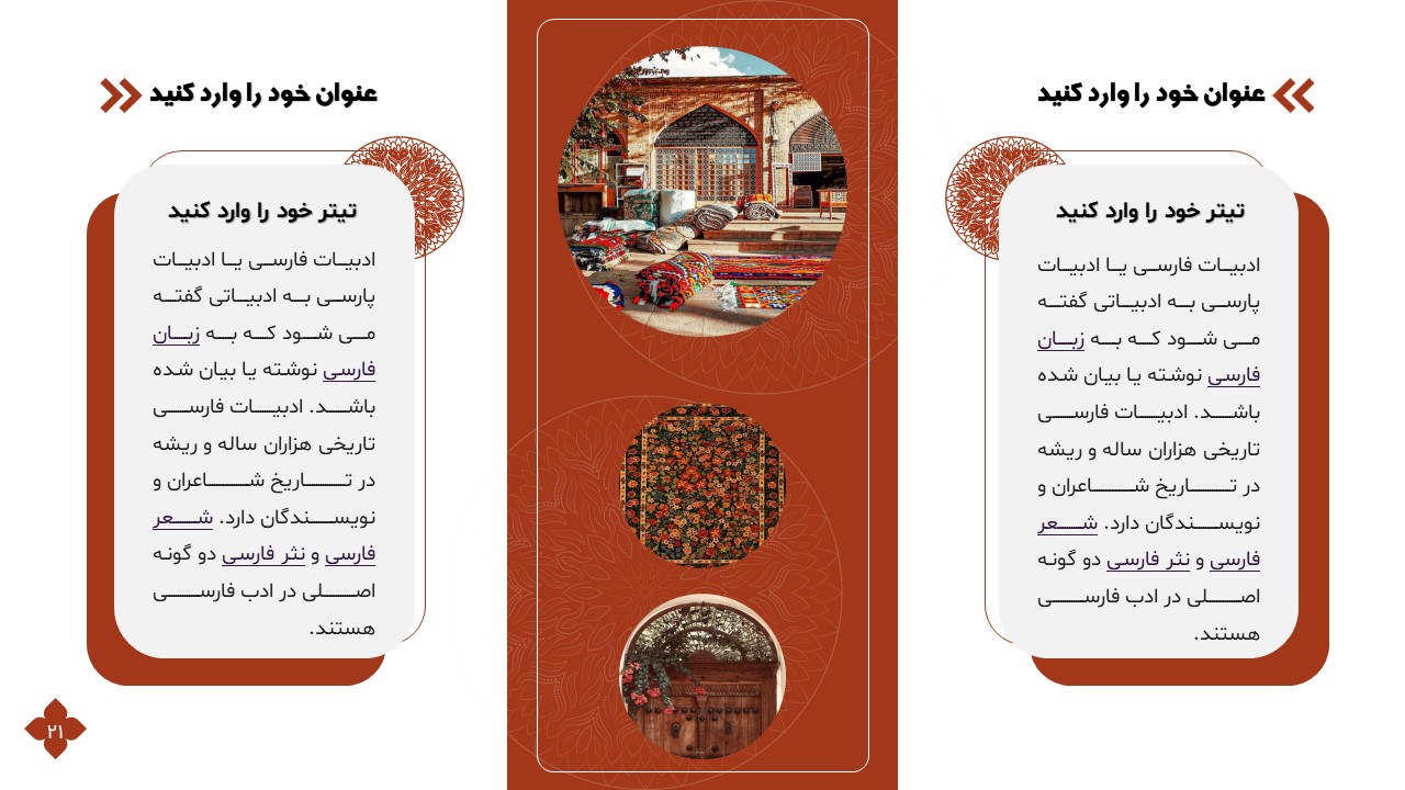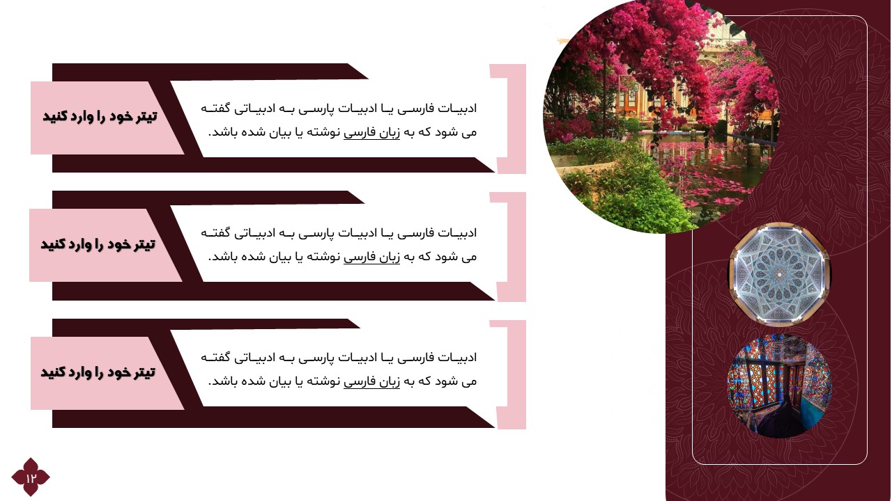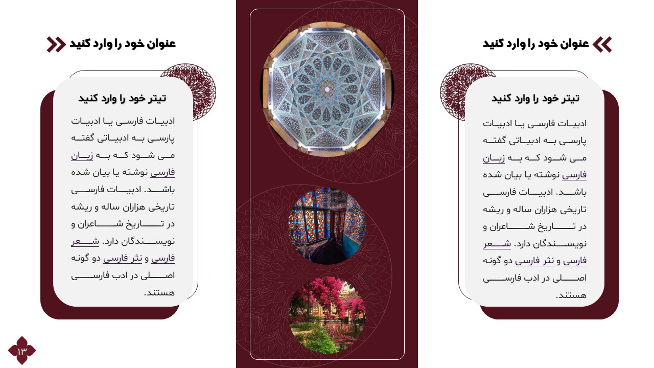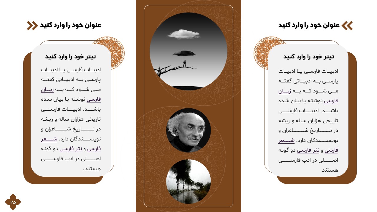 این تمپلیت یک پاورپوینت آماده است که فقط کافی است تصاویر و متنهایتان را در جایگاه مورد نظر قرار دهید و در مدت زمان کوتاهی یک پاورپوینت زیبا برای ارائه درس ادبیات طراحی کنید. ویژگیهای این تمپلیت در ادامه آورده شده است.