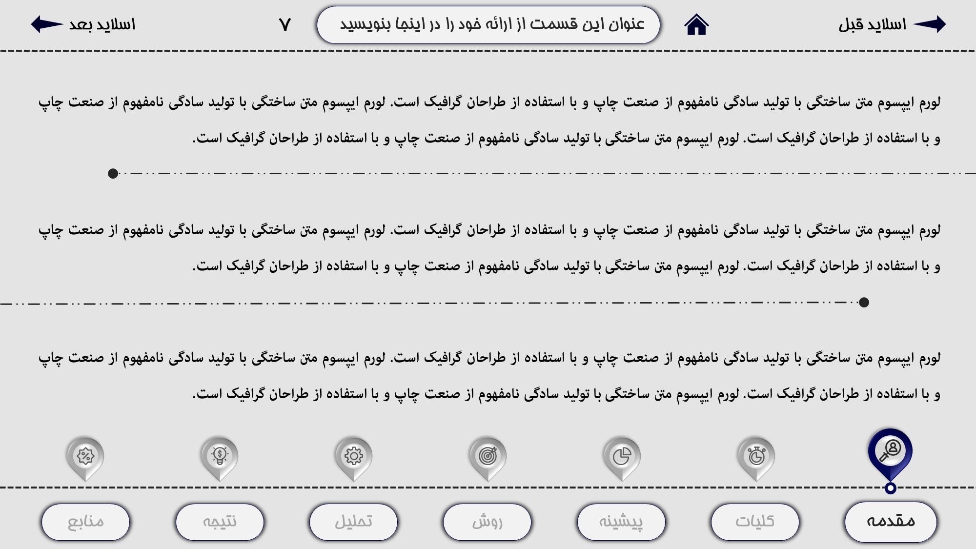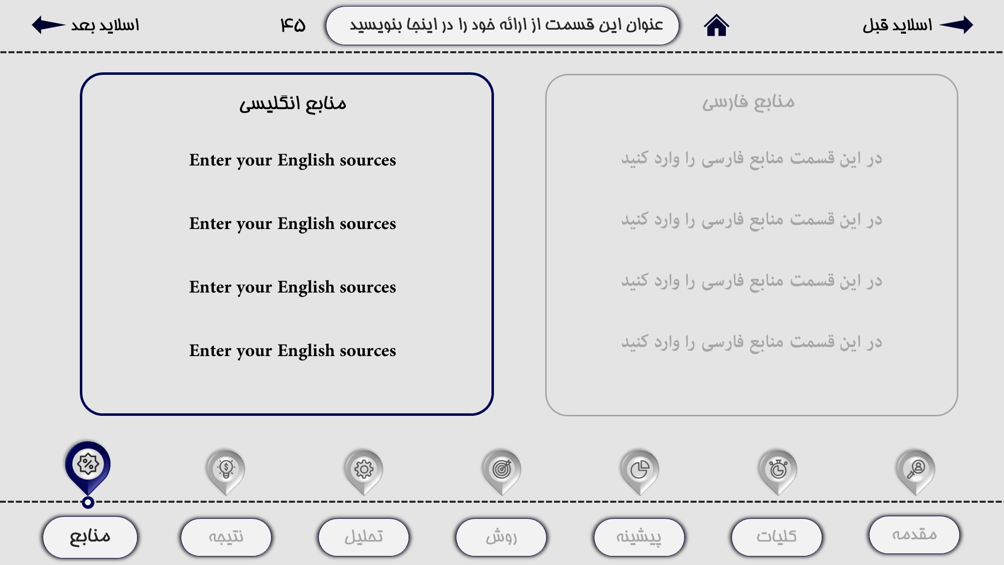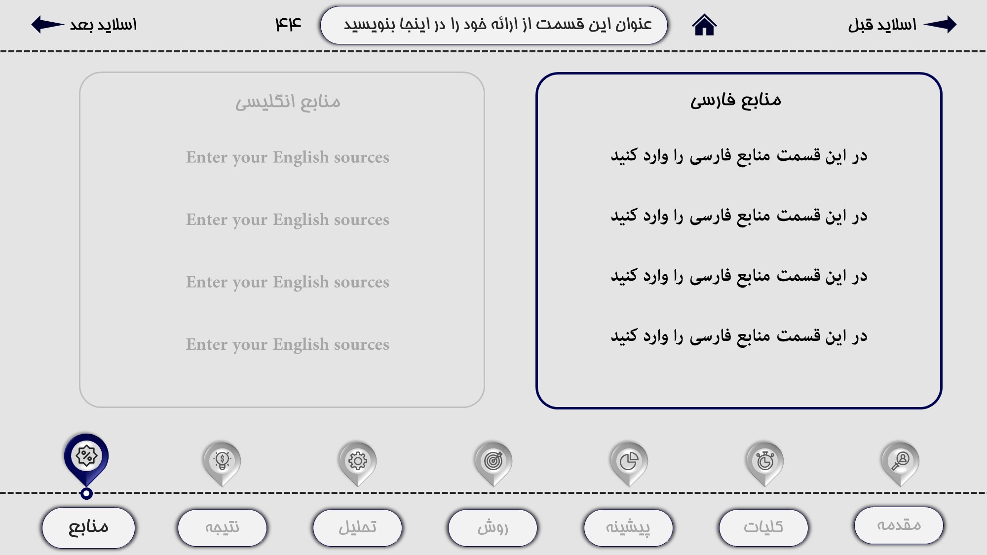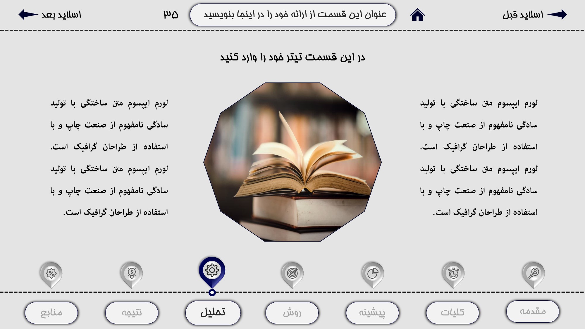 مناسب برای جلسات دفاع: این تمپلیت یک نمونه پاورپوینت پایان نامه است که در جلسات دفاع کارشناسی ارشد و دکتری میتوانید از آن استفاده کنید.