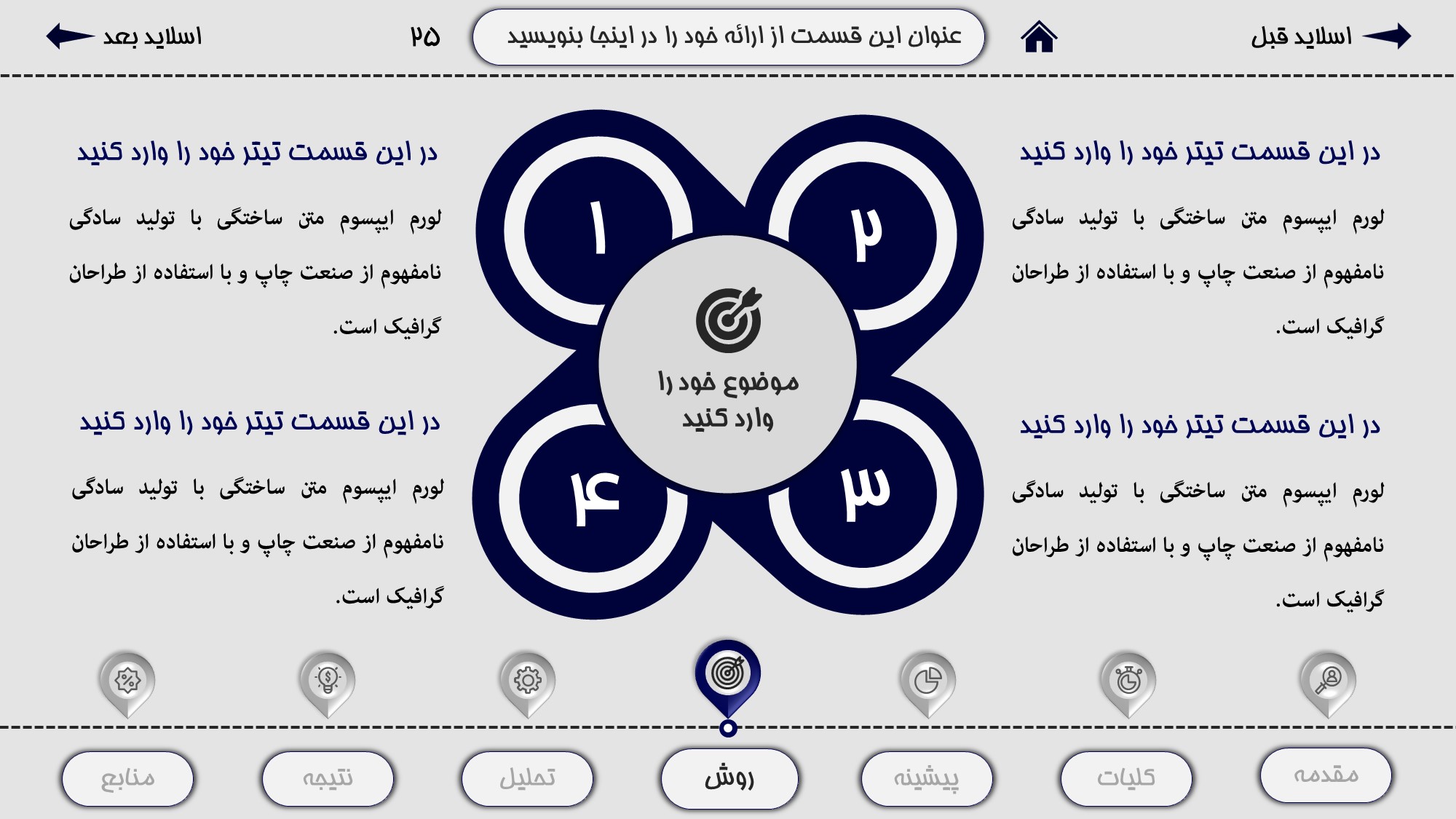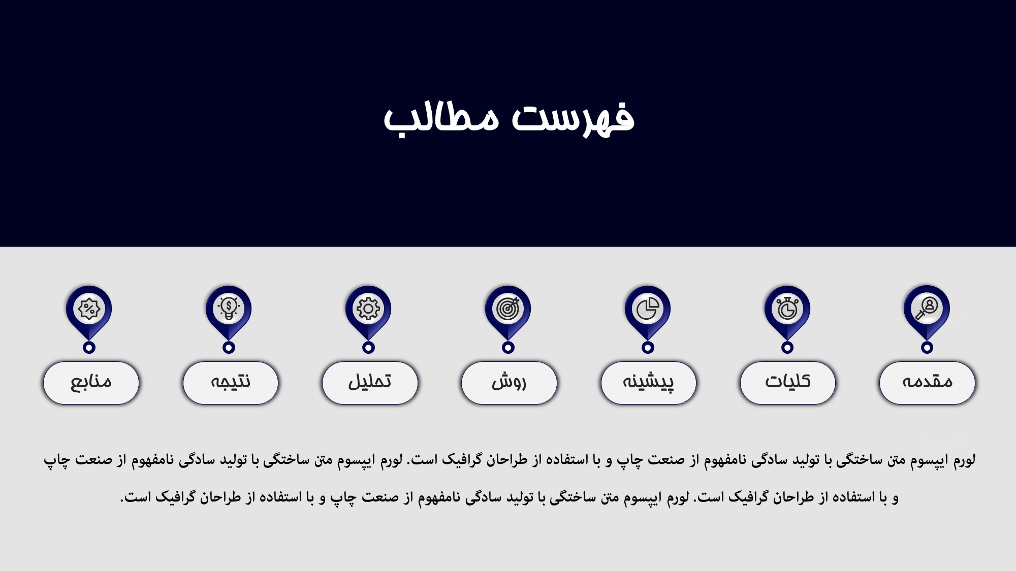 منوی هوشمند: بله، همانطور که در تصاویر و ویدئوی پیشنمایش مشخص است، این پاورپوینت در 7 بخش طراحی شده که با کلیک روی هر بخش از منو، به اولین اسلاید آن بخش هدایت میشوید.