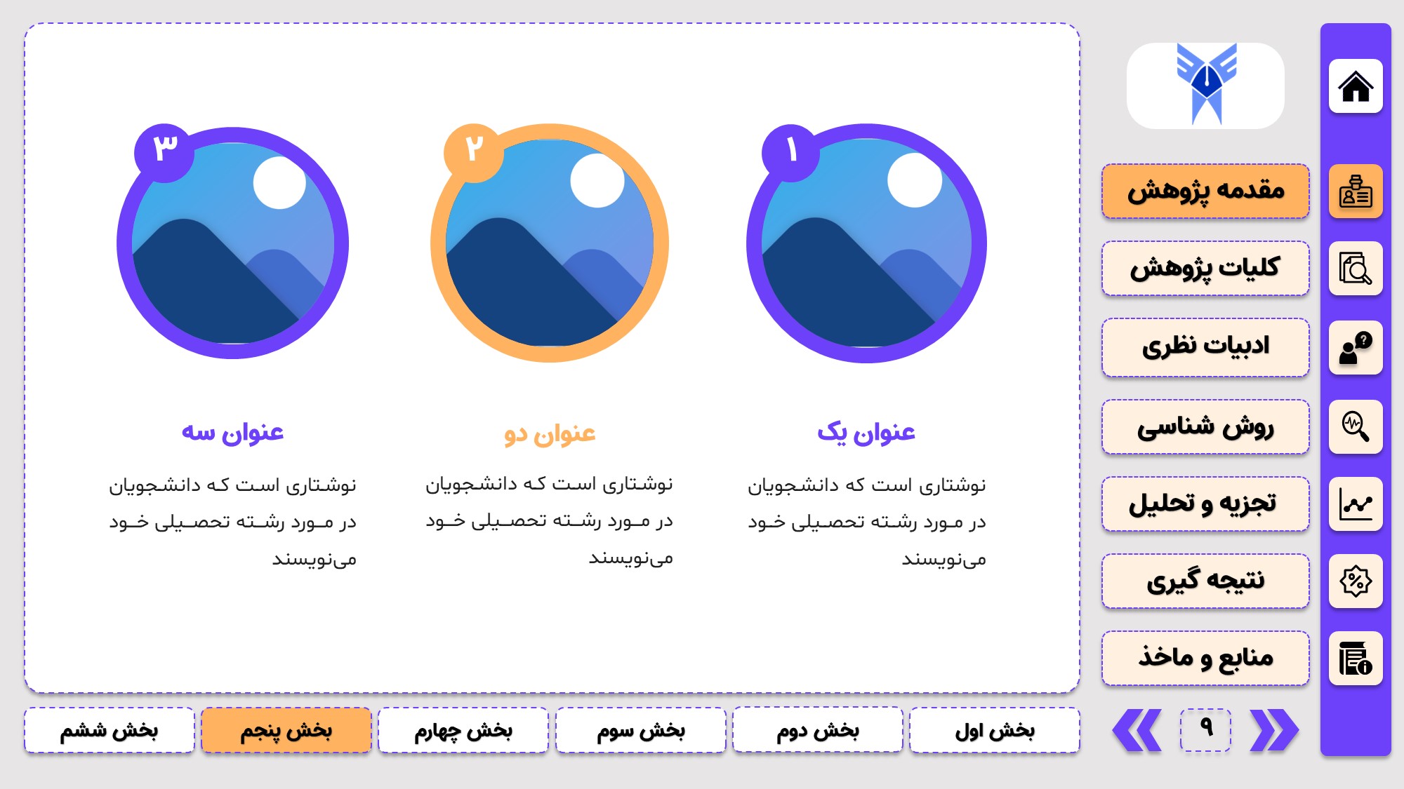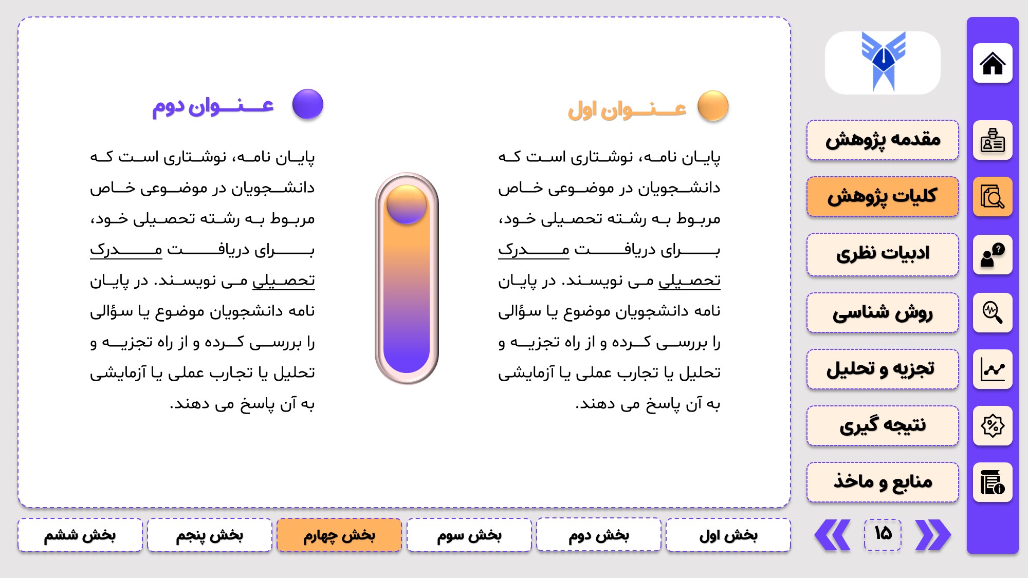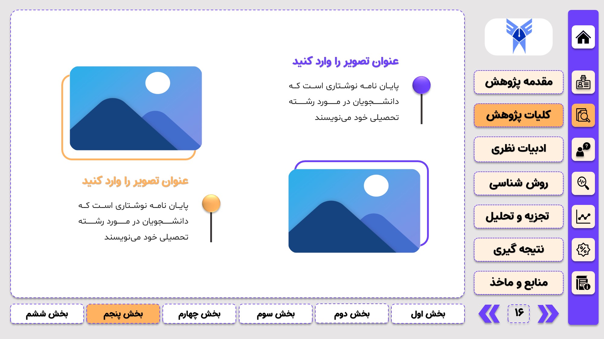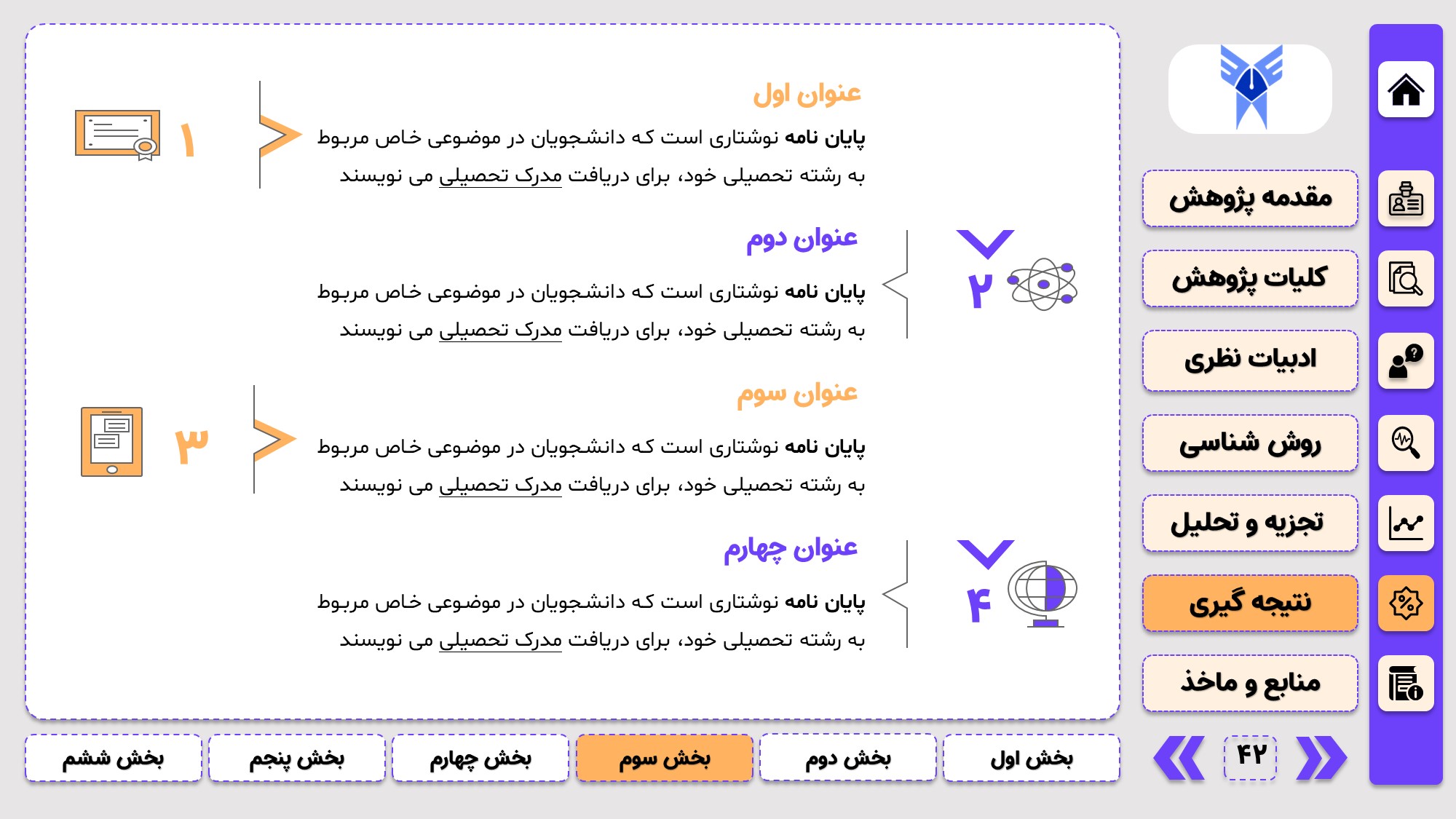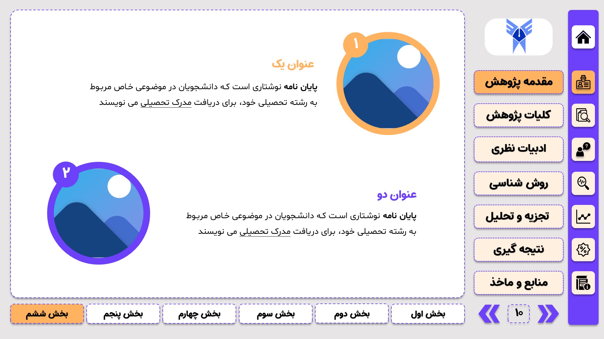 طراحی به صورت دو منو: در طراحی این پاورپوینت از یک منوی عمودی و یک منوی افقی استفاده شده که باعث بخش بندی راحت ارائه پاورپوینت پایان نامه میشود.