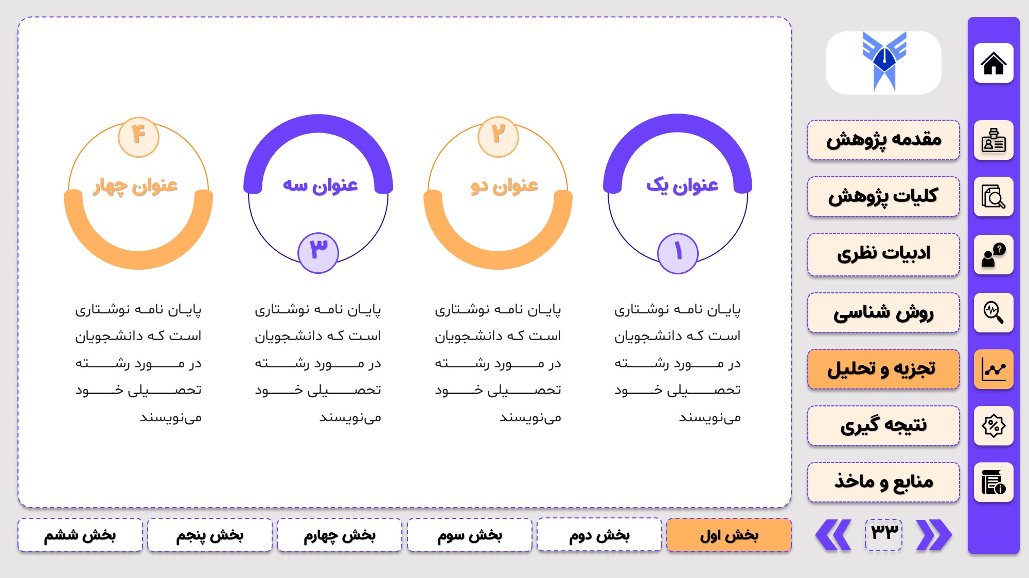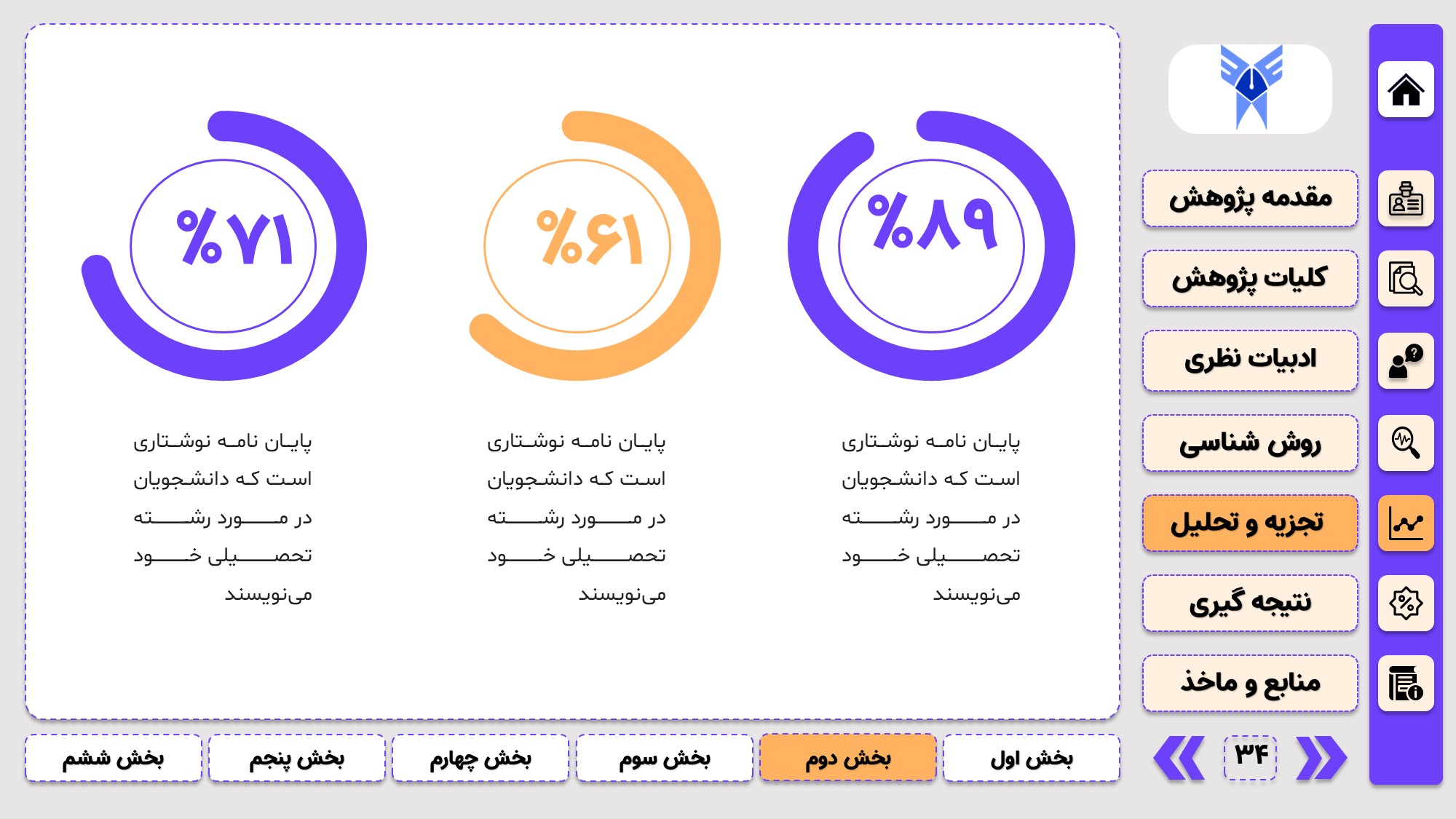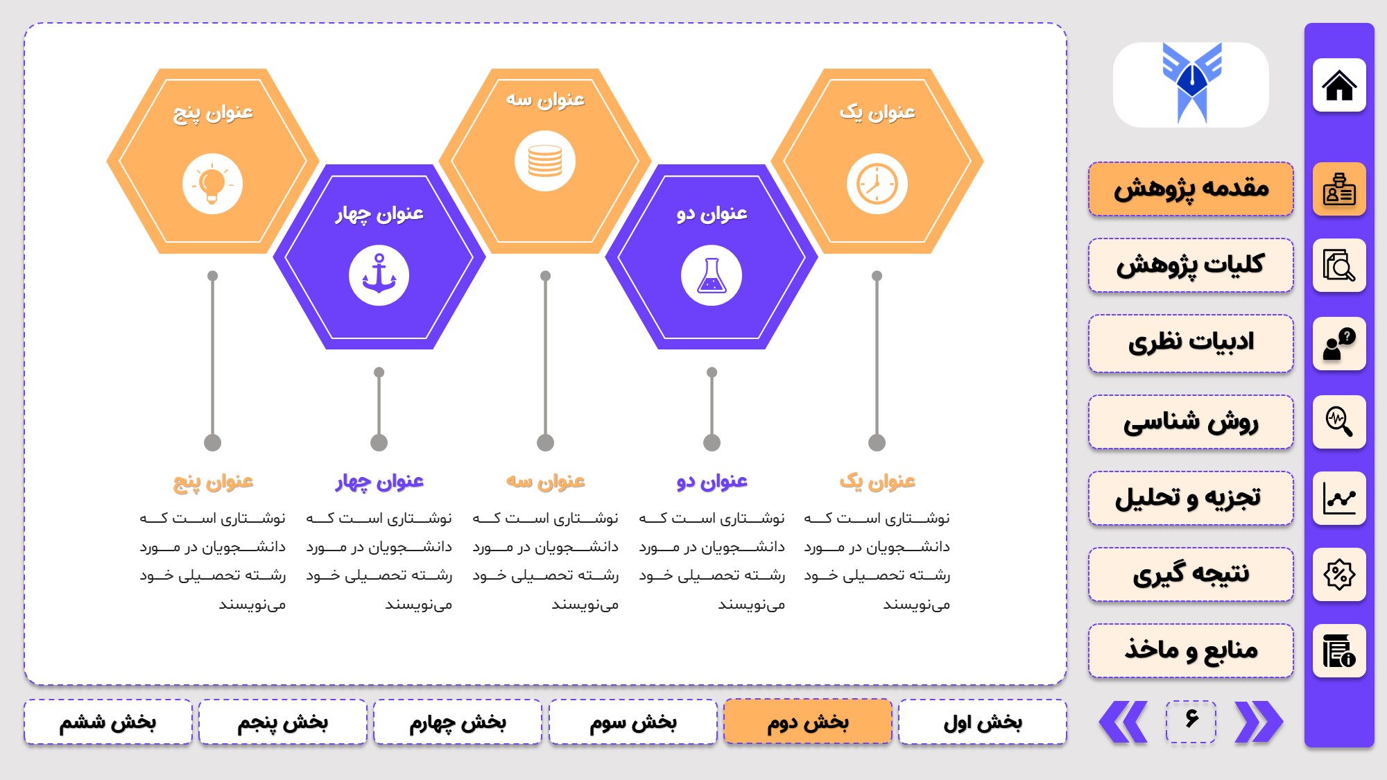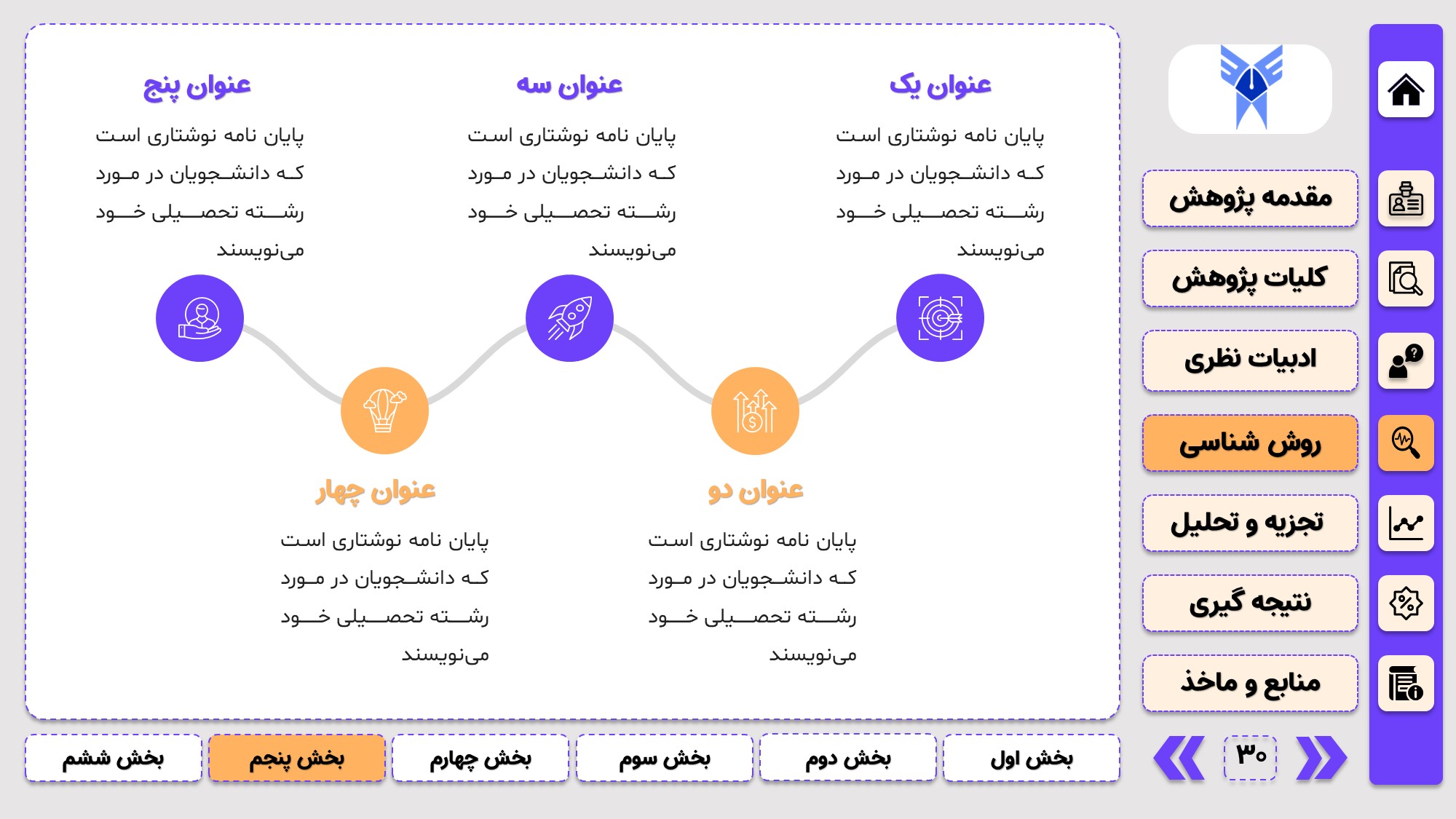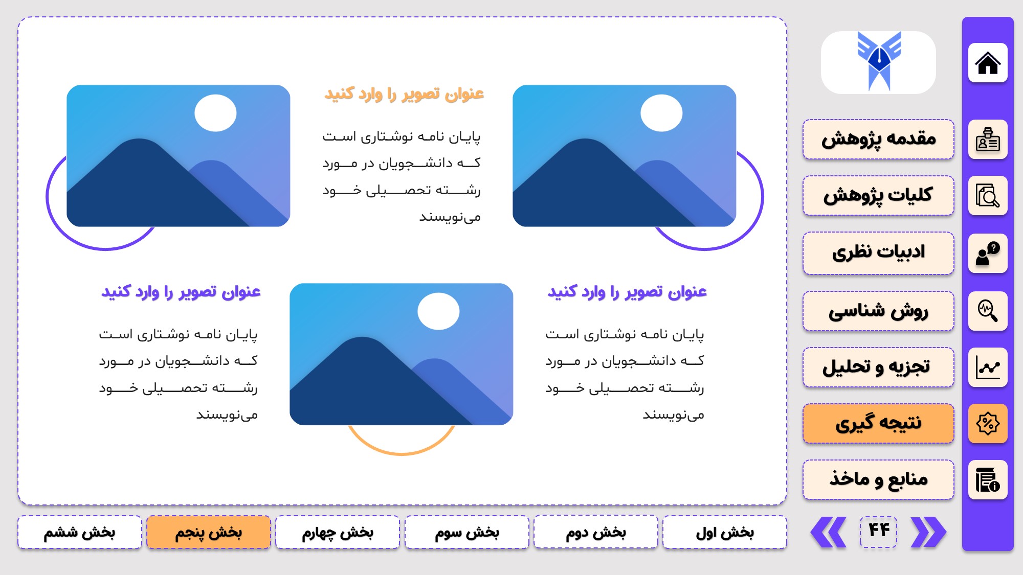طراحی به صورت دو منو: در طراحی این پاورپوینت از یک منوی عمودی و یک منوی افقی استفاده شده که باعث بخش بندی راحت ارائه پاورپوینت پایان نامه میشود.