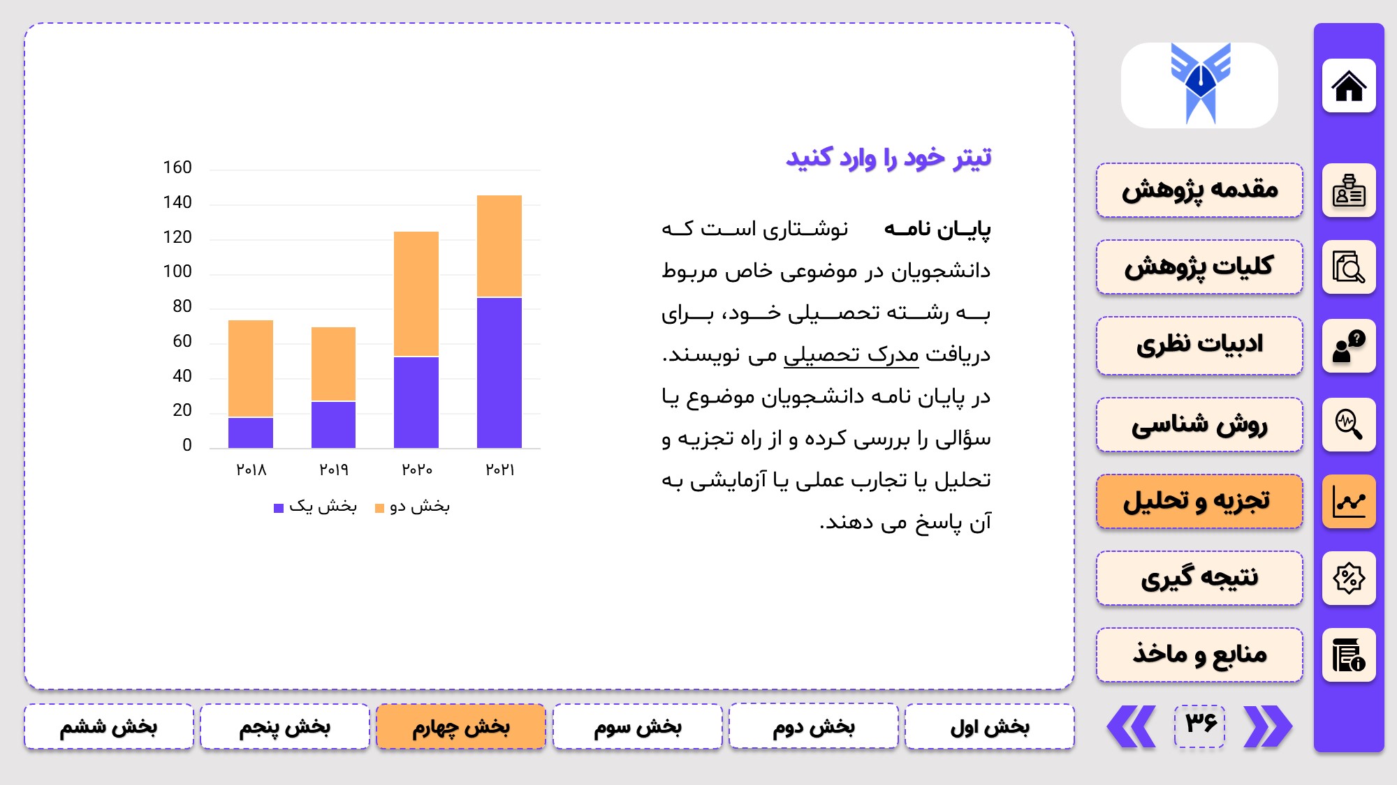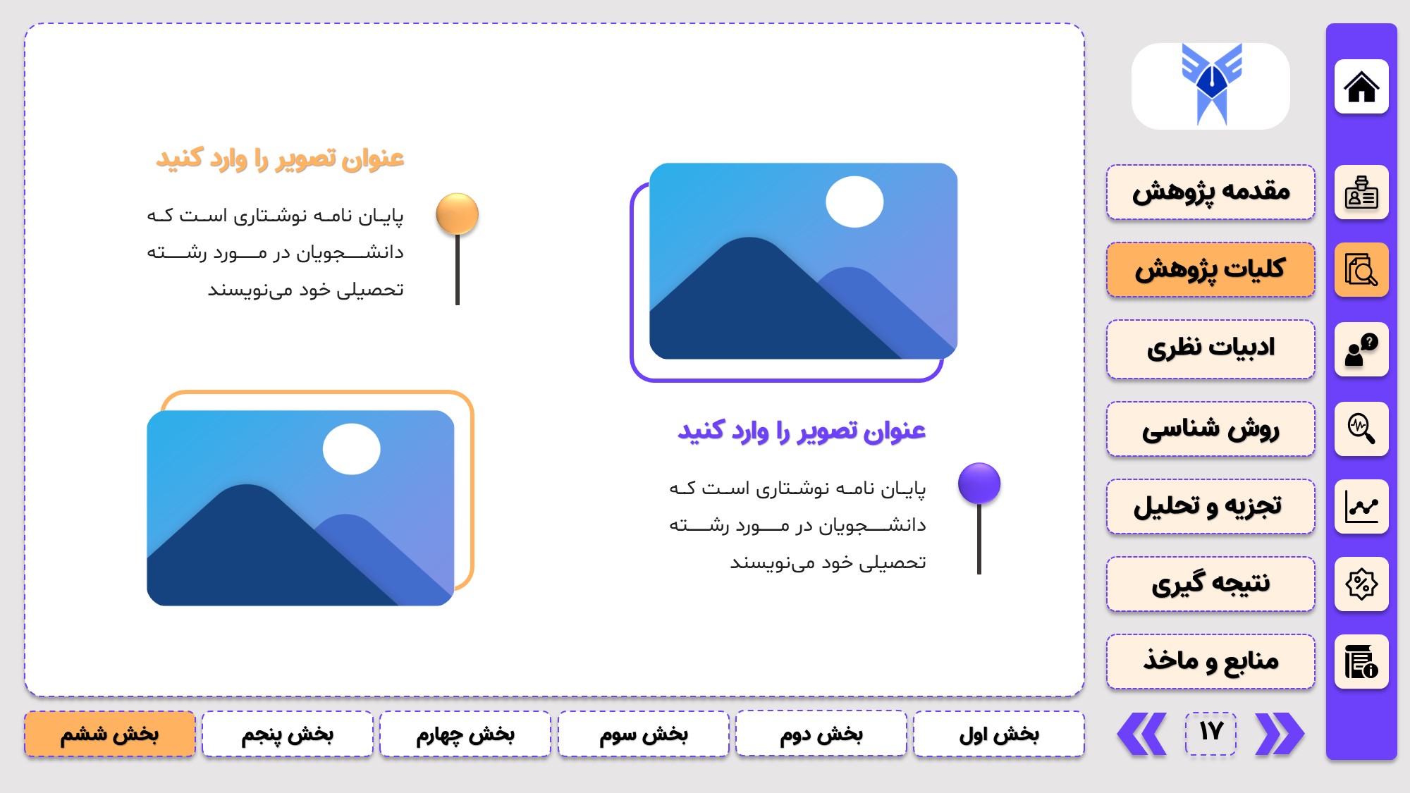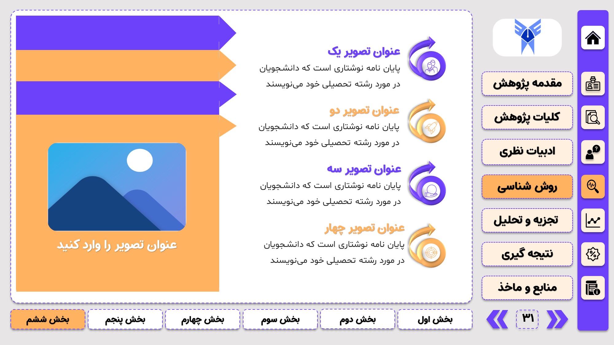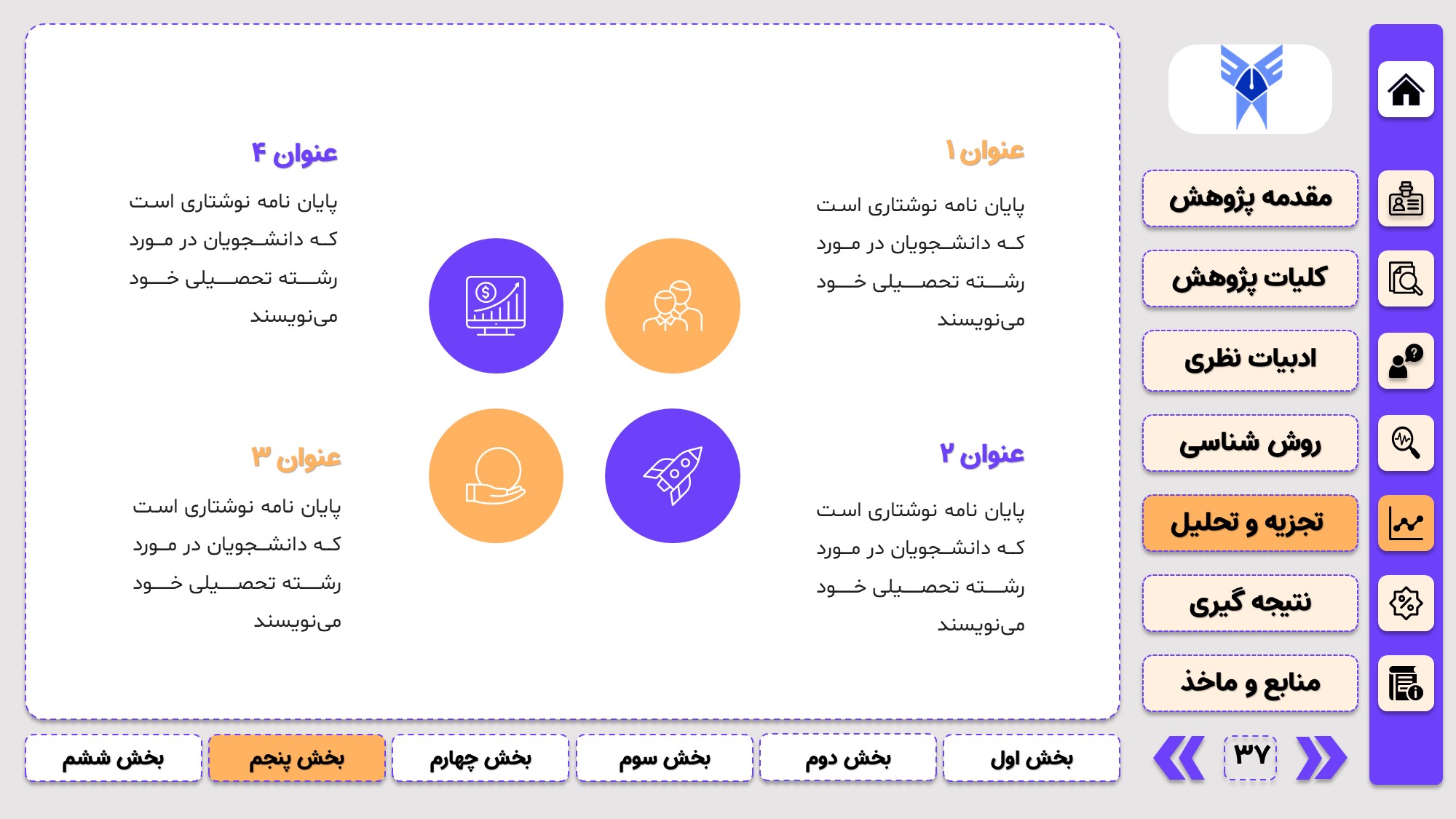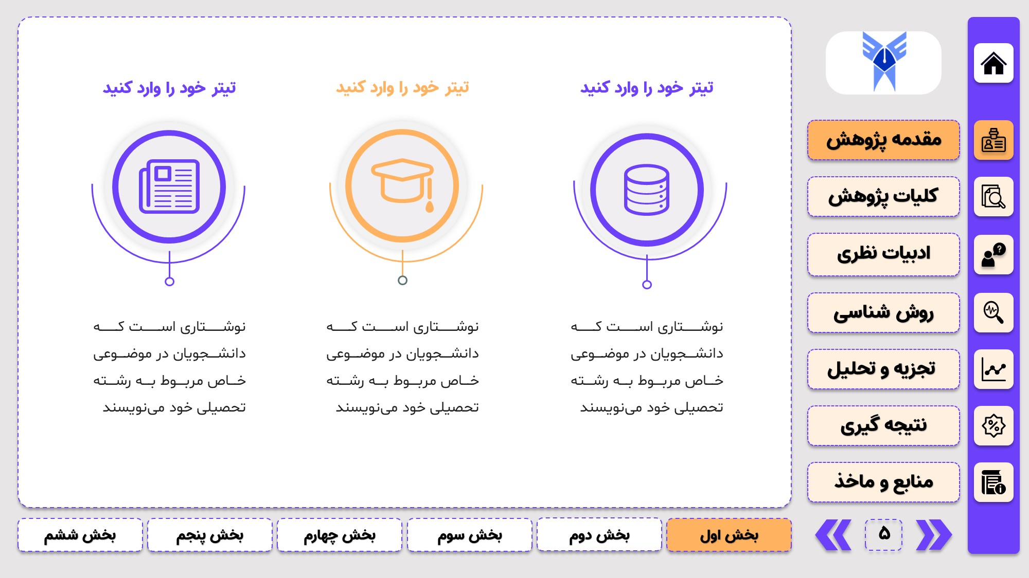 طراحی به صورت دو منو: در طراحی این پاورپوینت از یک منوی عمودی و یک منوی افقی استفاده شده که باعث بخش بندی راحت ارائه پاورپوینت پایان نامه میشود.