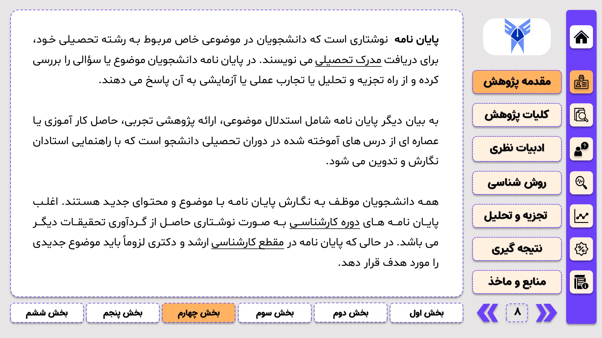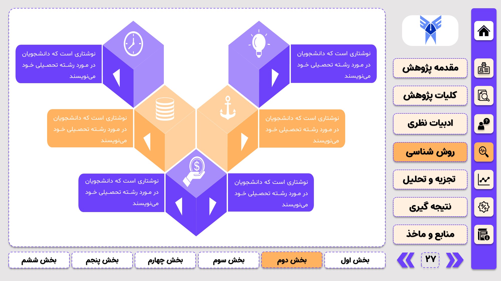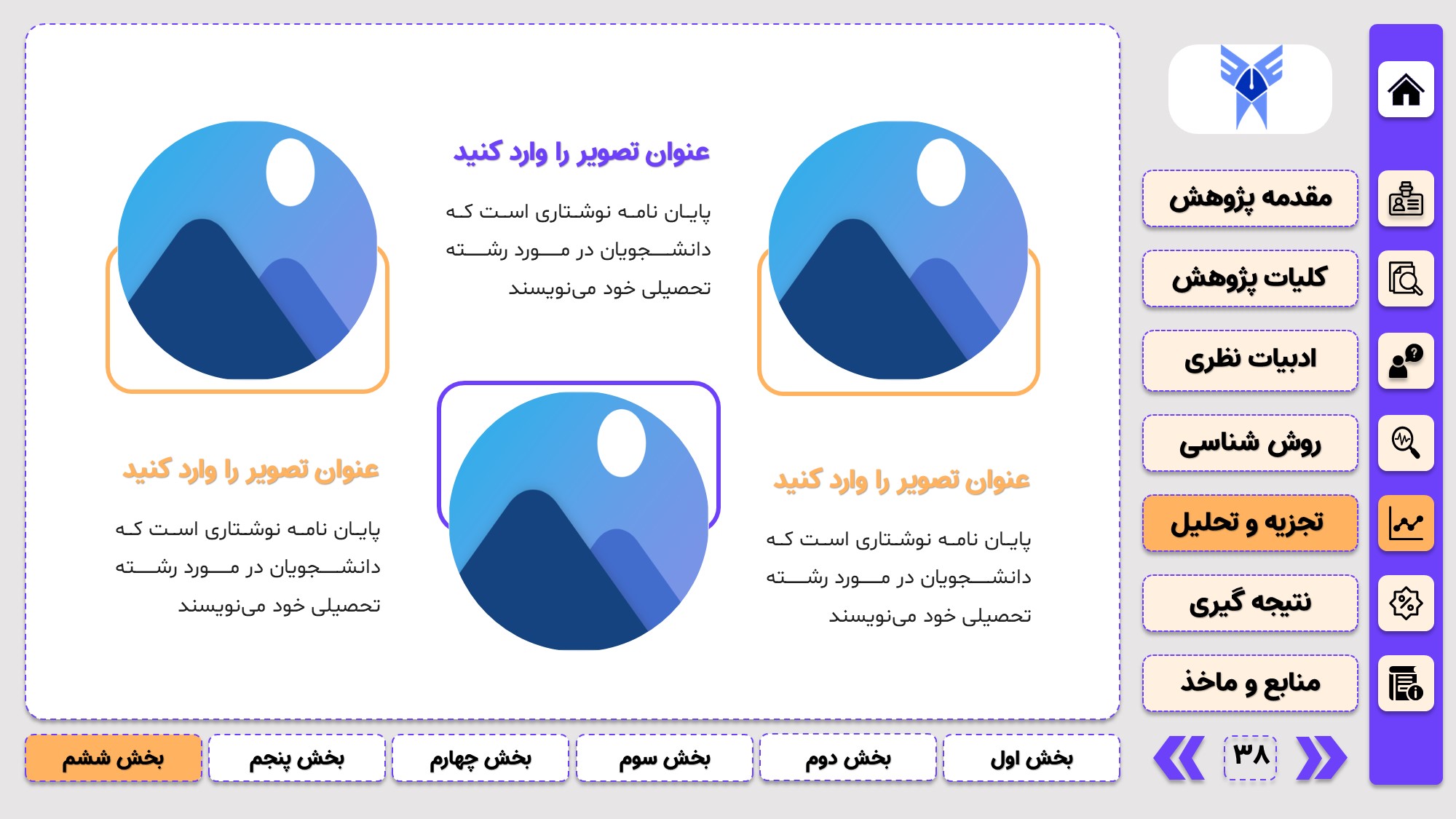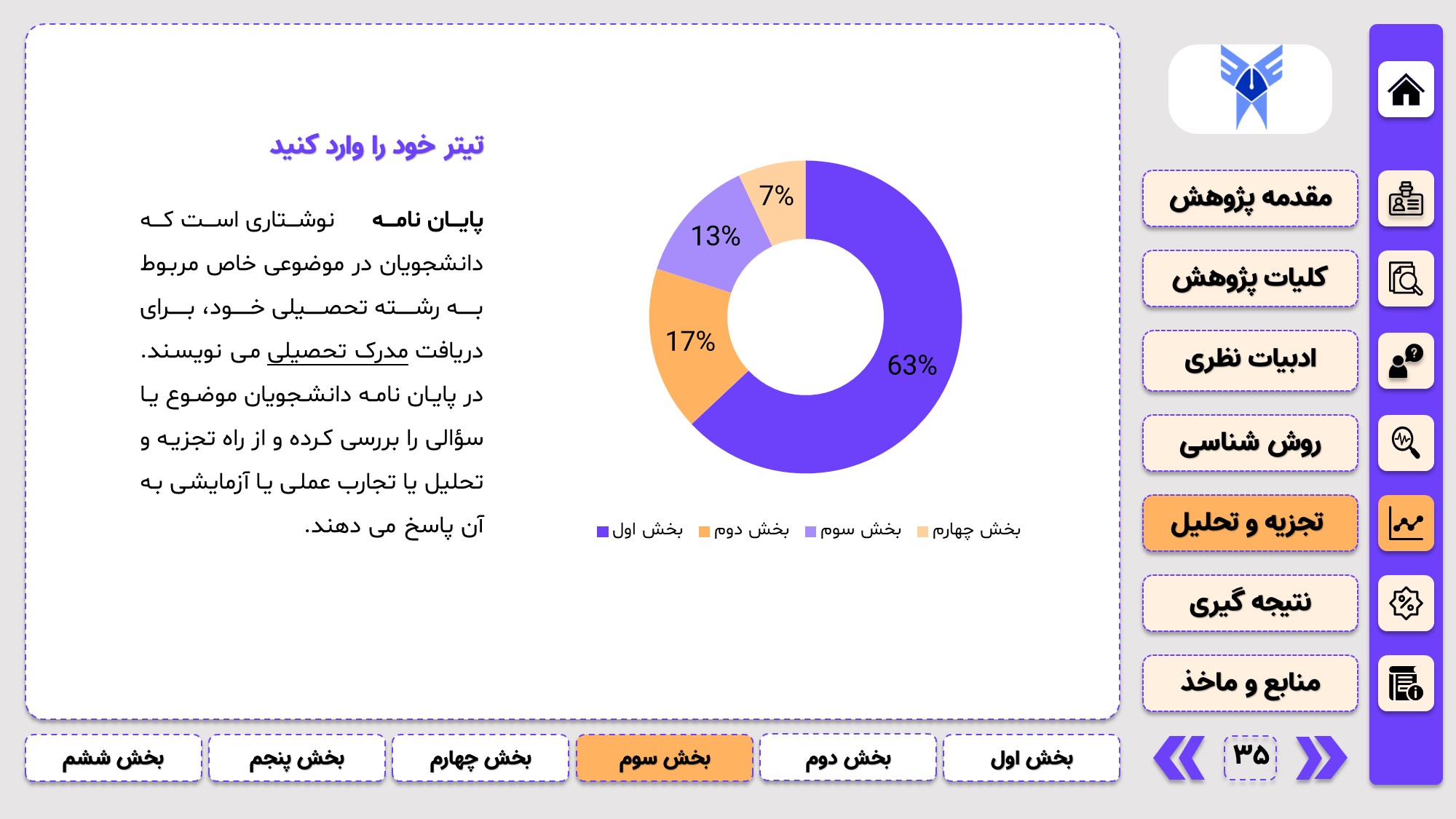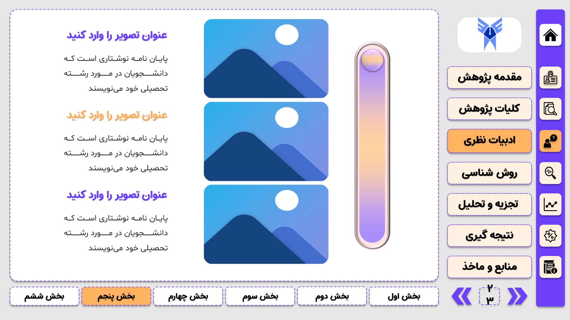 طراحی به صورت دو منو: در طراحی این پاورپوینت از یک منوی عمودی و یک منوی افقی استفاده شده که باعث بخش بندی راحت ارائه پاورپوینت پایان نامه میشود.