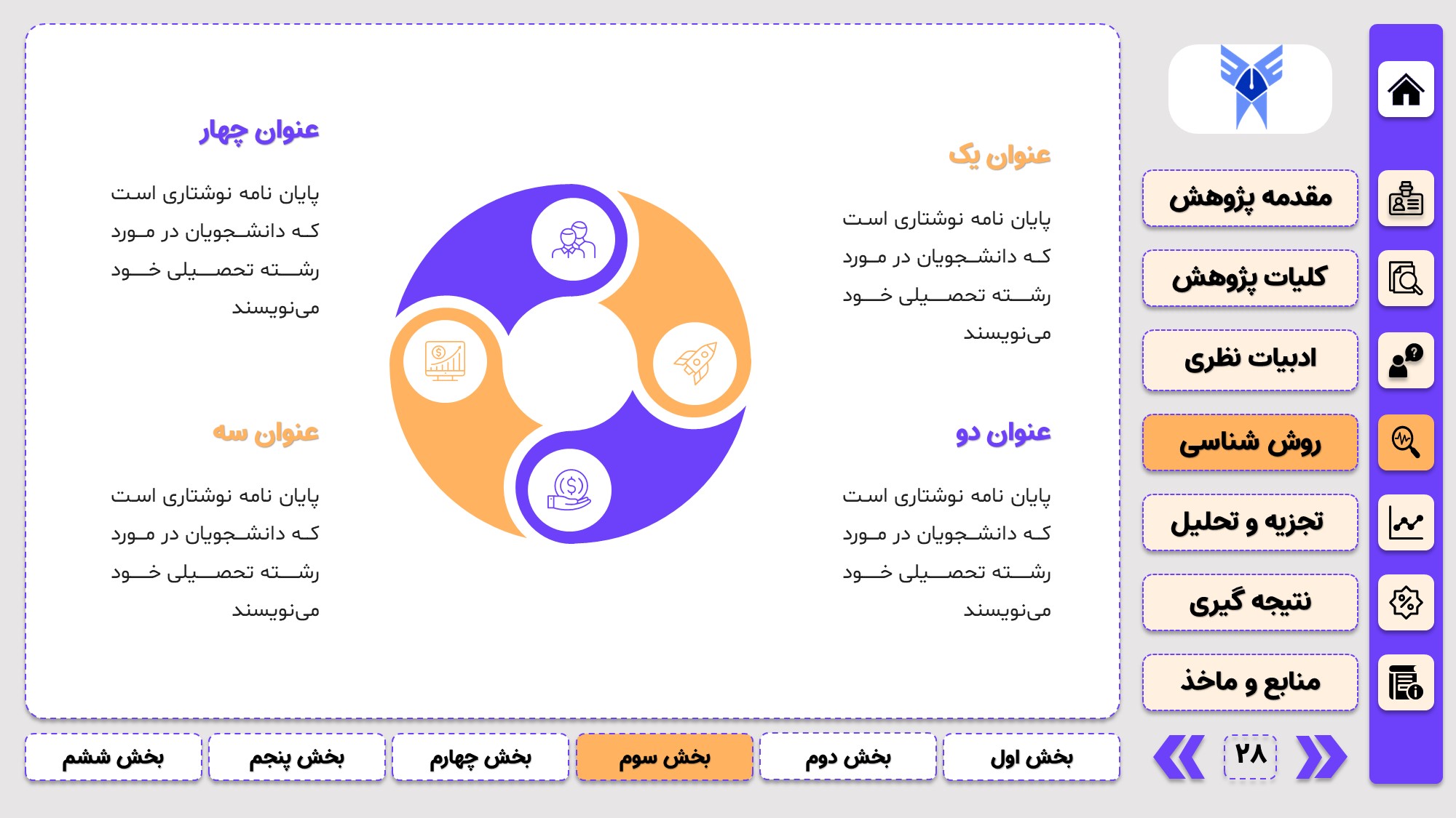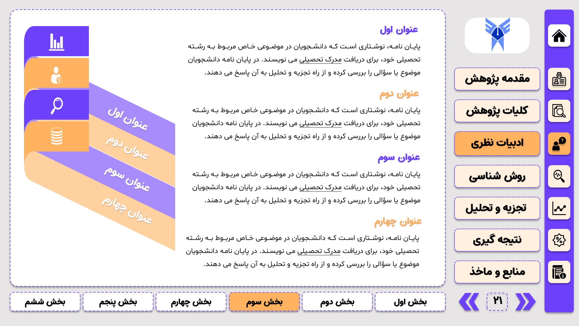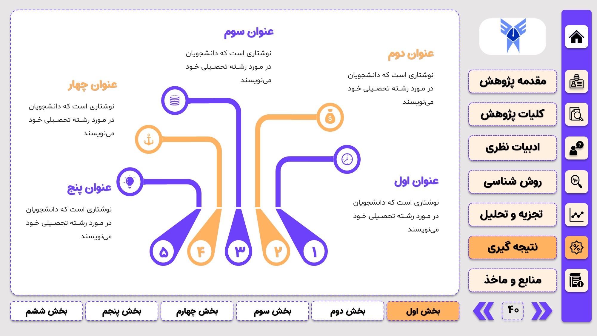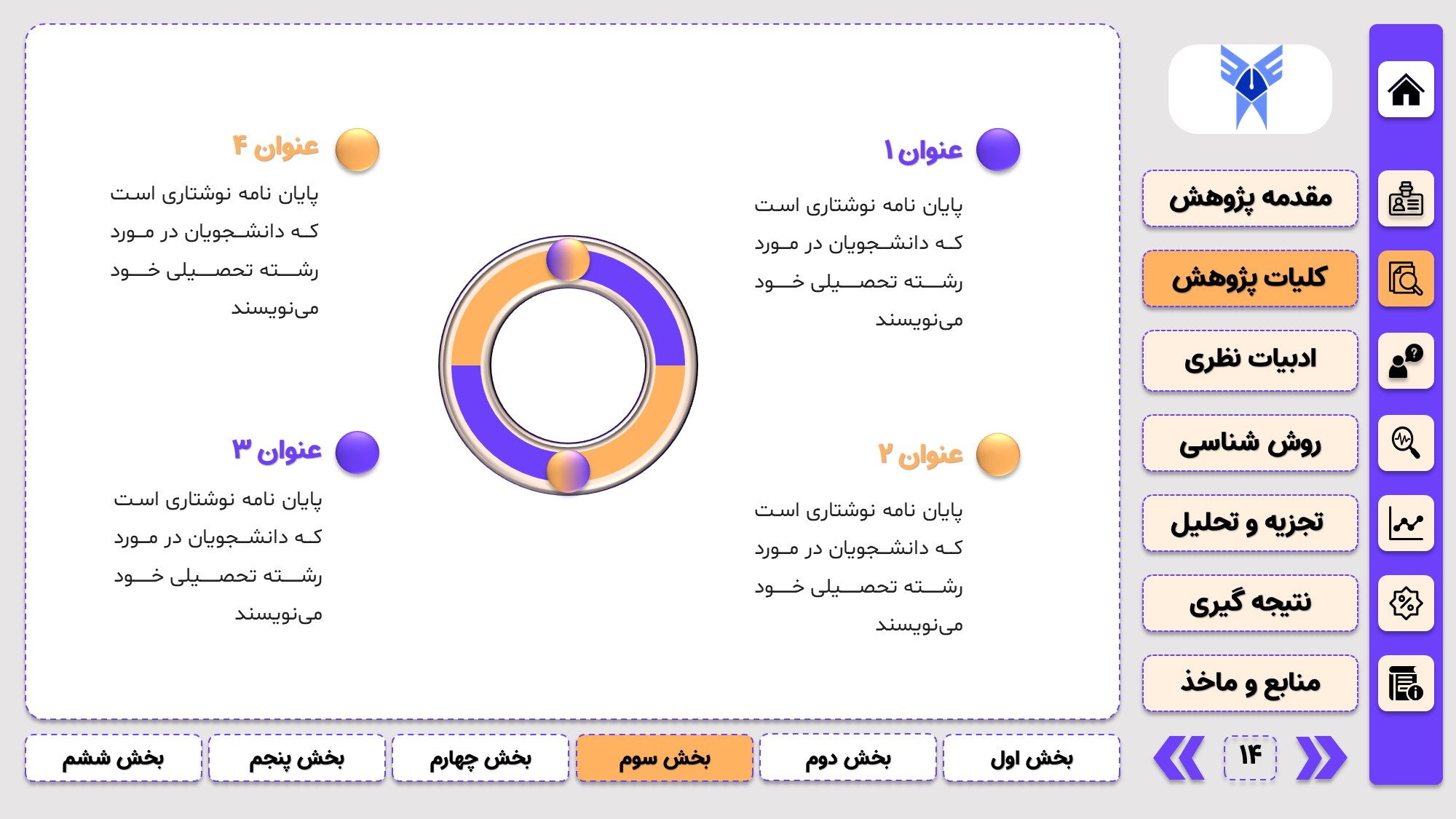مناسب برای جلسات دفاع: با توجه به طرح منودار این قالب، از آن میتوانید در انواع ارائهها، مثل ارائهی دفاع پایان نامه استفاده کنید.