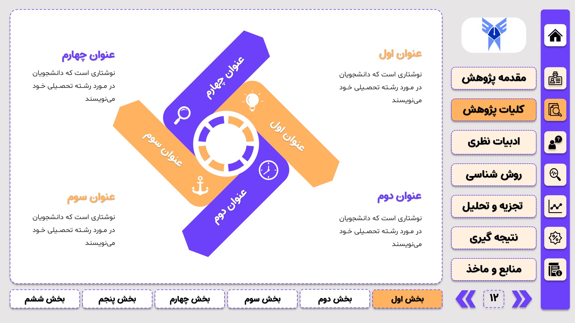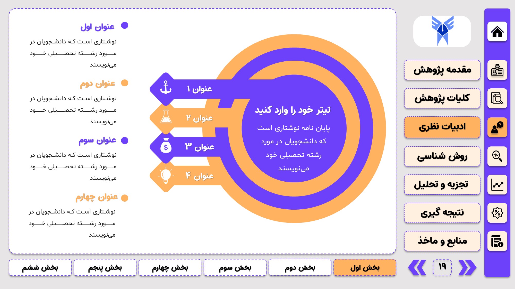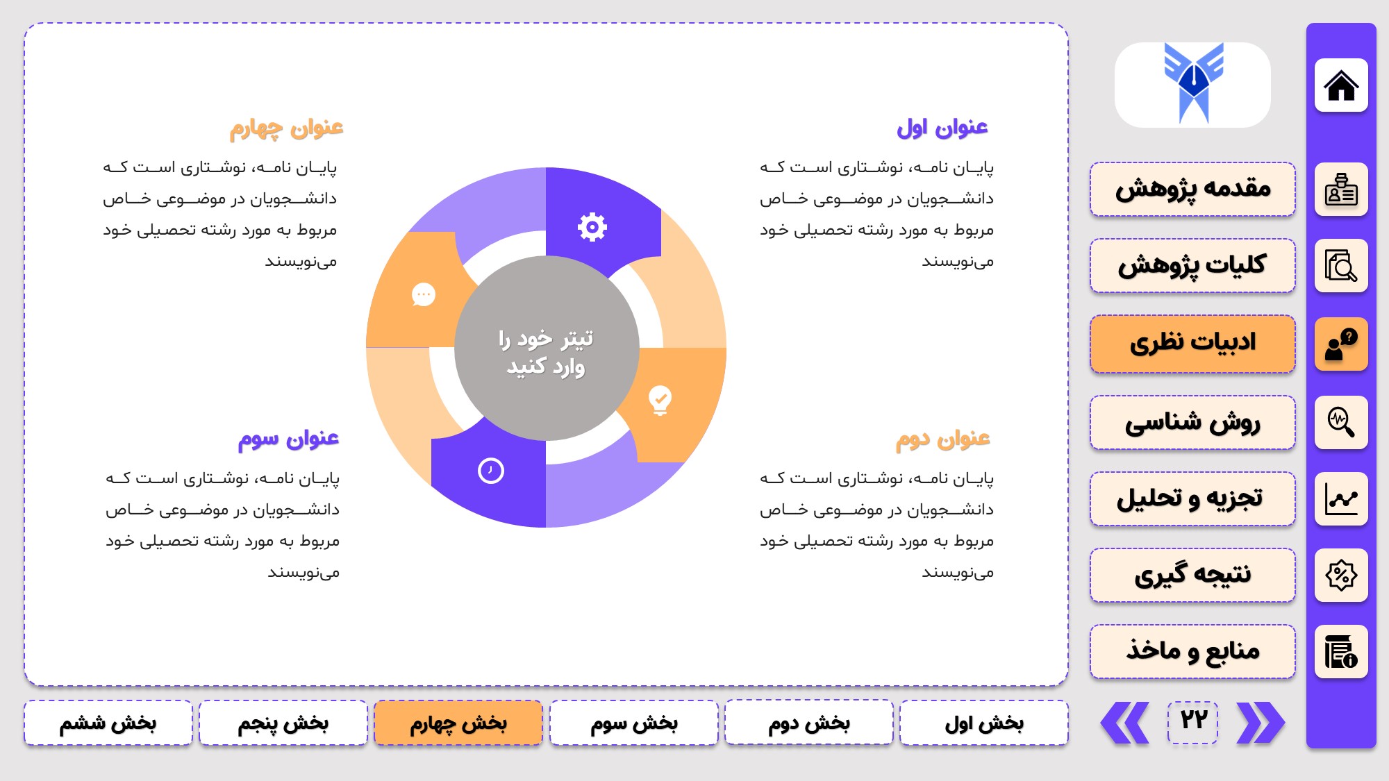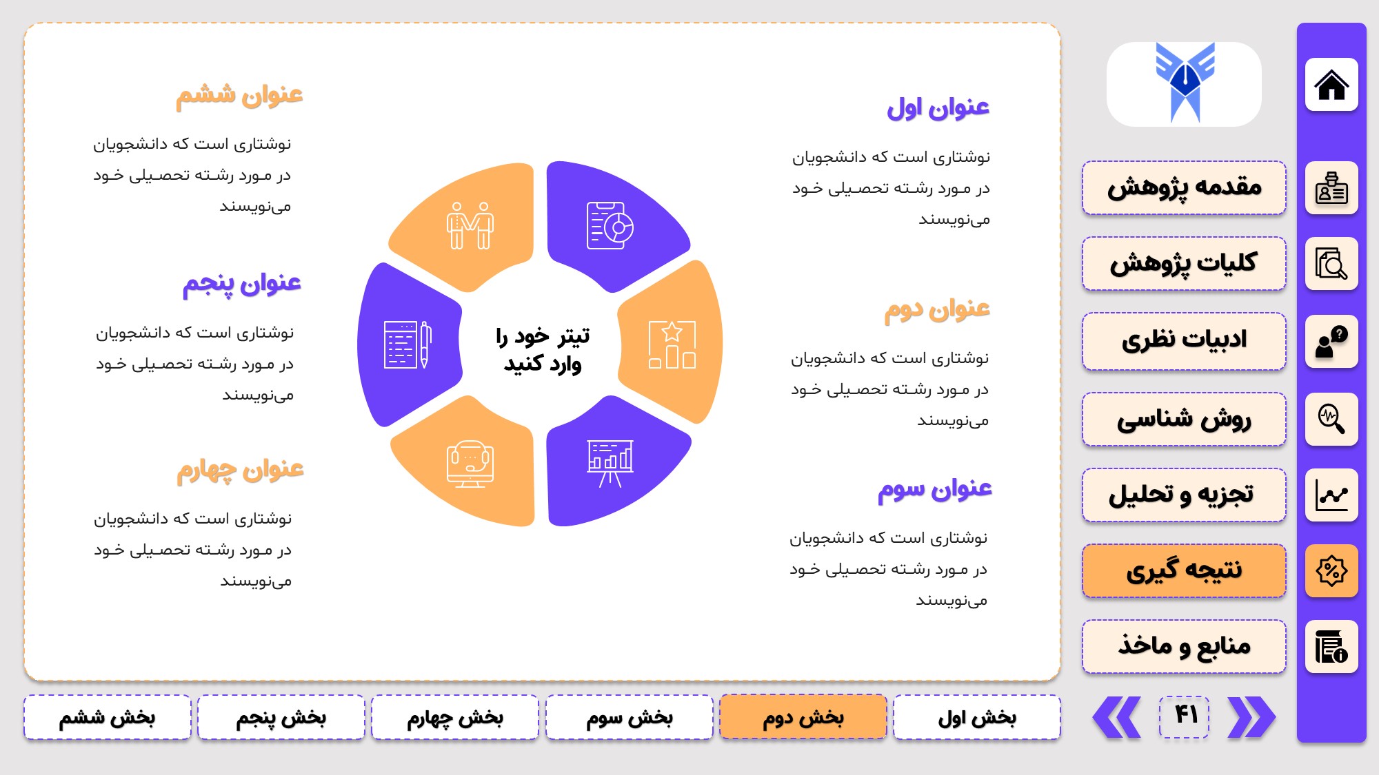 مناسب برای جلسات دفاع: با توجه به طرح منودار این قالب، از آن میتوانید در انواع ارائهها، مثل ارائهی دفاع پایان نامه استفاده کنید.