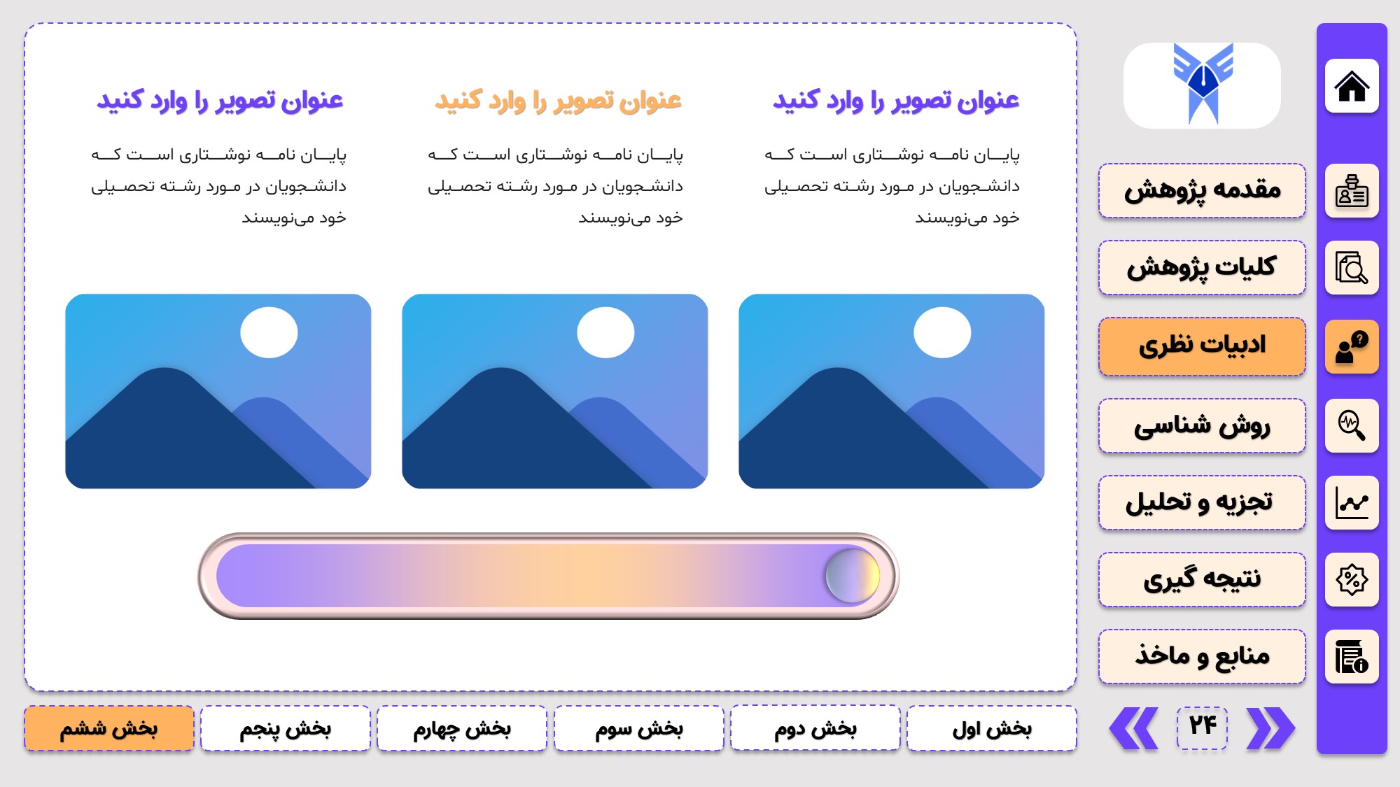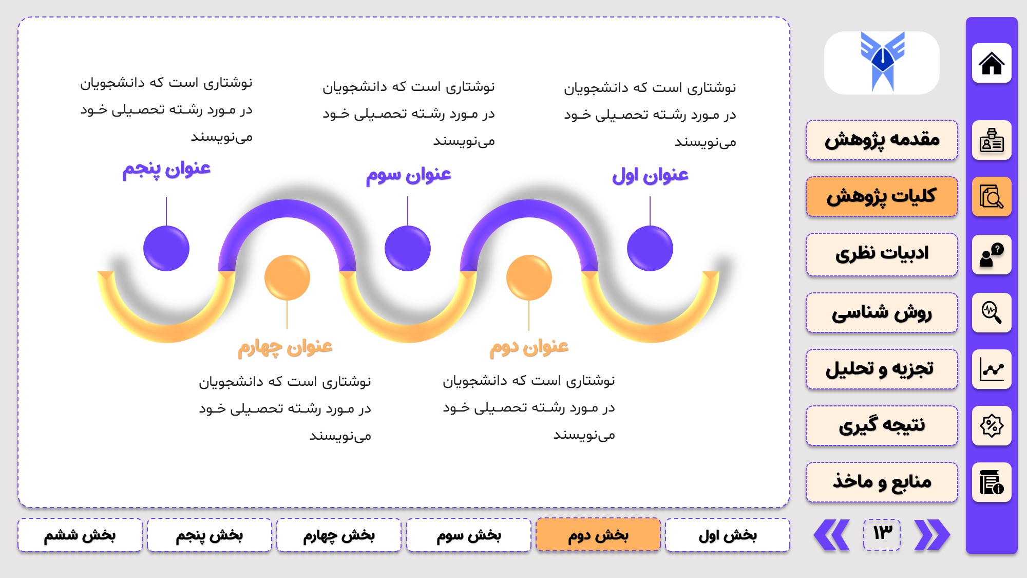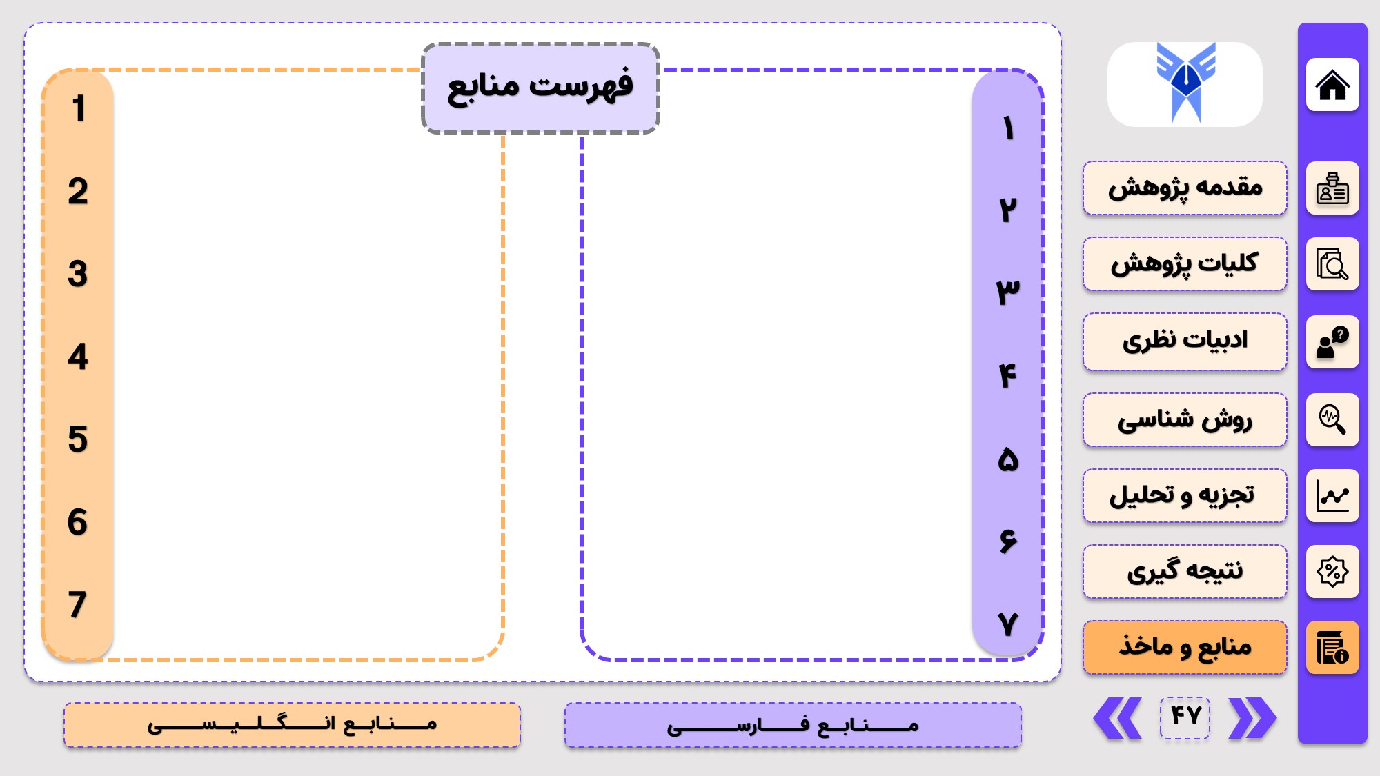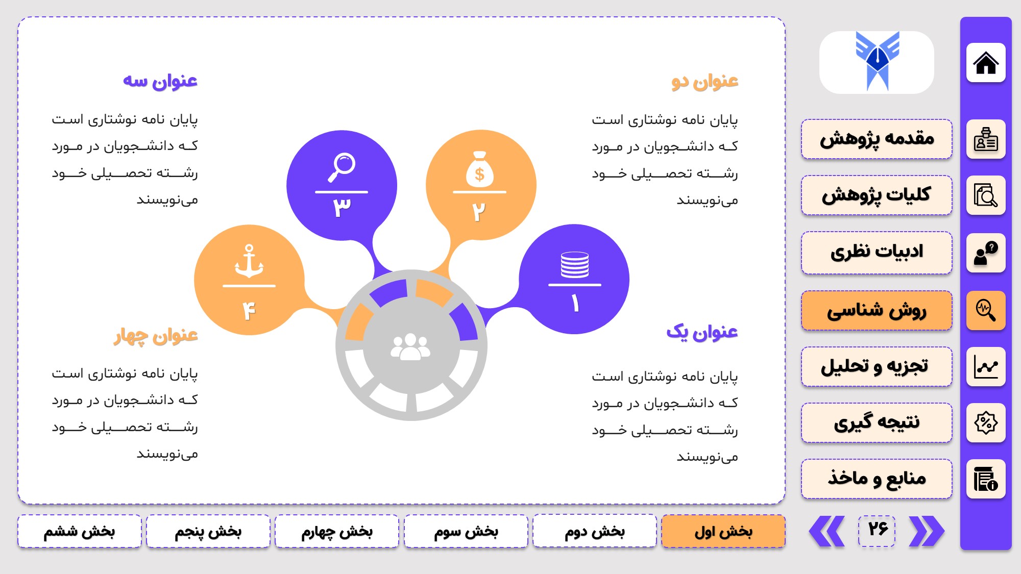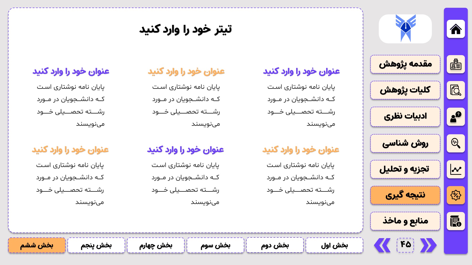 مناسب برای جلسات دفاع: با توجه به طرح منودار این قالب، از آن میتوانید در انواع ارائهها، مثل ارائهی دفاع پایان نامه استفاده کنید.