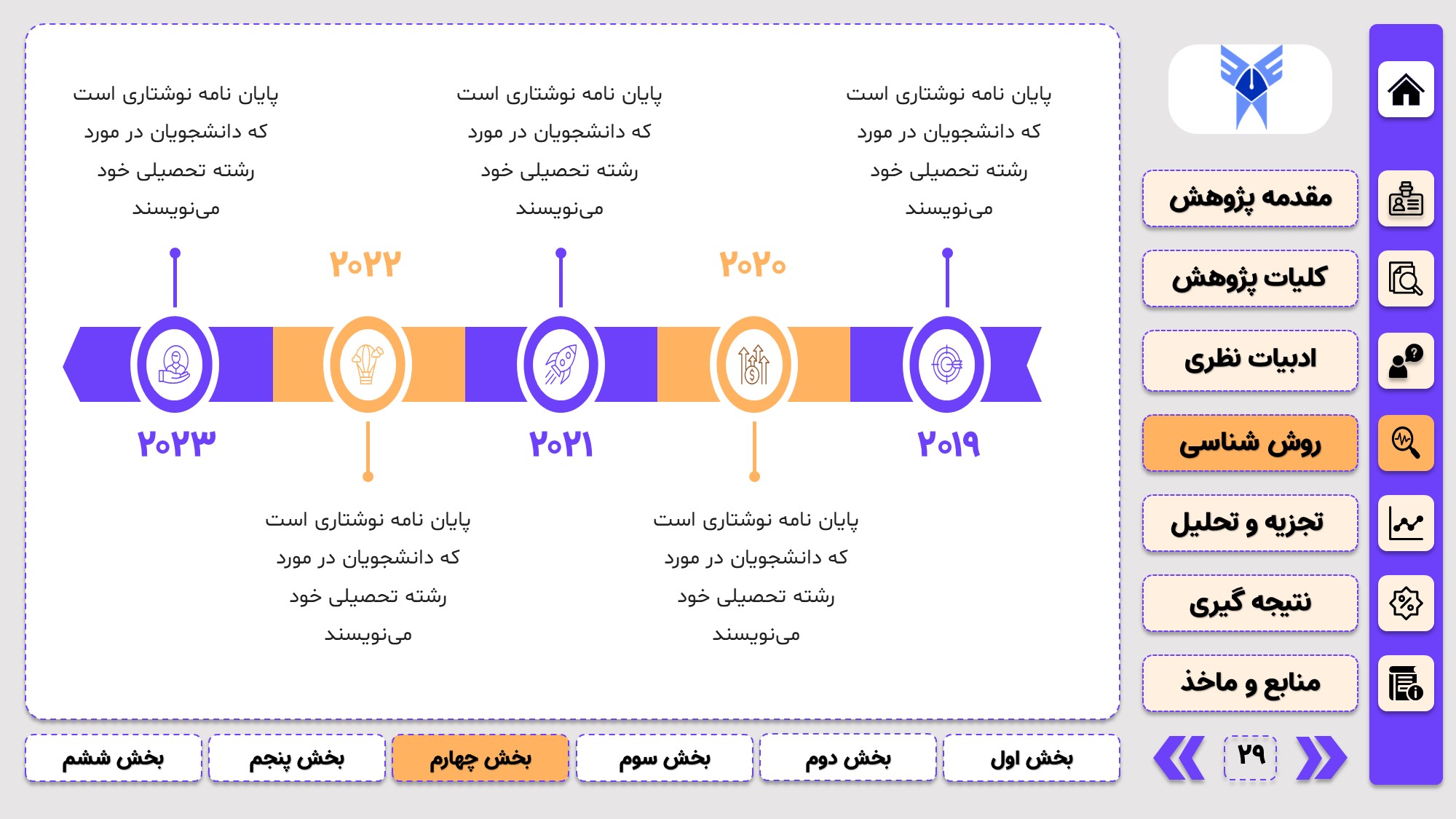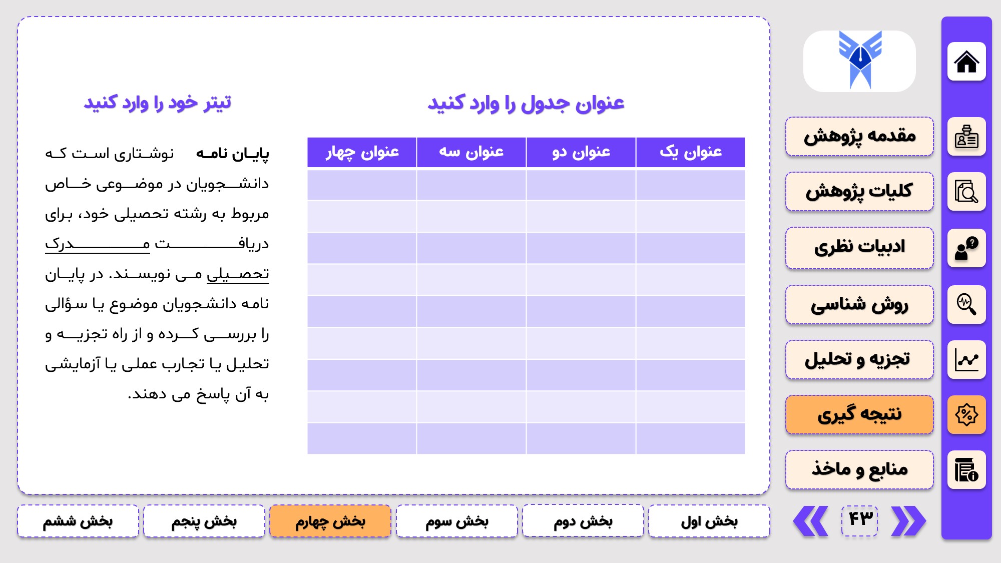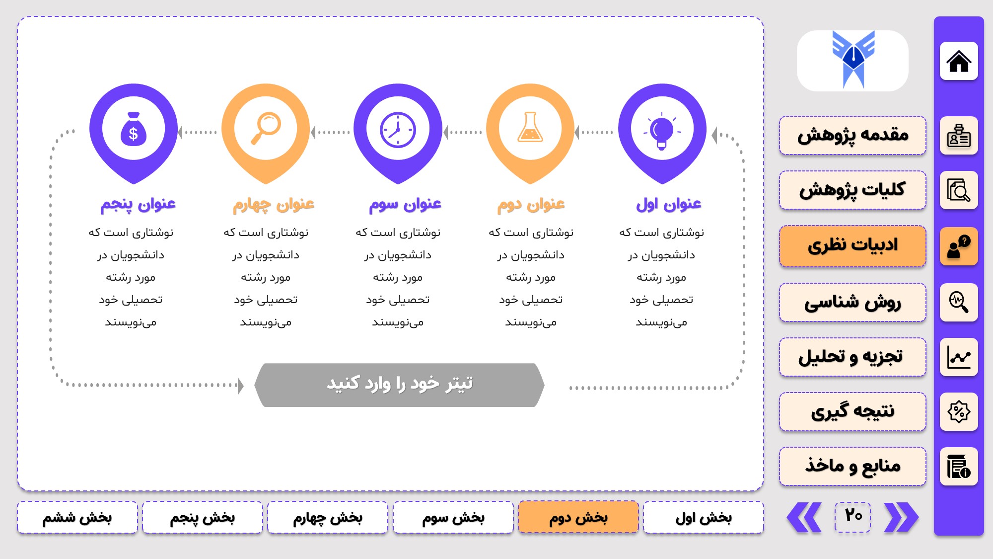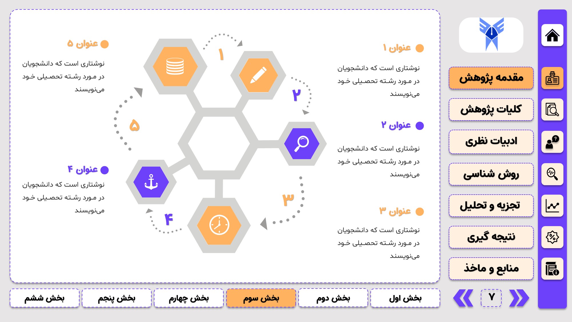 مناسب برای جلسات دفاع: با توجه به طرح منودار این قالب، از آن میتوانید در انواع ارائهها، مثل ارائهی دفاع پایان نامه استفاده کنید.