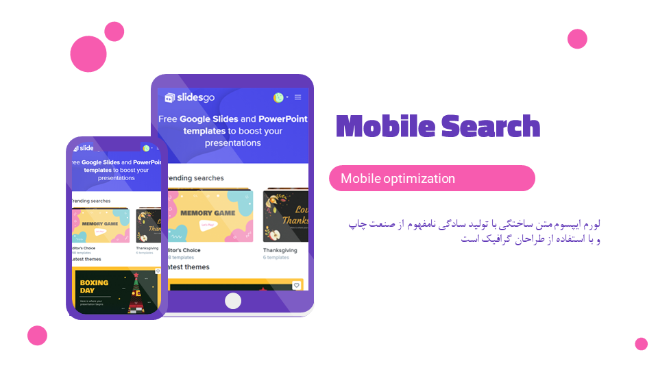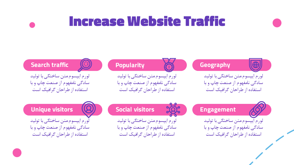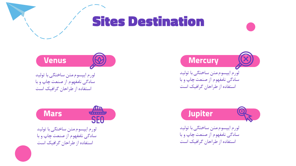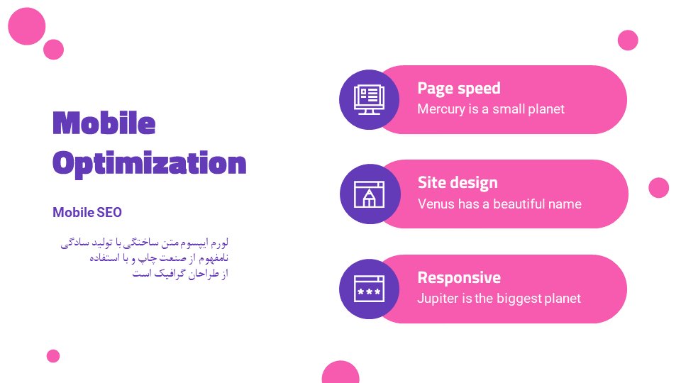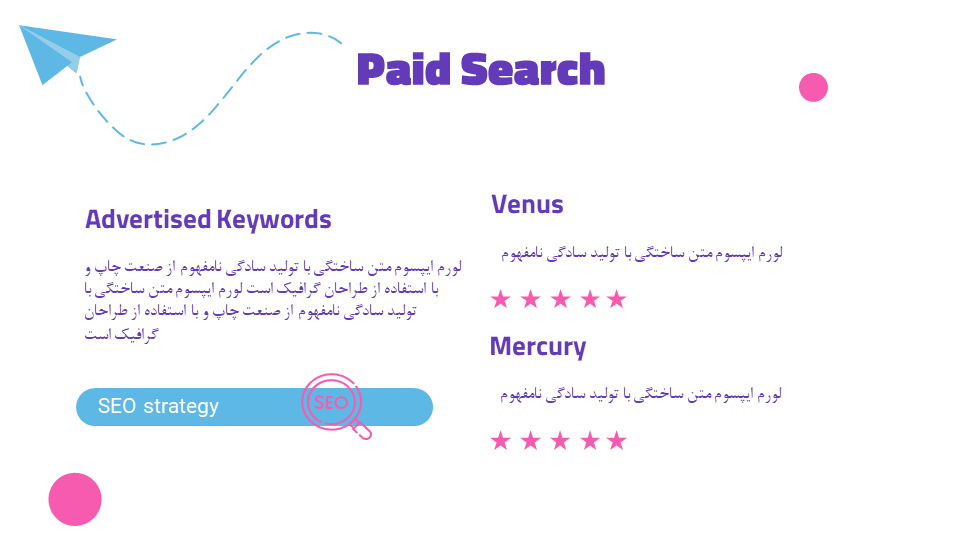 المانهای گرافیکی: دارای اینفوگرافیک درباره استراتژی سئو، اسلاید با طرح سرچ گوگل، اسلایدهای فصلبندی، اسلاید تصویر و اسلاید آیکون سئو و…