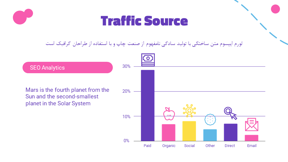 قالب پاورپوینت سئو (SEO) با شماره کد 19 یک تم پاورپوینت رایگان و حرفه ای از سایت ایران پاورپوینت است که در رنگبندی سفید-بنفش طراحی شده است. این تم پاورپوینت فارسی شده از سایت اسلایدگو است و به صورت رایگان در اختیار کاربران سایت ایران پاورپوینت قرار میگیرد.